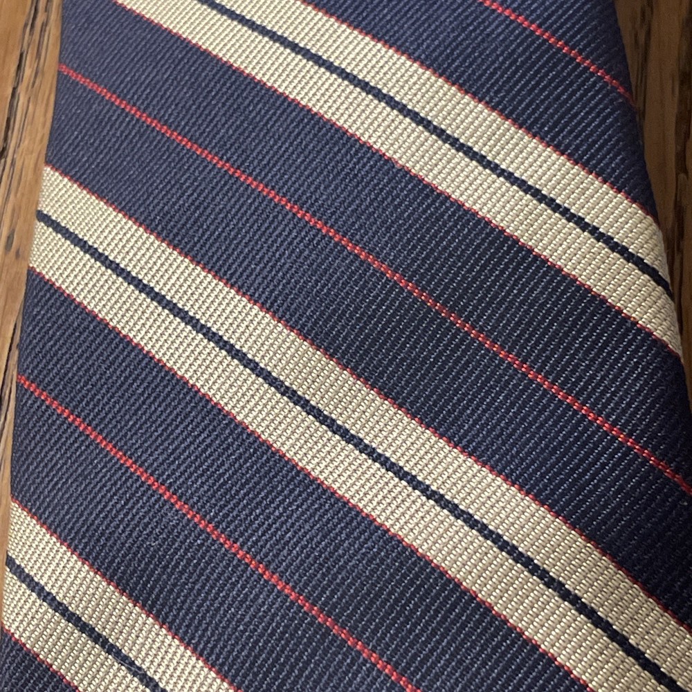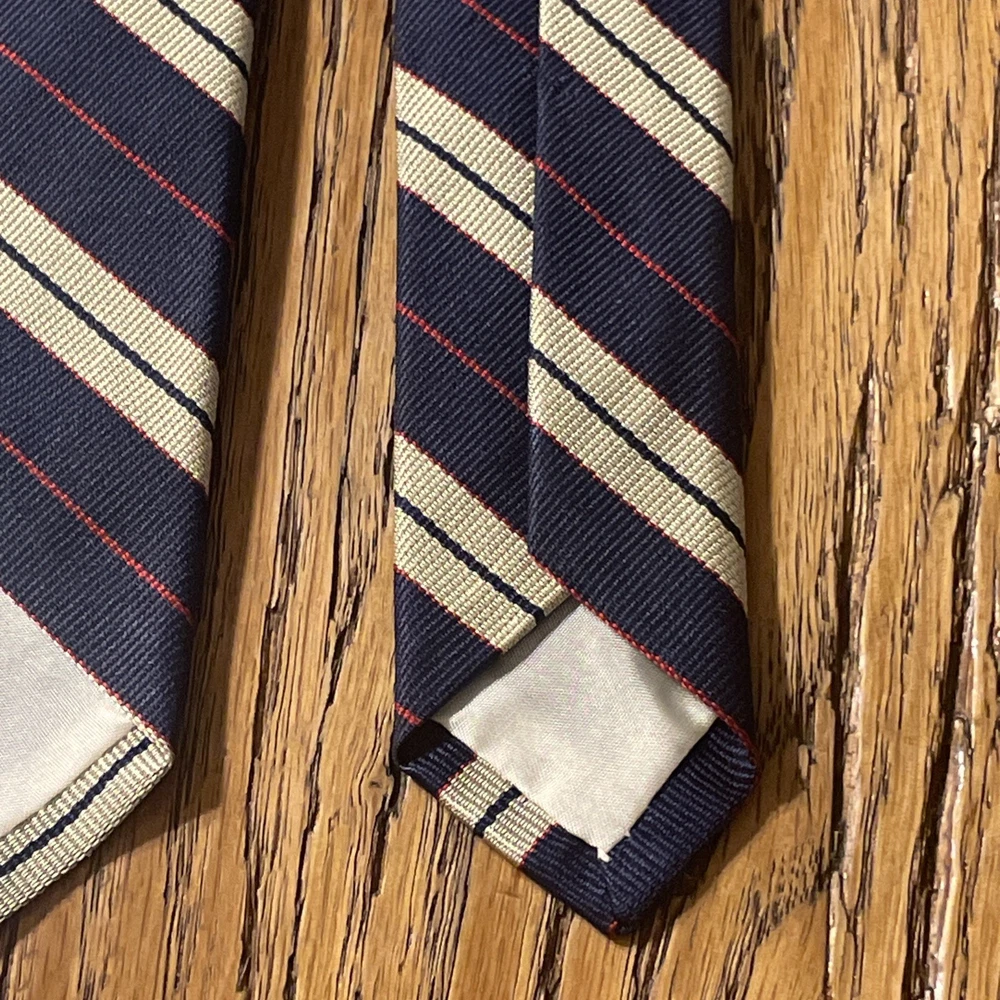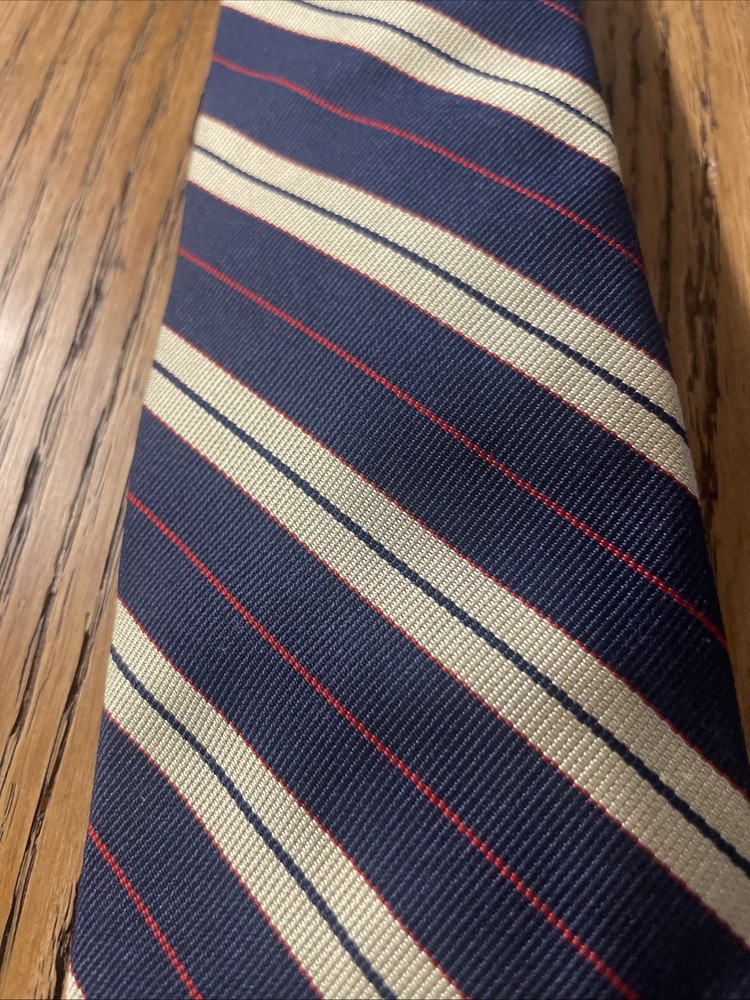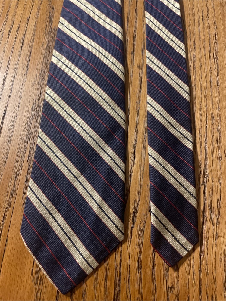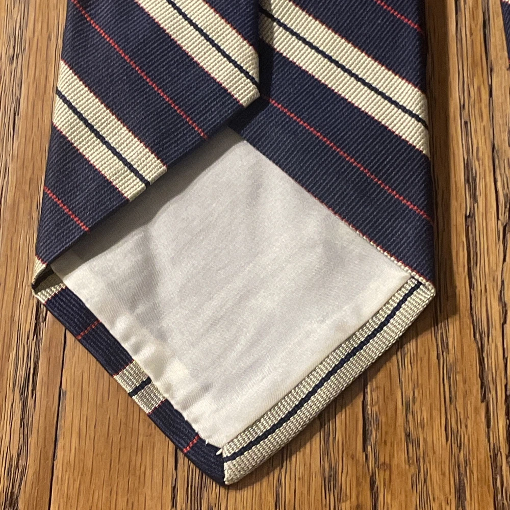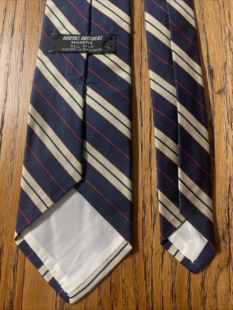 This Vintage Brooks Brothers Repp Silk Regimental Stripe Tie in classic black and white color combination exudes a preppy and sophisticated charm. Made of 100% silk and crafted in the United Kingdom, this tie is a stylish addition to any man's accessory collection. The regimental stripe pattern adds a touch of heritage and elegance, perfect for formal occasions or adding a pop of color to a smart-casual look. Vintage in nature, this tie is a timeless piece that captures the essence of classic British style.