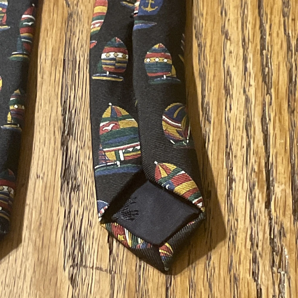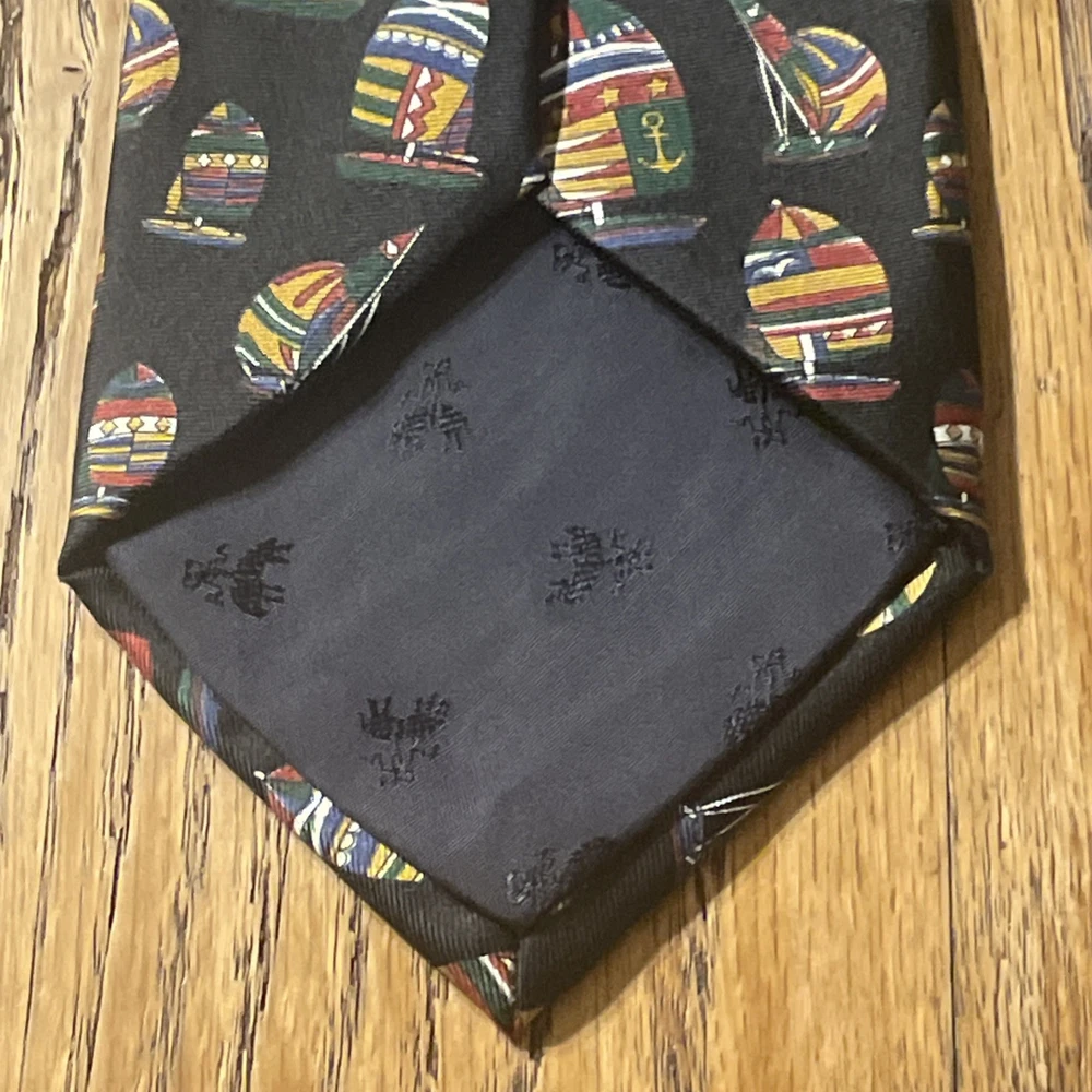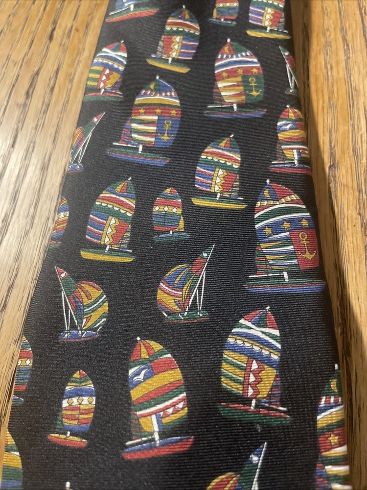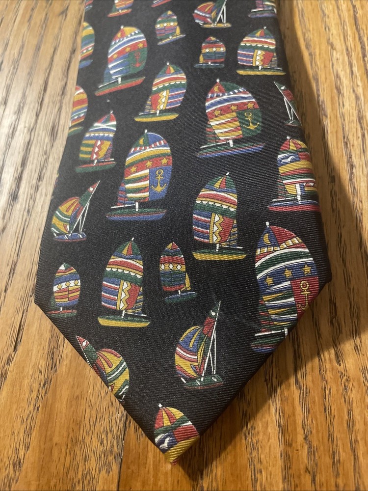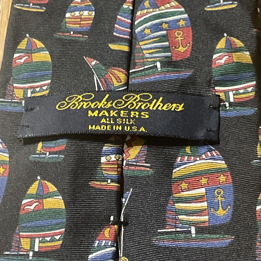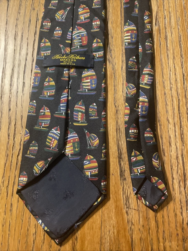 This Vintage Brooks Brothers Silk Tie features a classic sailboats theme, perfect for the preppy man. Made in the USA with 100% silk fabric, this designer tie adds a touch of sophistication to any outfit. The multicolor pattern and classic width make it a timeless accessory for men who appreciate quality and style.