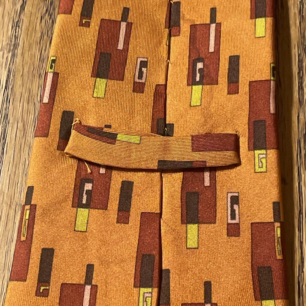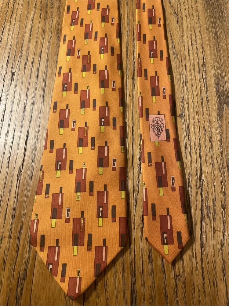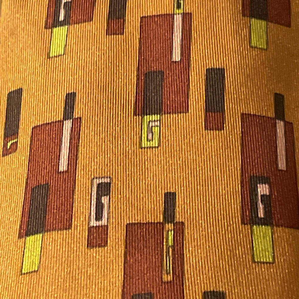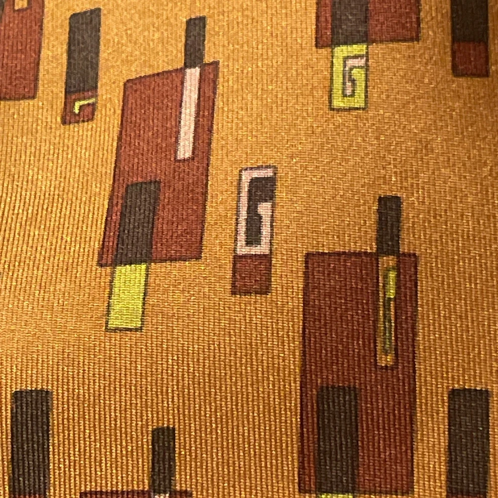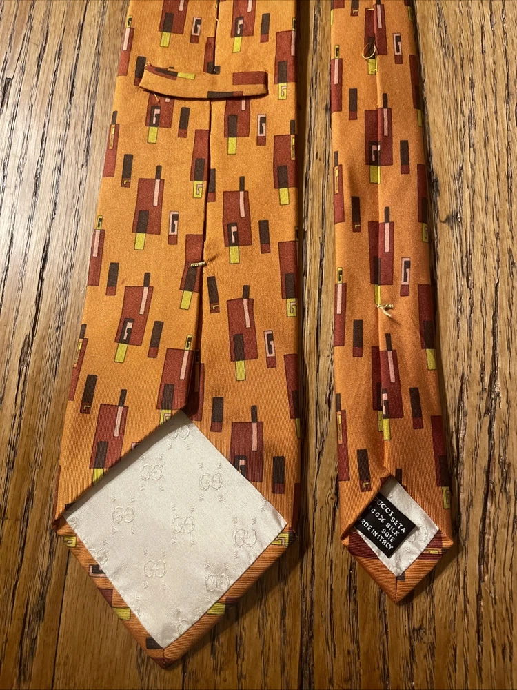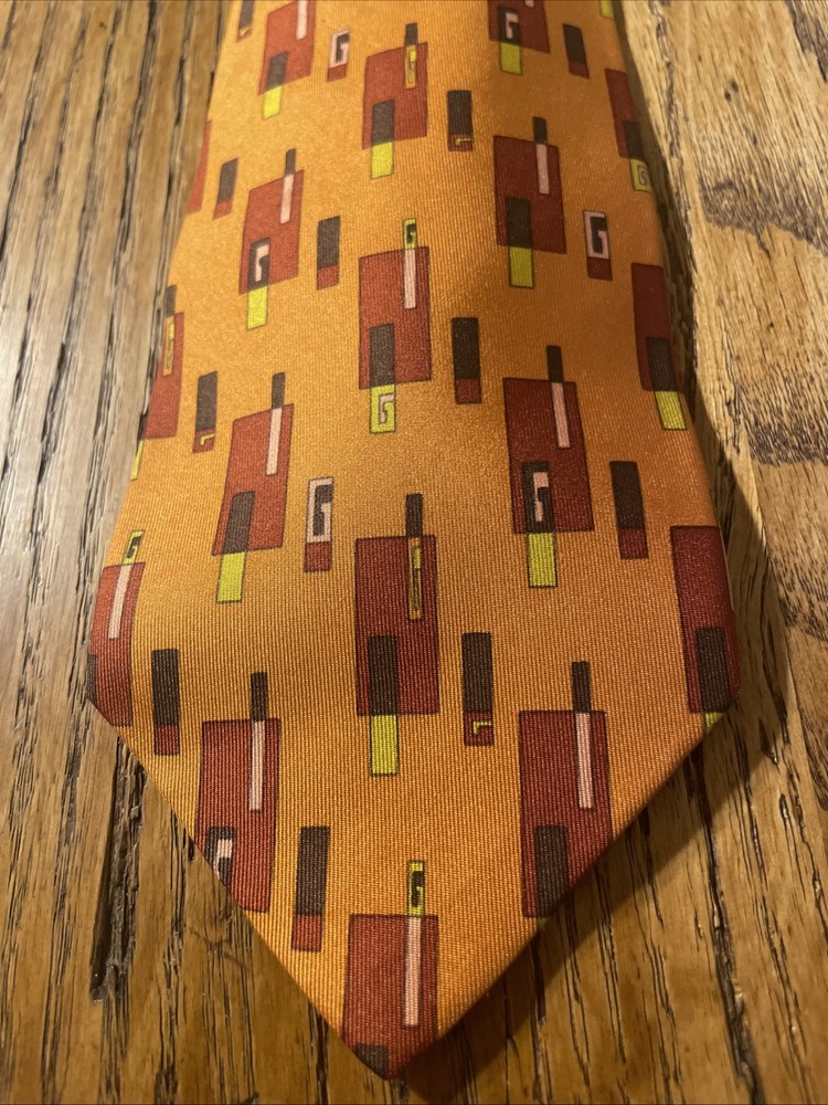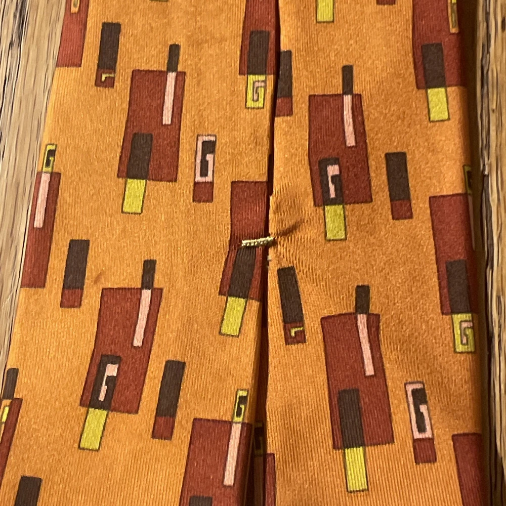 This vintage Gucci tie features a unique geometric pop art G logo design, made in Italy from 100% silk satin fabric. The multicolor tie is classic in width, adding a touch of designer style to any man's accessory collection. Perfect for those who appreciate high-end fashion and timeless pieces from a renowned brand like Gucci.