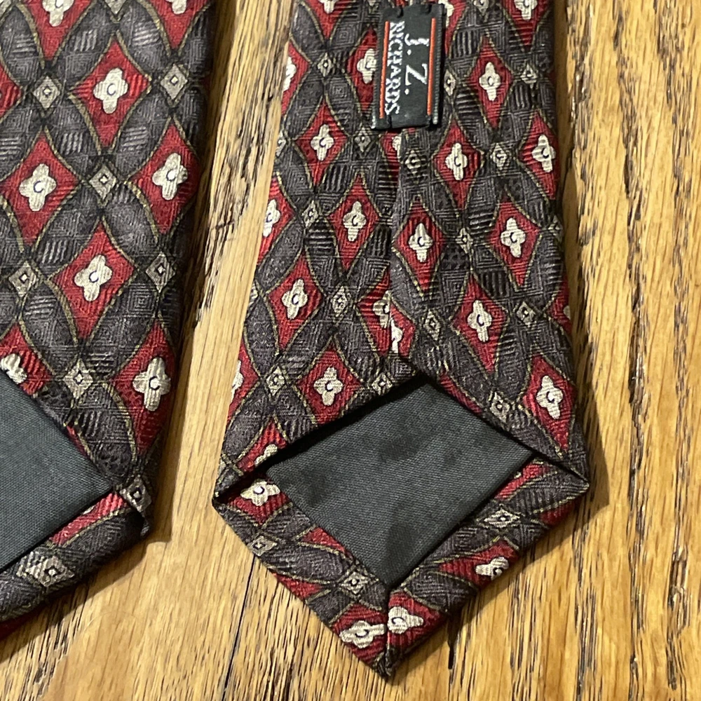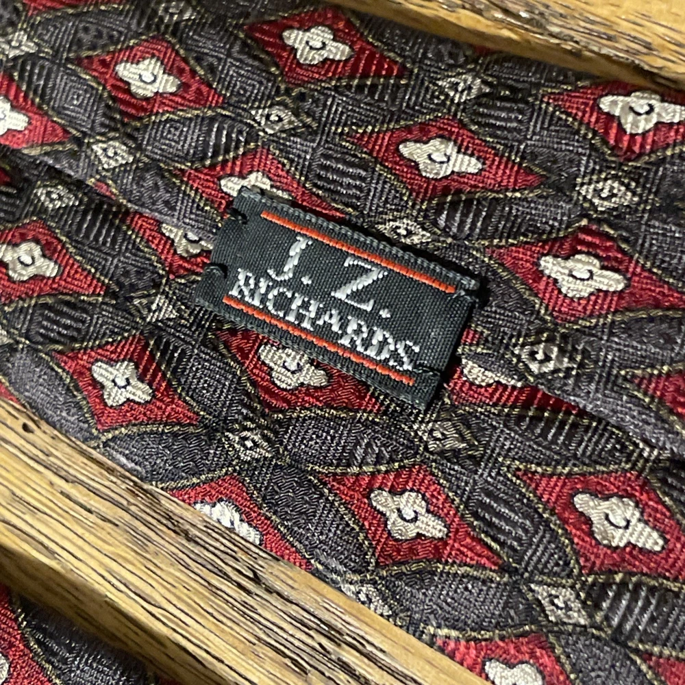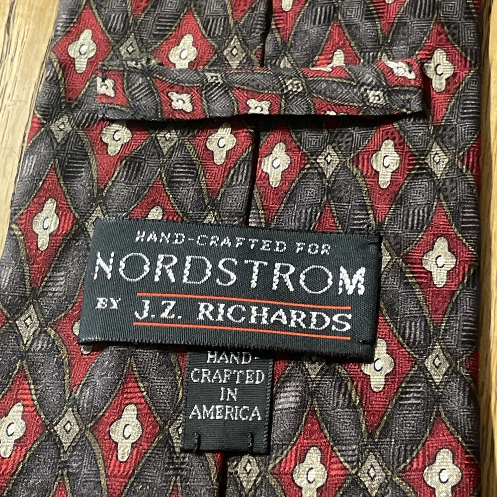 The Vintage EUC J.Z. Richards For Nordstrom USA Hand Made Silk Tie Necktie is a classic and stylish accessory for men. Made from 100% silk satin, this multicolor geometric pattern tie exudes a preppy designer style. With its vintage charm and American craftsmanship, this tie is sure to make a statement and add a touch of sophistication to any outfit.