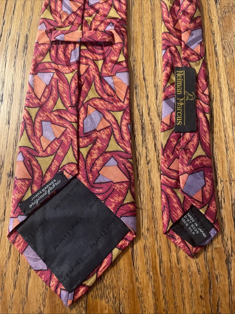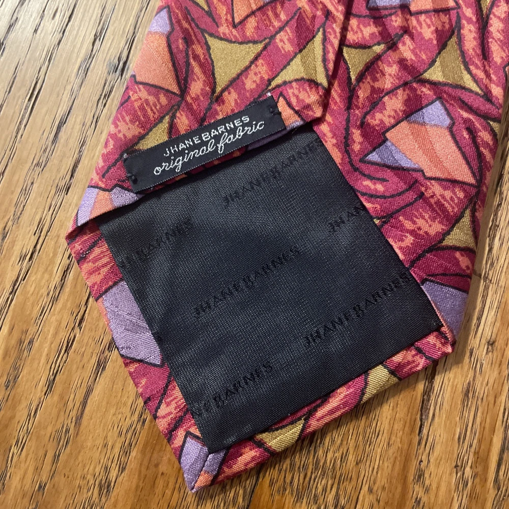 Crafted with the discerning gentleman in mind, this Jhane Barnes necktie marries classic style with a modern twist. The abstract geometric pattern boasts a vibrant multicolor palette that adds a dash of sophistication to any ensemble. Made in Japan, the tie is a testament to exquisite craftsmanship, featuring a classic width that ensures a timeless knot. The luxurious 100% silk fabric offers a smooth, impeccable knot every time, while the designer style embodies preppy elegance. Suitable for a variety of occasions, this tie effortlessly elevates your wardrobe, making it a versatile addition for the style-conscious individual.