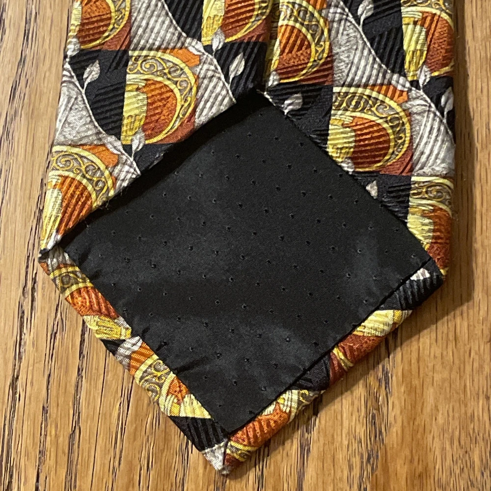 The Vintage EUC Kolte Geometric Baroque Silk Tie is a designer accessory for men, hand-made in Italy from 100% satin silk. The tie features a classic width with a multicolor Baroque geometric pattern, perfect for adding a touch of preppy charm to any formal outfit. This high-quality, vintage piece is sure to make a stylish statement with its unique design and luxurious material.