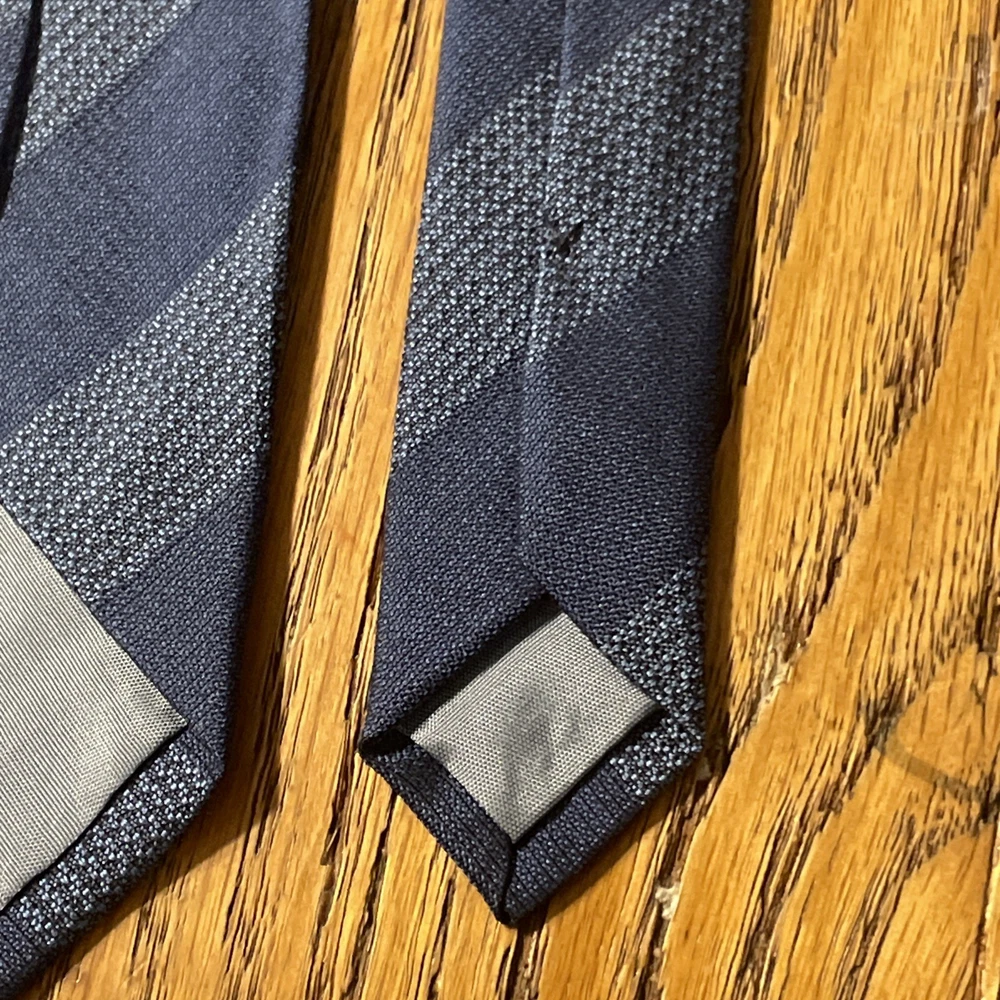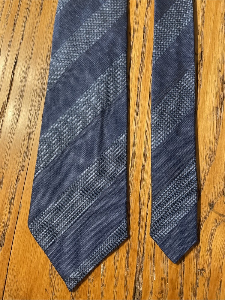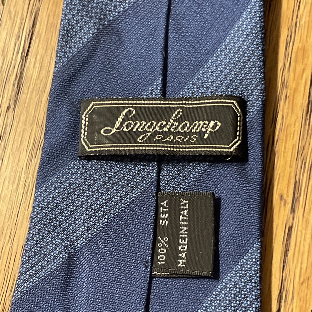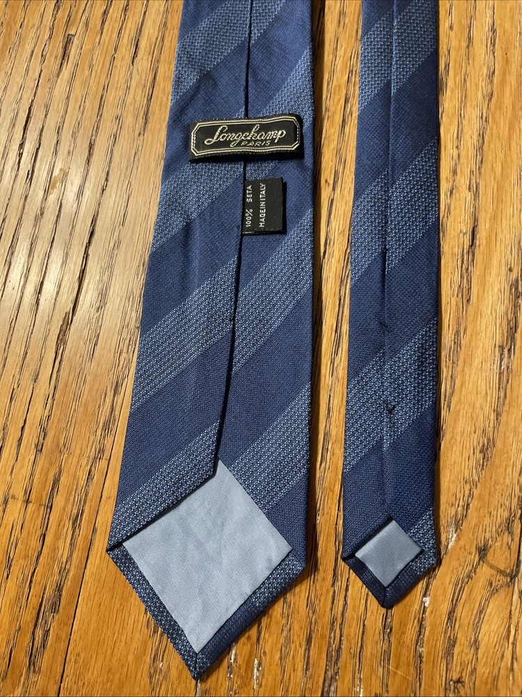 This vintage Longchamp Paris woven striped silk tie necktie is a designer accessory for men, featuring a multicolor striped pattern in a semi-skinny style. Made in Italy from 100% silk fabric, this tie exudes a preppy and sophisticated charm. With its classic design and high-quality materials, this necktie adds a touch of elegance and sophistication to any outfit. Perfect for those who appreciate vintage style and timeless fashion. A few tiny speck marks, see pics. All up at the knot area.
