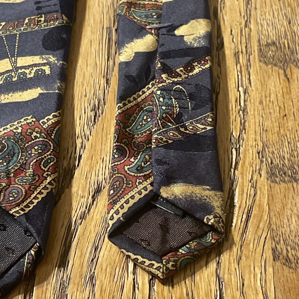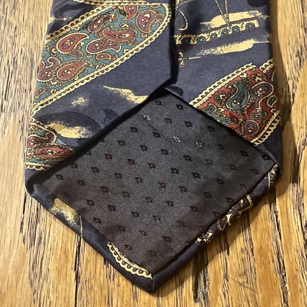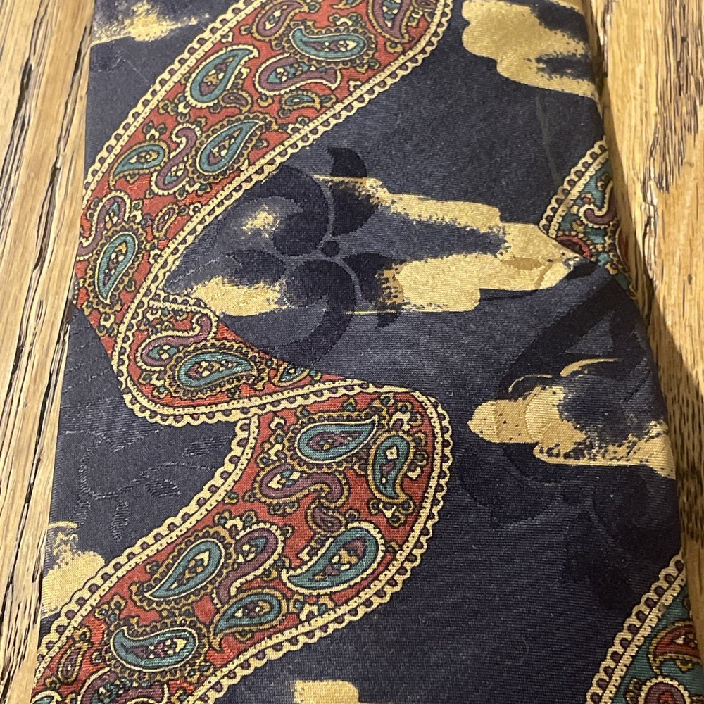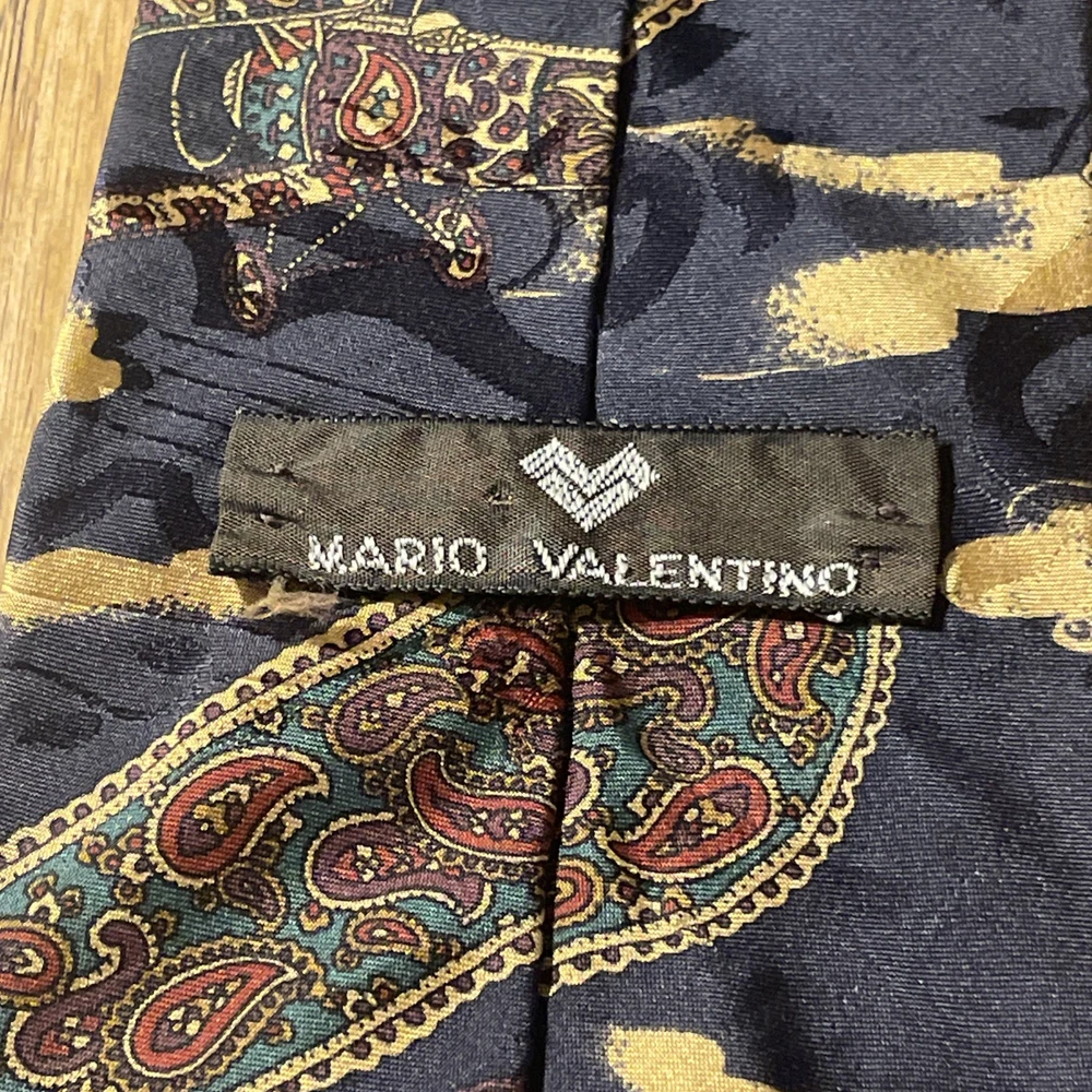 The Vintage EUC Mario Valentino Abstract Paisley Silk Tie Necktie is a high-quality men's accessory made in the USA. This preppy designer tie features a classic width and is crafted from 100% silk satin material. The abstract paisley pattern adds a unique and stylish touch to any formal outfit, making it a versatile and timeless piece for any man's wardrobe. Perfect for adding a touch of vintage flair to a classic look.