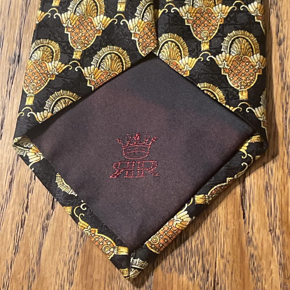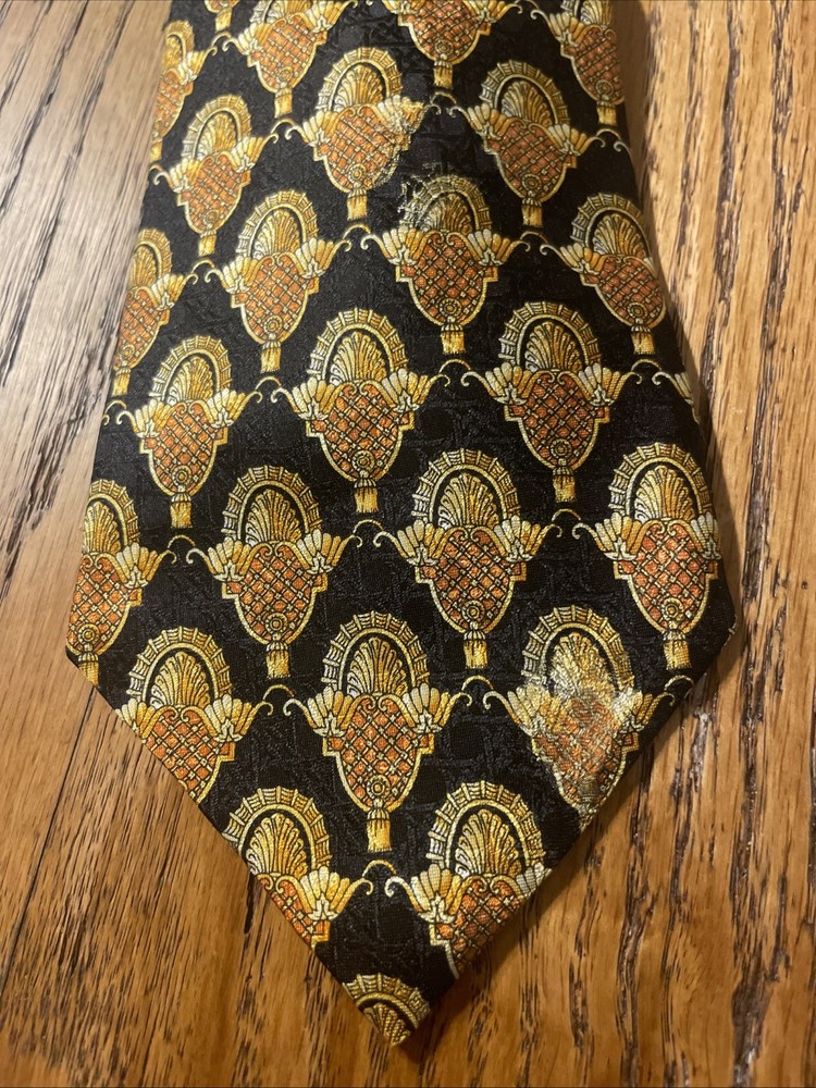 This Vintage EUC Michel Royal Baroque Geometric Silk Tie Necktie is a designer accessory for men, hand-made in Spain by the Richel Royal brand. The multicolor Baroque pattern on 100% silk satin fabric exudes a preppy and sophisticated style. With a classic width, this tie is perfect for adding a touch of vintage elegance to any formal ensemble. Made with quality and attention to detail, this necktie is sure to elevate any outfit with its timeless and intricate design.