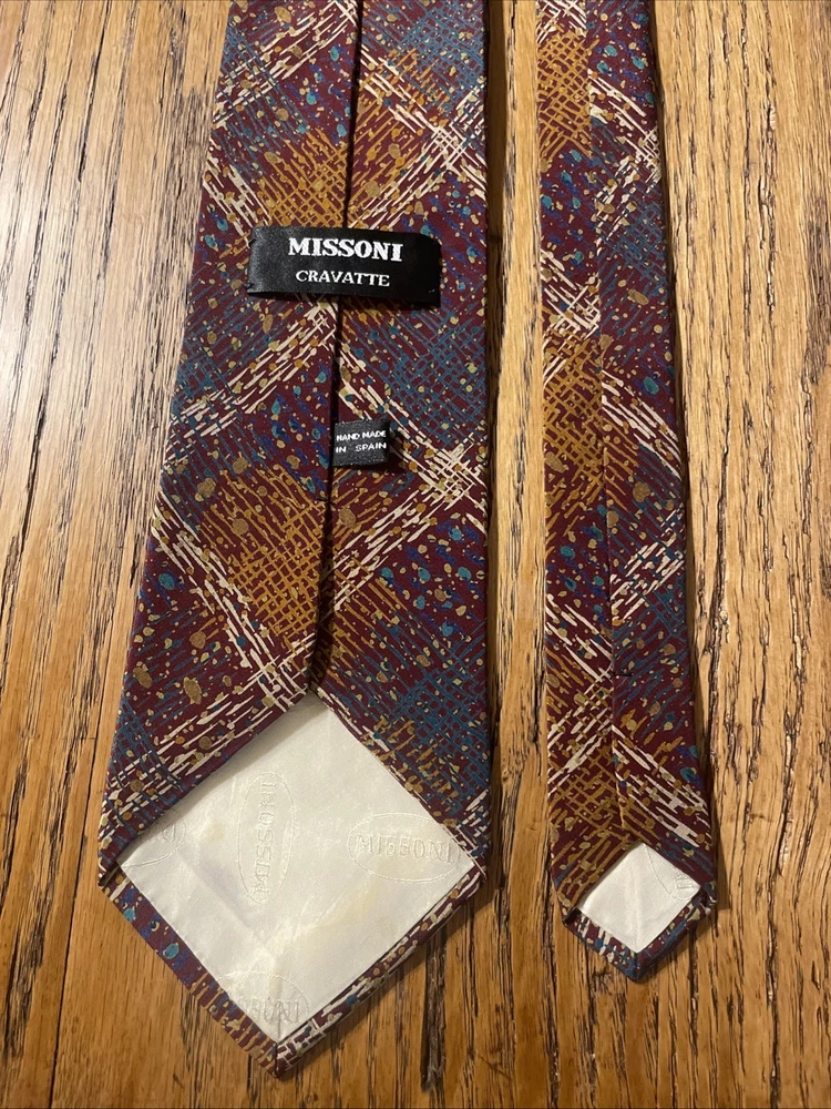 This vintage Missoni abstract splatter silk tie is a stylish men's accessory with a classic and preppy appeal. Made in Spain, the multicolor design features a unique abstract splatter argyle pattern, perfect for adding a touch of designer flair to any outfit. Crafted from 100% silk satin, this classic width tie is a timeless piece that will elevate any formal ensemble.