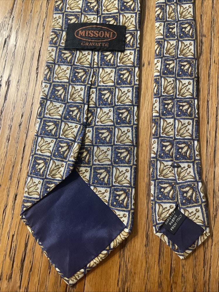 The product is a vintage Missoni Cravatte geometric silk tie, designed for men with a classic and preppy style. Made in Japan, this multicolored tie features a geometric pattern on satin fabric, embodying designer quality and sophistication. Perfect for adding a touch of vintage charm to any formal or professional outfit, this tie is a timeless accessory that showcases quality craftsmanship and a distinctive aesthetic.