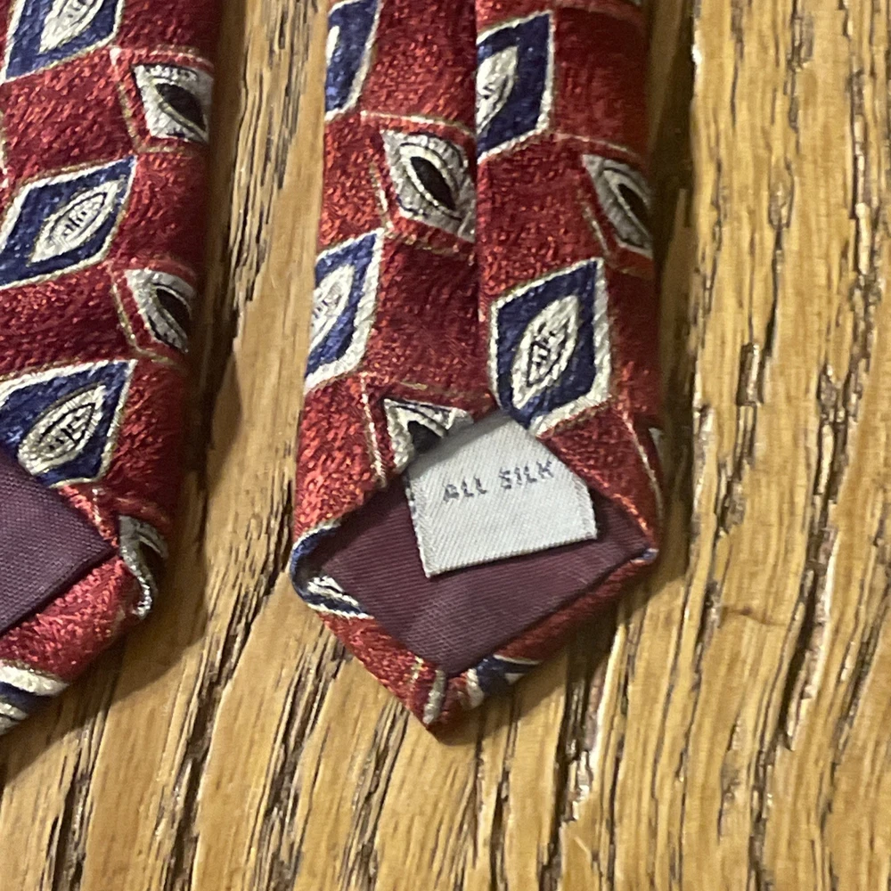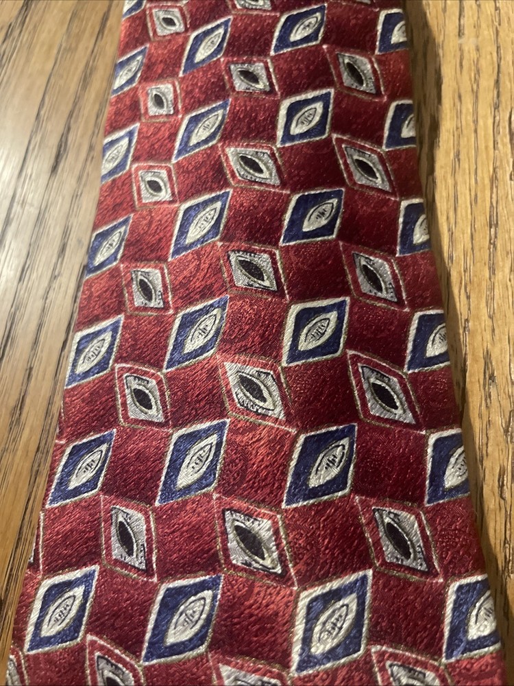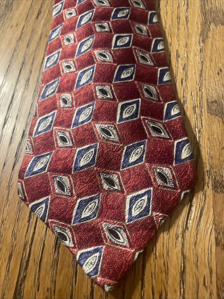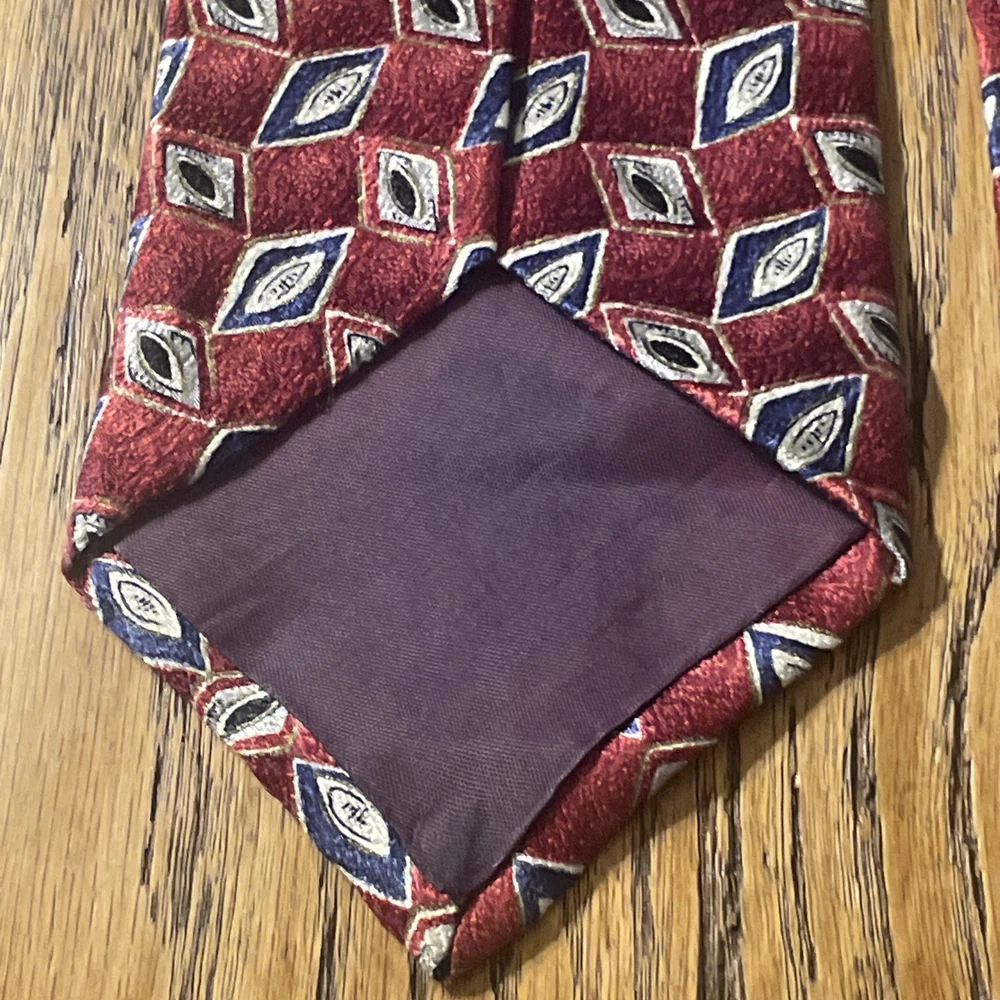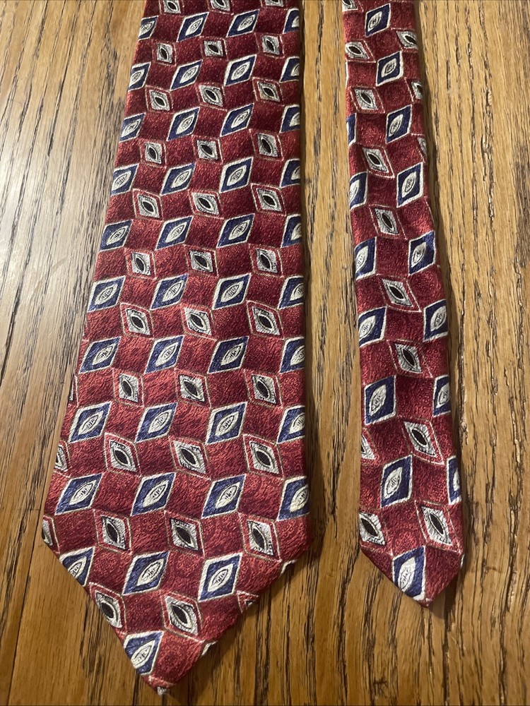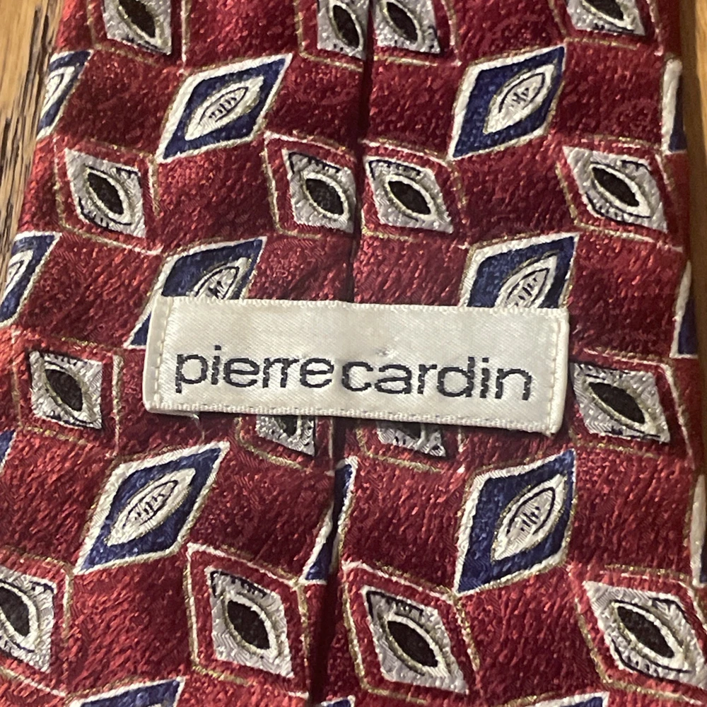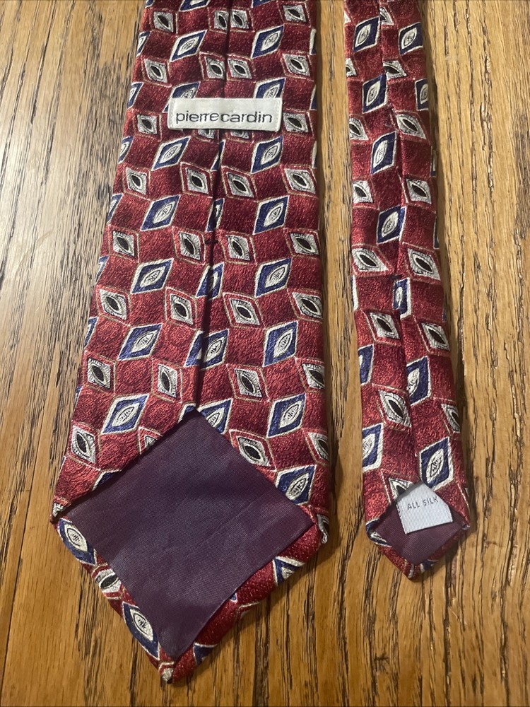 The Vintage EUC Pierre Cardin Geometric Silk Tie is a high-quality designer necktie made in the USA. Made from 100% silk fabric with a classic width, this preppy-themed tie features a stylish geometric pattern in multicolor. Perfect for men looking to add a touch of sophistication and vintage charm to their formal or professional attire.