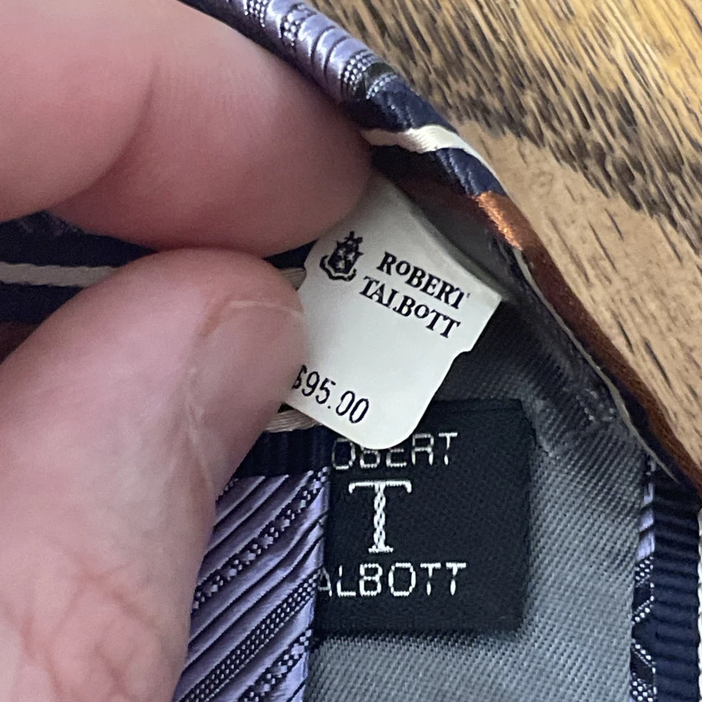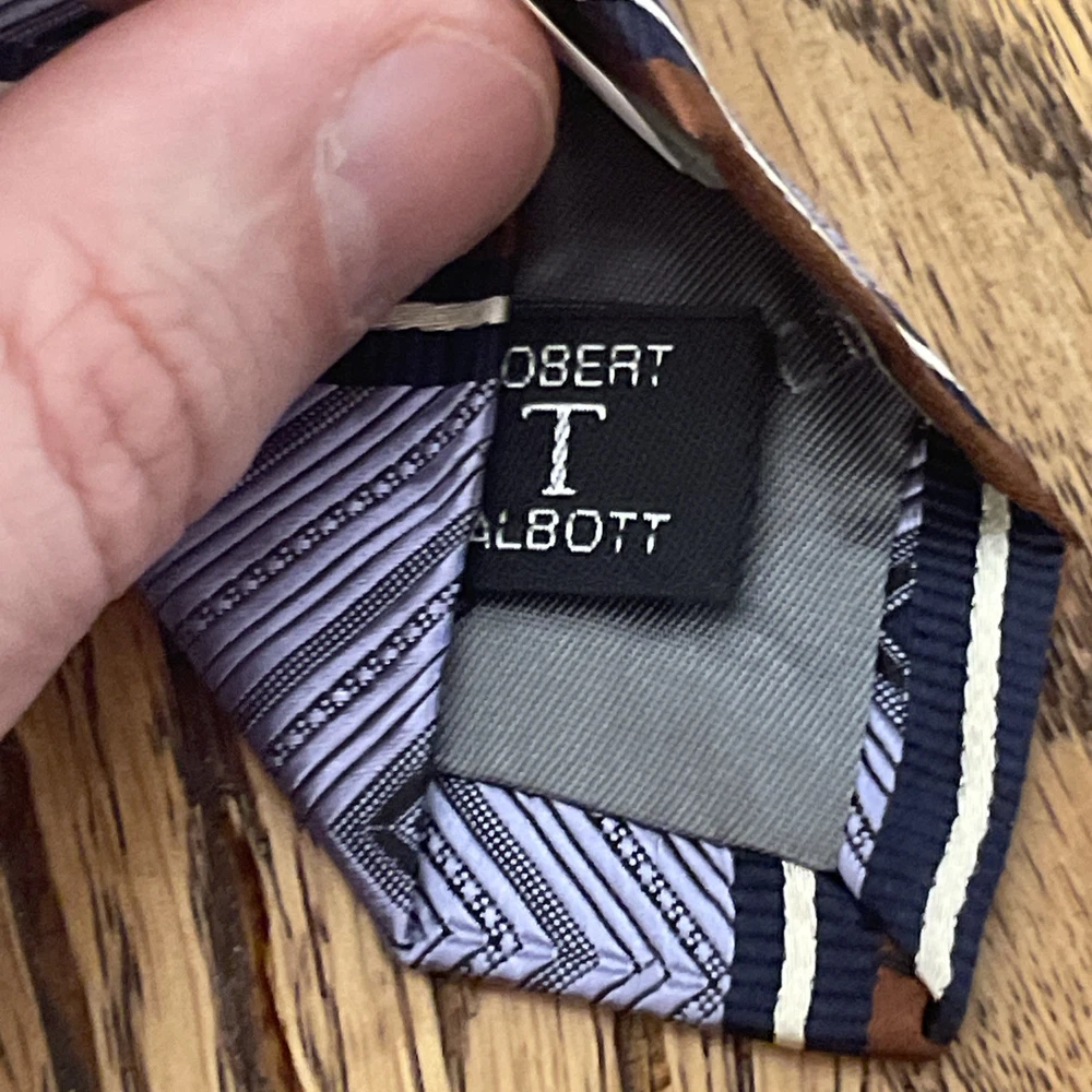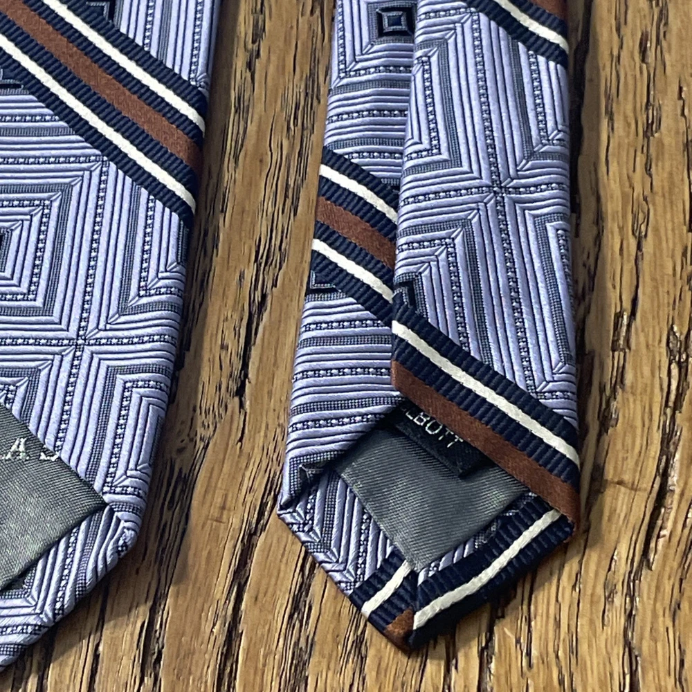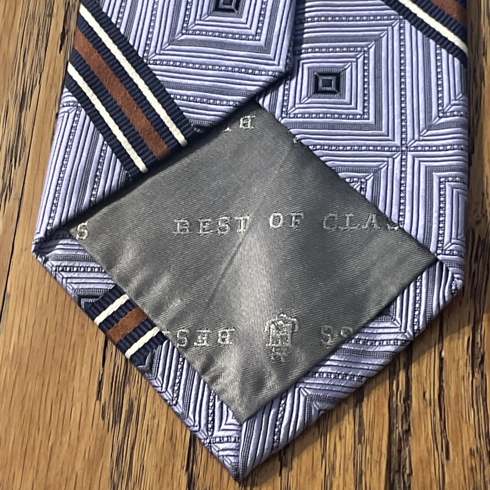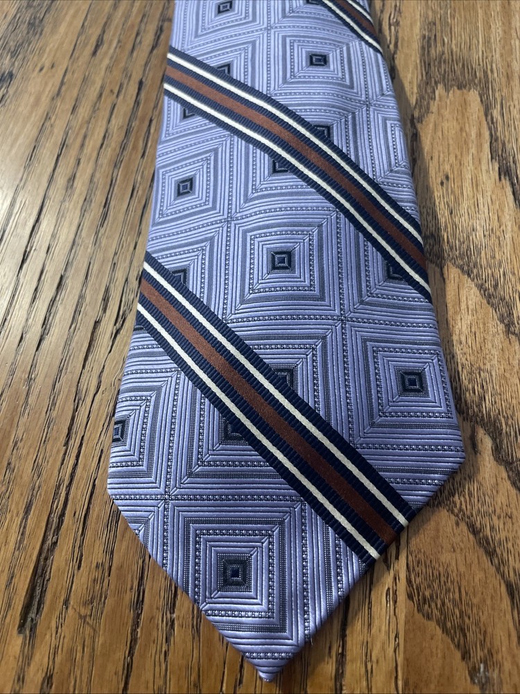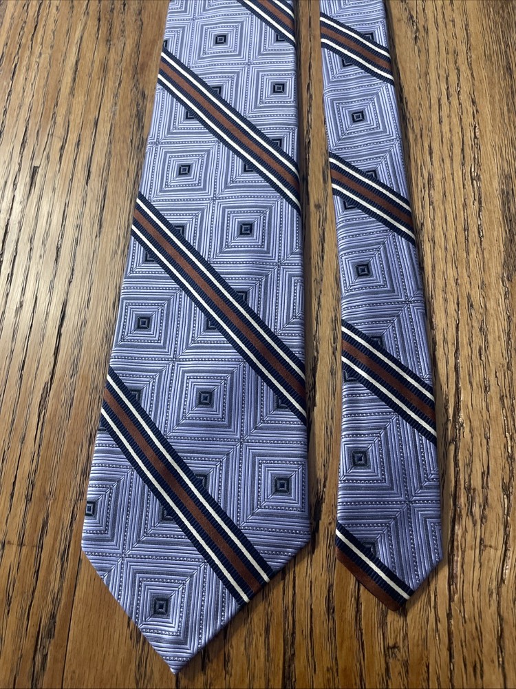 This Vintage EUC Robert Talbott Best Of Class Silk Tie is a designer accessory perfect for any men's formal or professional outfit. Made in the USA with 100% silk fabric, this woven tie features a geometric striped pattern in multicolor. The hand-sewn details and classic width make it a timeless piece that embodies craftsmanship and style.