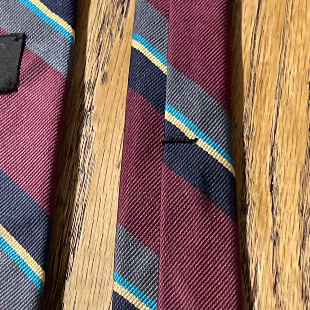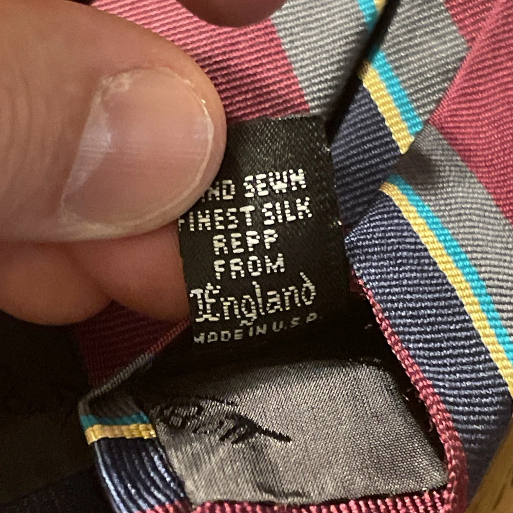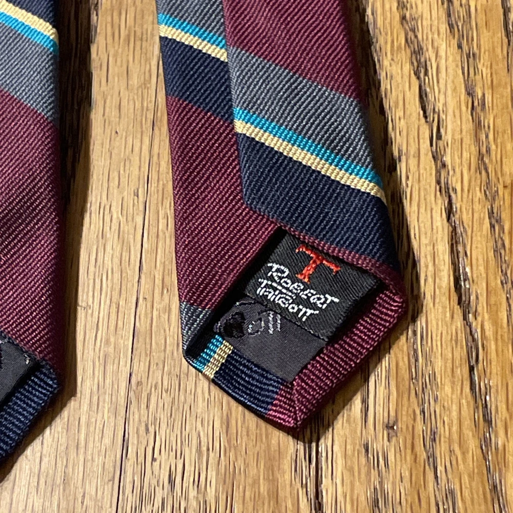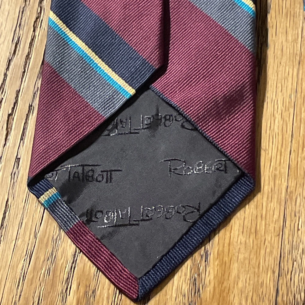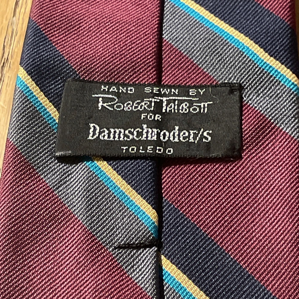 This vintage Robert Talbott Damschroder's Repp Silk Tie is a classic designer necktie made in the USA. Hand sewn from 100% silk fabric with a regimental stripe pattern, this multicolor tie exudes a sophisticated and timeless style. Perfect for adding a touch of luxury to any man's outfit, this necktie is a rare find for those who appreciate high-quality craftsmanship and heritage in their accessories.