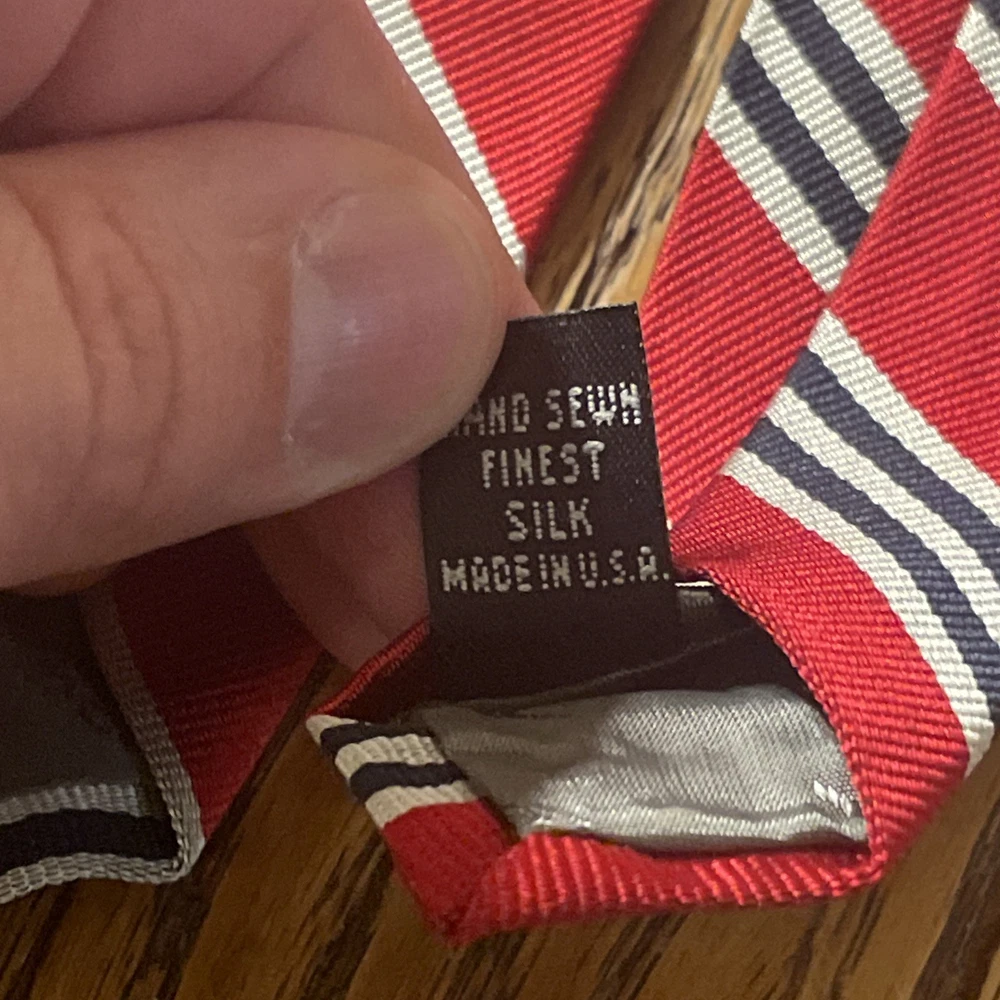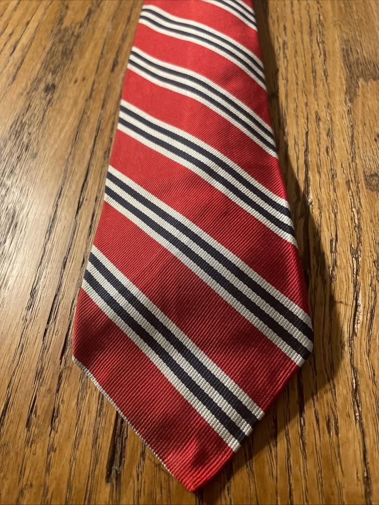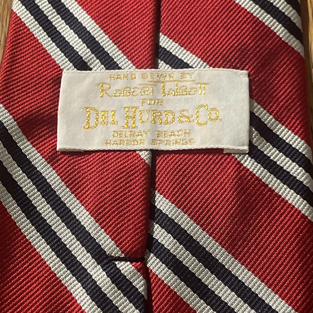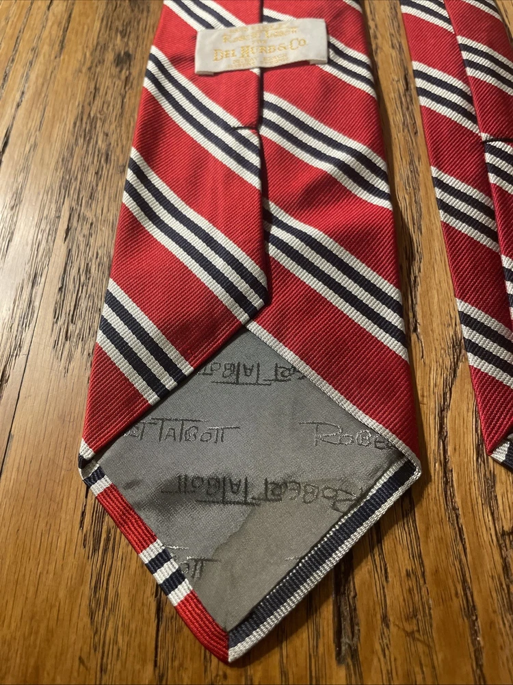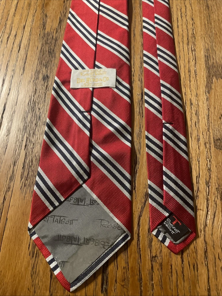 The product is a vintage Robert Talbott Repp Silk Striped Tie, hand-sewn in the USA. This designer tie features a classic multicolor striped pattern on 100% silk fabric, embodying a timeless and sophisticated style. Perfect for adding a touch of vintage charm to any man's wardrobe, this tie showcases the brand's commitment to quality craftsmanship and unique design.