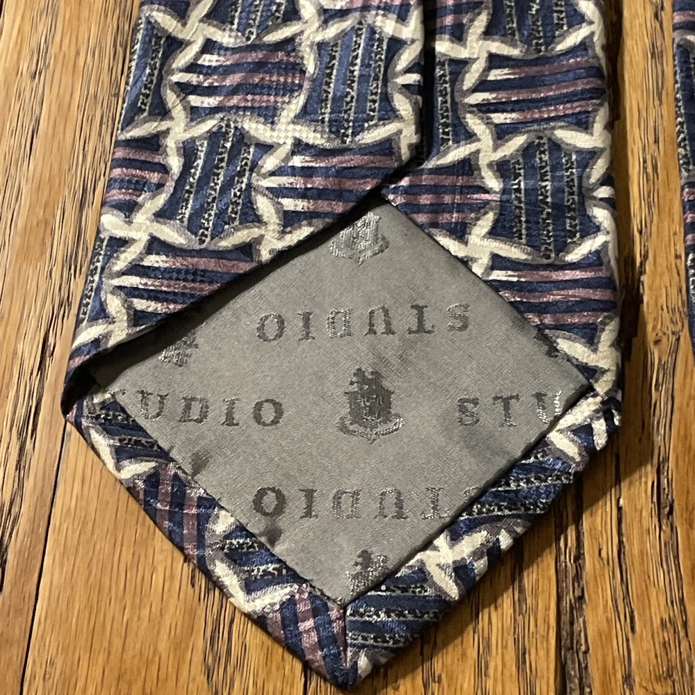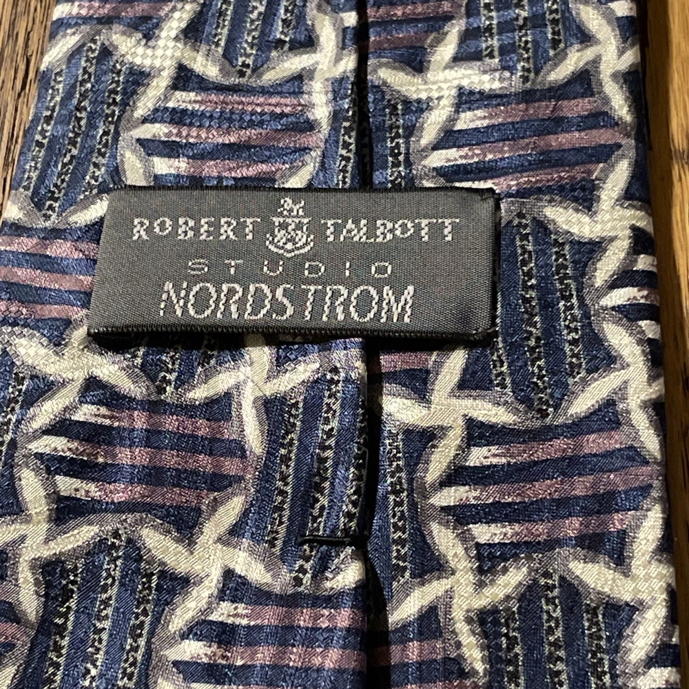 This vintage Robert Talbott Studio silk tie is a designer piece hand sewn in the USA. The geometric pattern in multicolor is perfect for a preppy style, making it a classic accessory for men. Made from 100% silk fabric, this tie exudes quality and sophistication, a luxurious addition to any man's wardrobe.