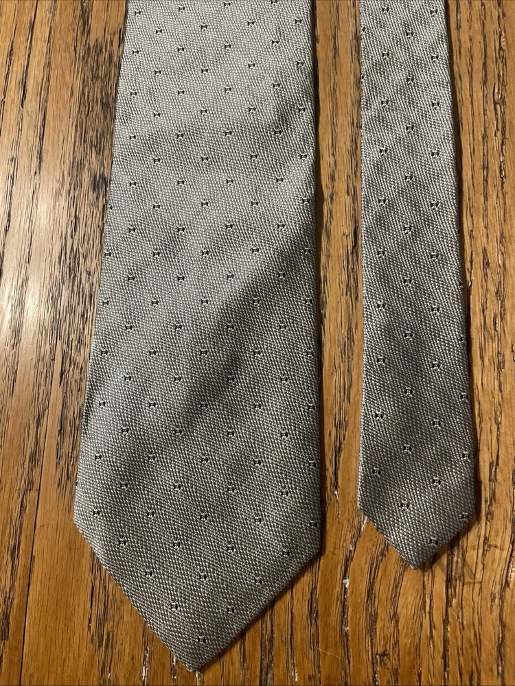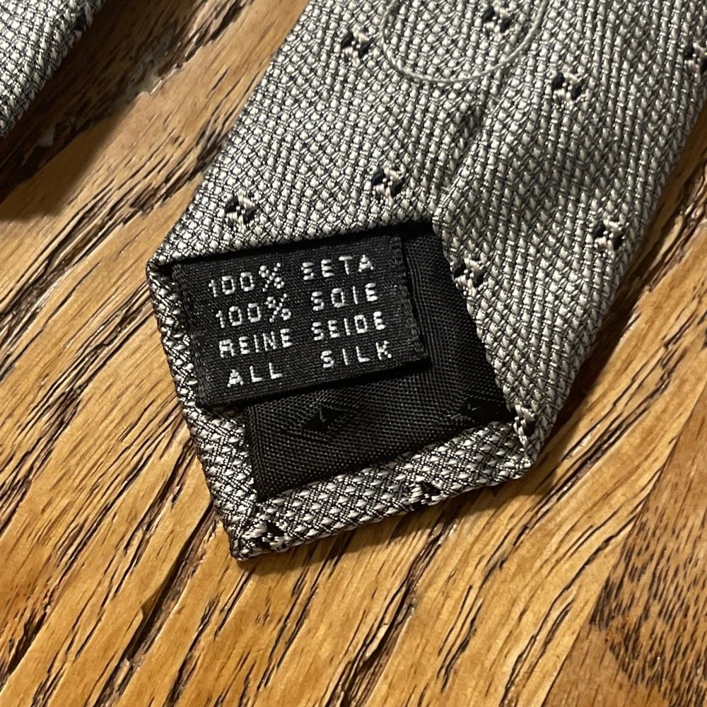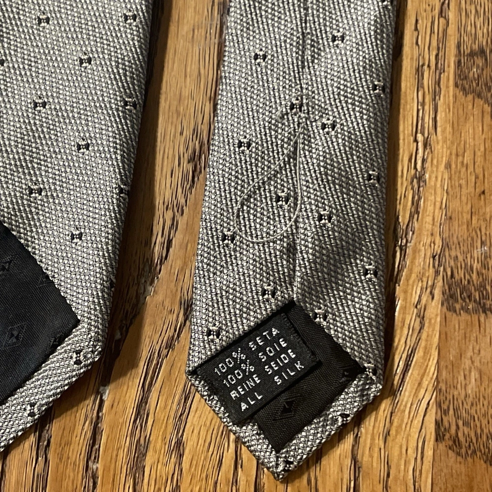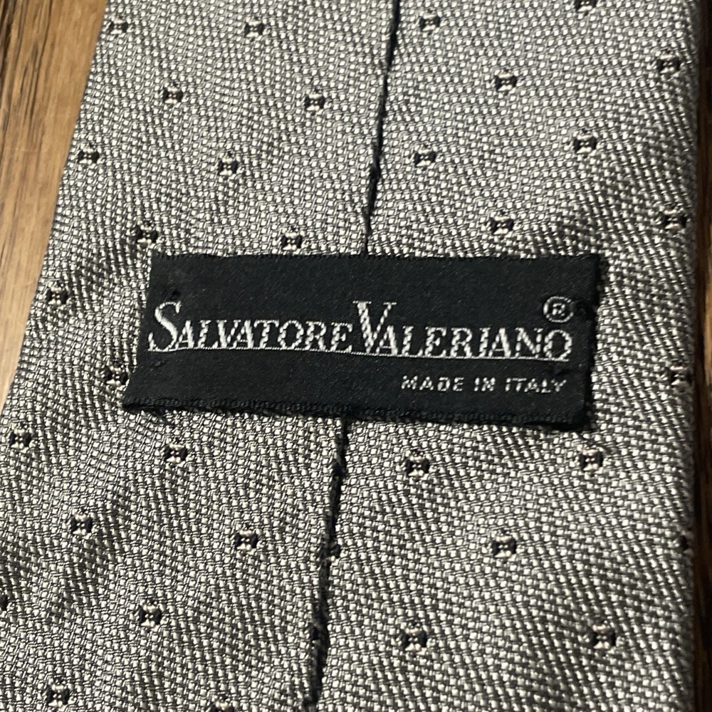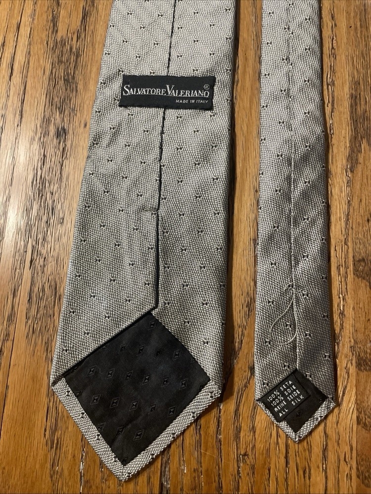 The Vintage Salvatore Valeriano Silk Geometric Tie is a luxurious men's accessory made in Italy. Featuring a classic metallic silver color with a preppy geometric pattern, this designer tie is crafted from 100% silk fabric. The vintage piece exudes sophistication and style for any formal occasion, adding a touch of elegance to any outfit. Perfect for the modern gentleman looking to elevate his wardrobe with a high-quality, timeless piece.