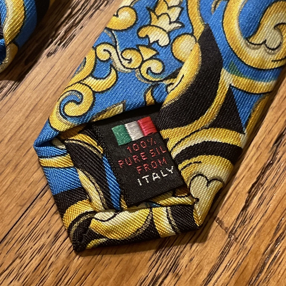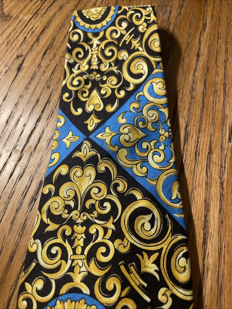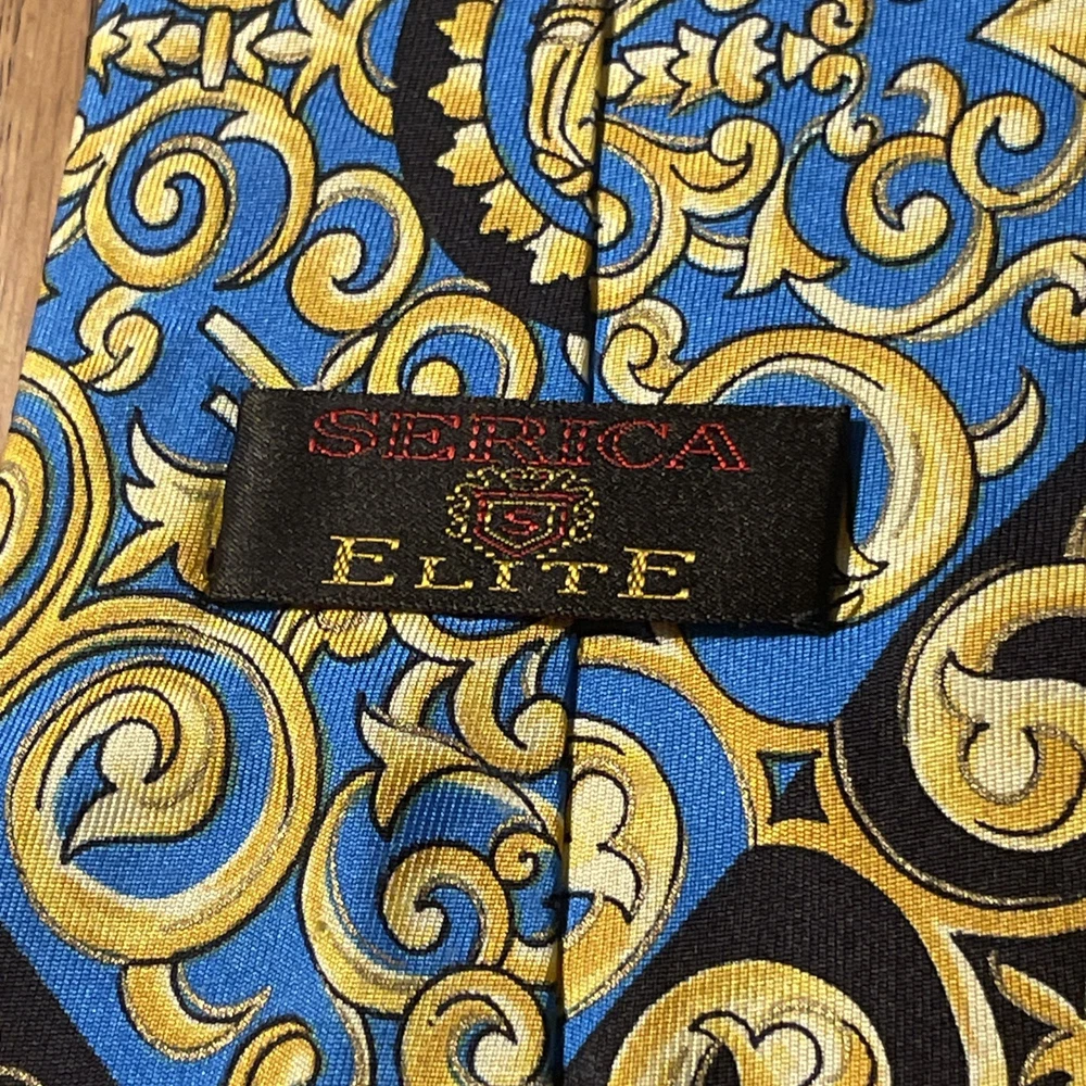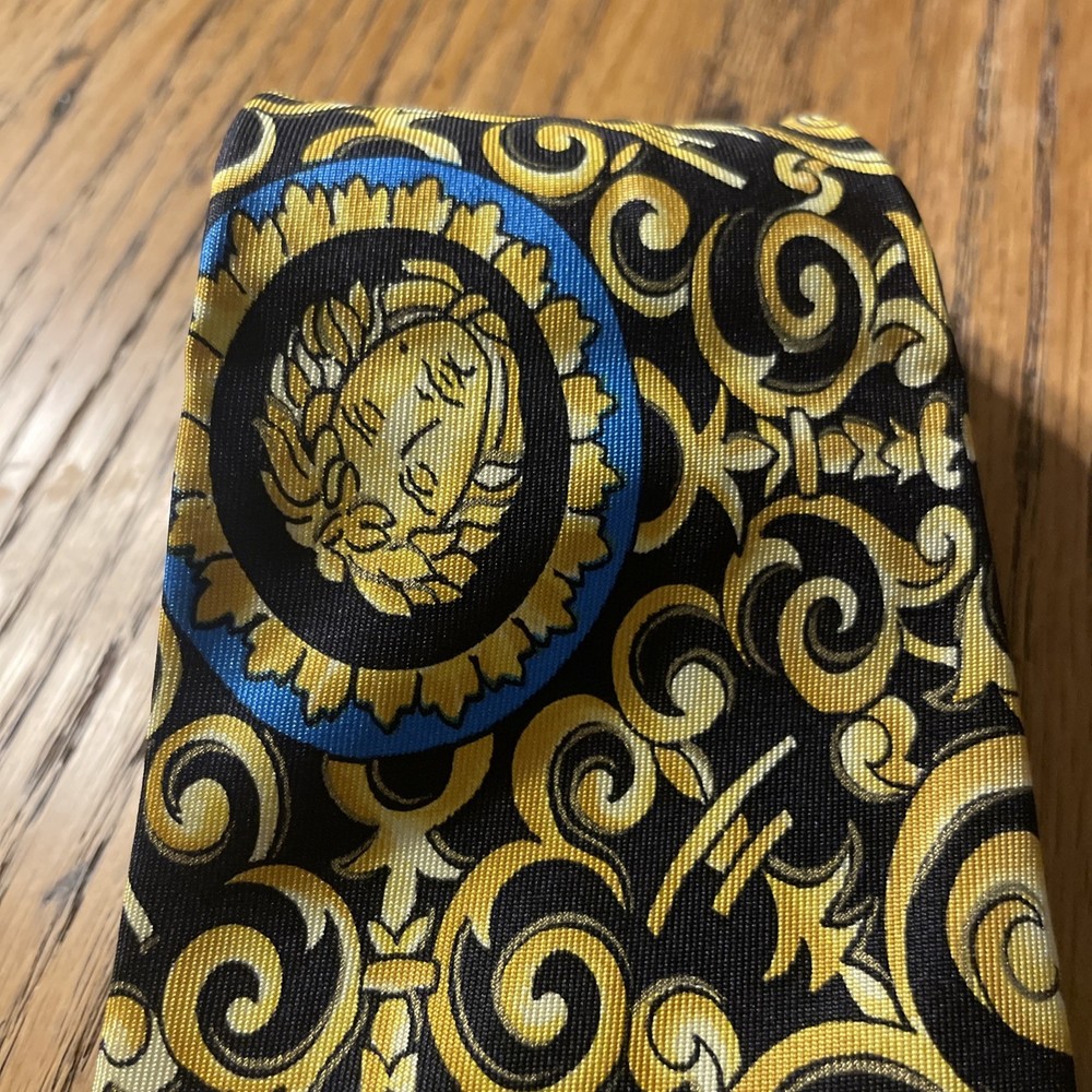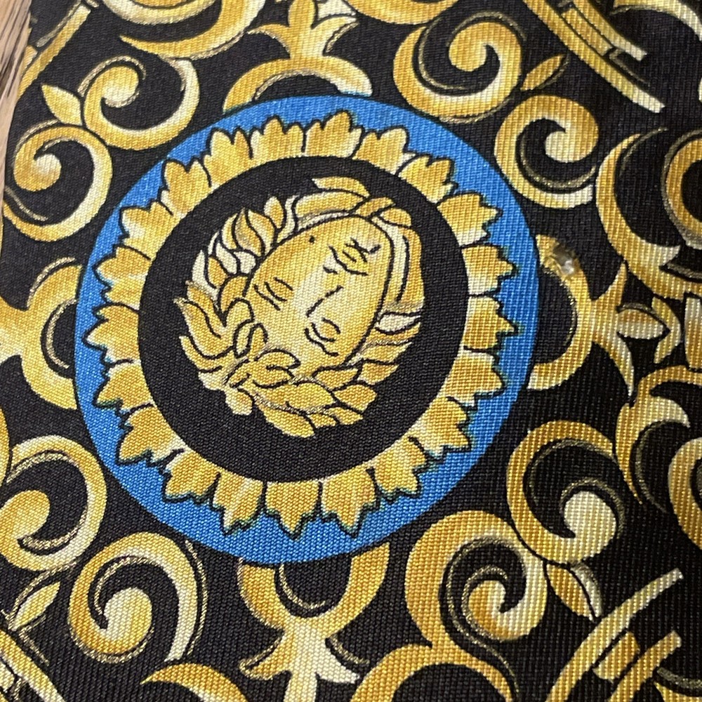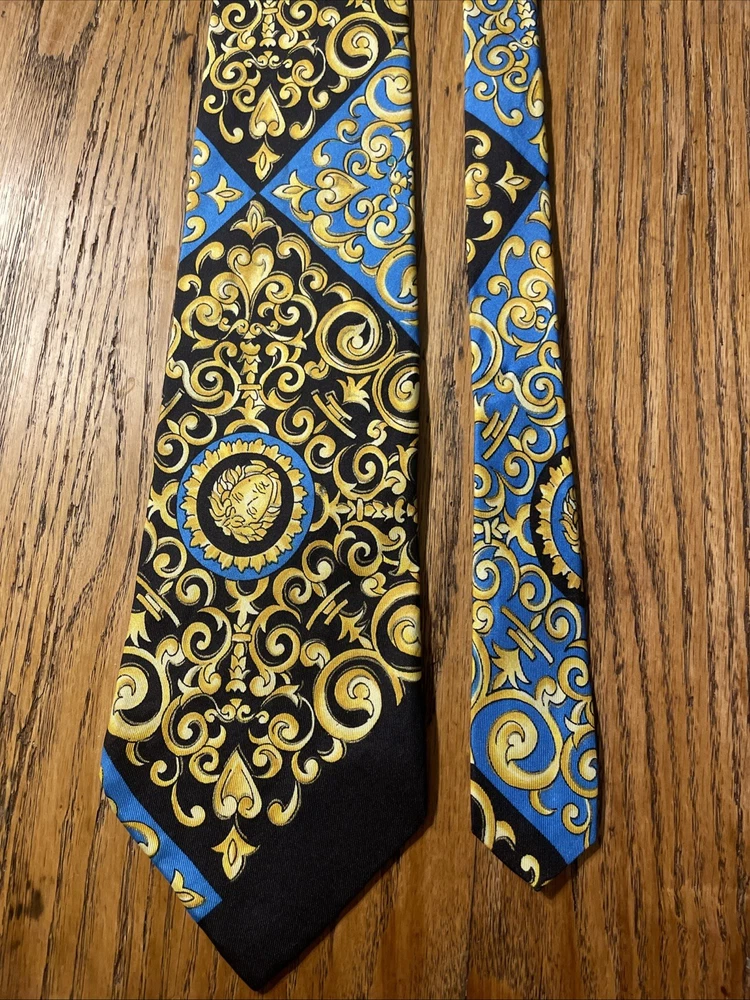 The Vintage Serica Elite Medusa Head Geometric Silk Tie is a luxurious and designer accessory for men, made in Italy. The tie features a classic width and a Baroque pattern with a unique Medusa head design. Crafted from 100% silk satin fabric, this tie exudes a sense of power and elegance, perfect for adding a touch of sophistication to any formal outfit. A true vintage gem for those who appreciate high-quality craftsmanship and timeless style.