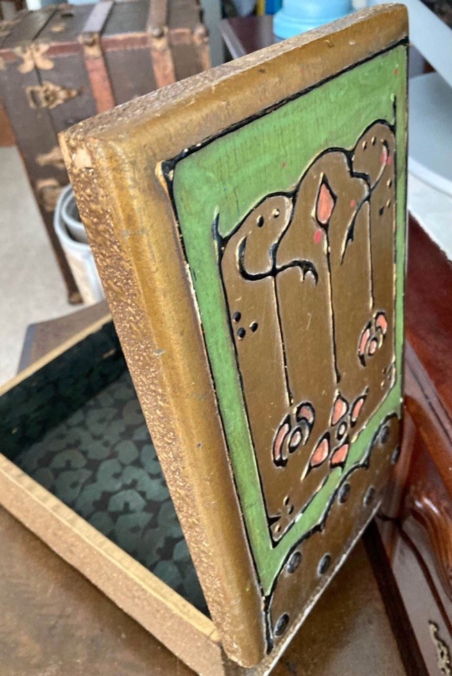 This vintage hand-painted keepsake box from the early 20th century Arts & Crafts Era is a beautifully crafted piece that exudes artistry and charm. The intricate hand-painted design, featuring a boxing subject, adds a unique and nostalgic touch to any collection. Made by the brand CENTURY, this collectible item is not only functional but also a lovely decorative piece that captures the essence of the Arts & Crafts movement. This came from an elderly woman in Florida. She told me her mother had it for years and it’s from her wedding in early 20s. I believe it was a keep sake box for a Bible.