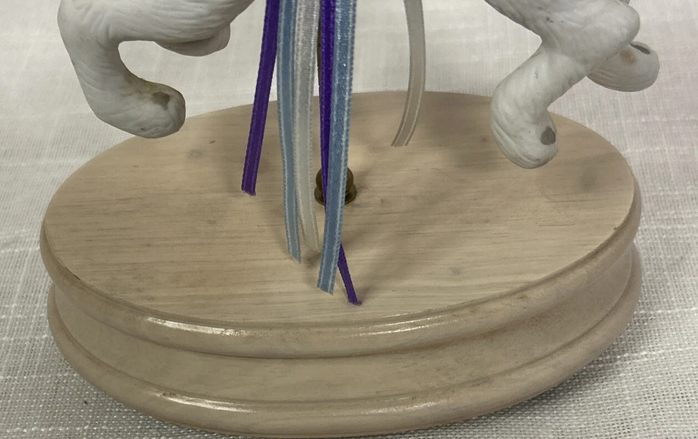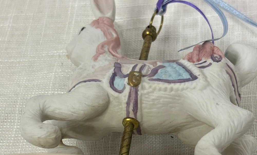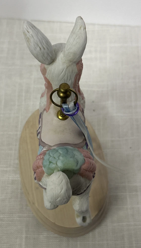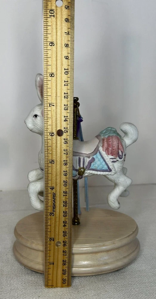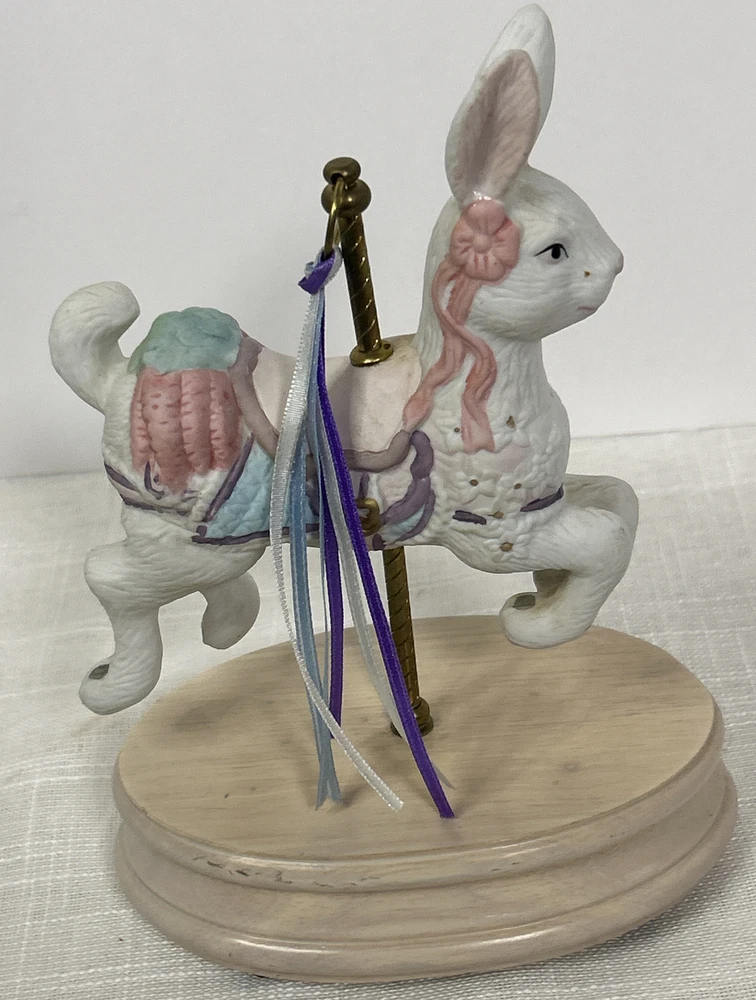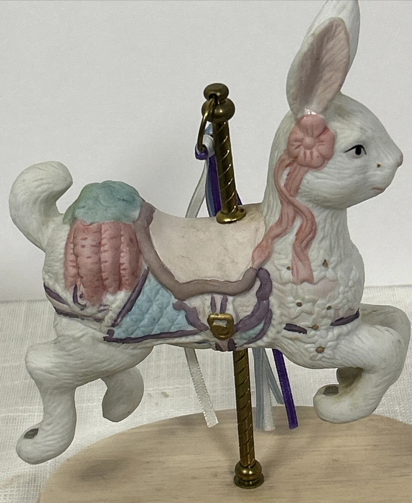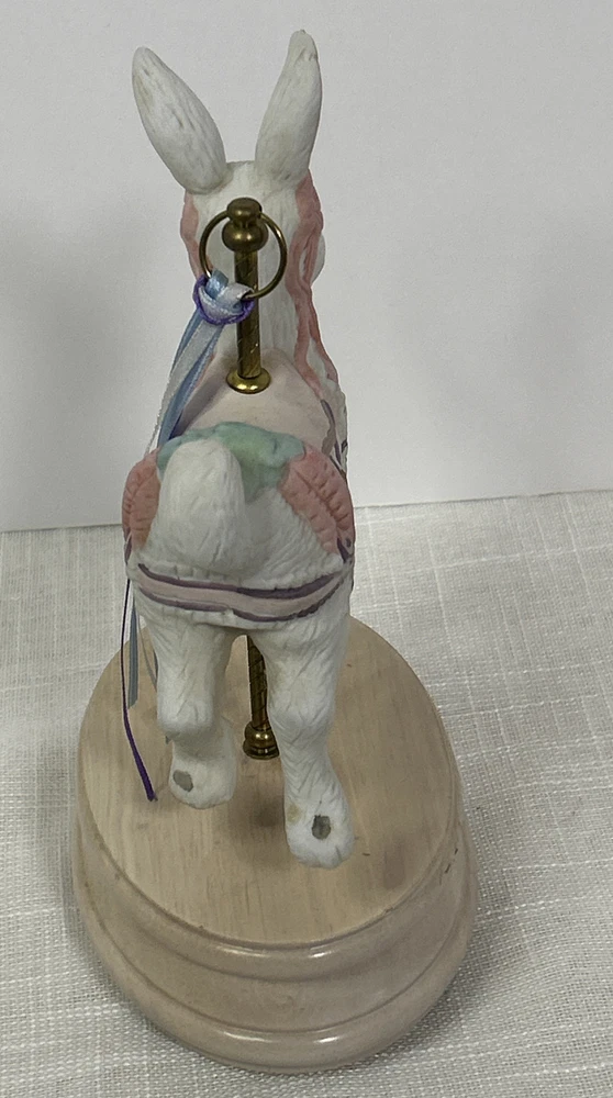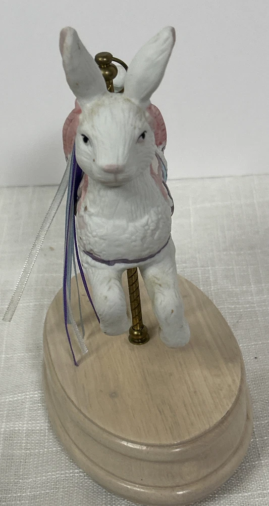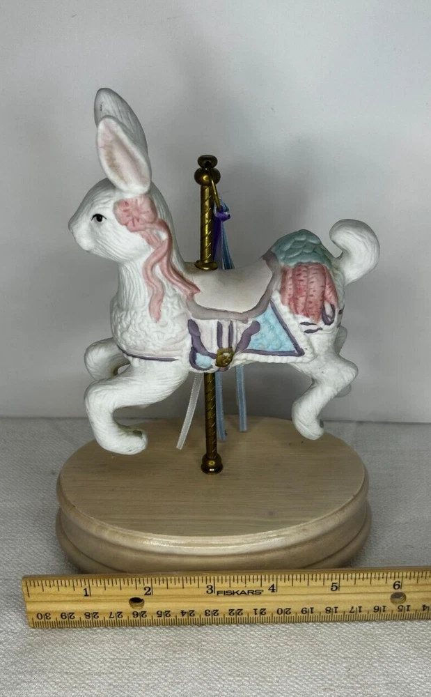 Vintage Collectible Easter Bunny Rabbit Carousel Music Box This charming vintage music box features a delightful carousel rabbit design and plays a classic tune when wound up. This adorable collectible is a unique addition to any collection. Whether you're a music box collector or simply appreciate decorative accents, this item is sure to bring joy to your space. This beautiful bunny rabbit music box will make a wonderful anytime gift! Vintage Easter Bunny Rabbit Carousel Music Box is in great vintage pre-owned condition with NO chips, cracks or repairs and the music box works well. Please review all pictures and video for proper assessment of its vintage pre-owned condition.