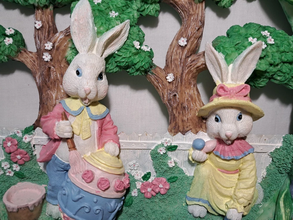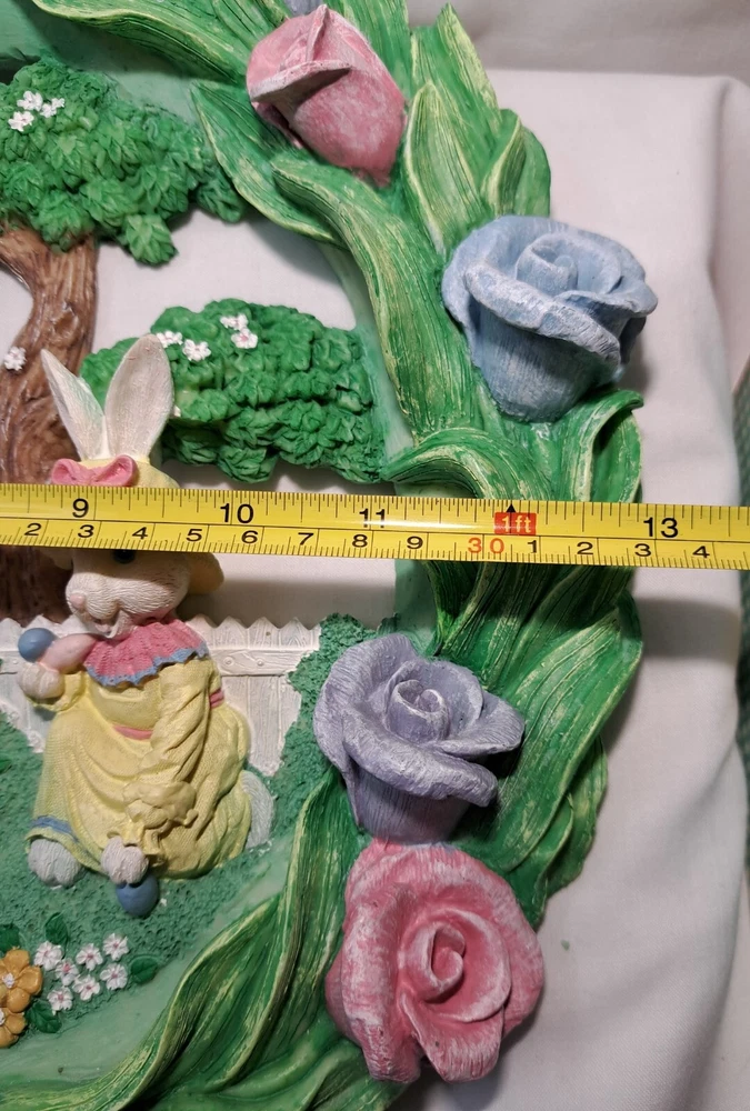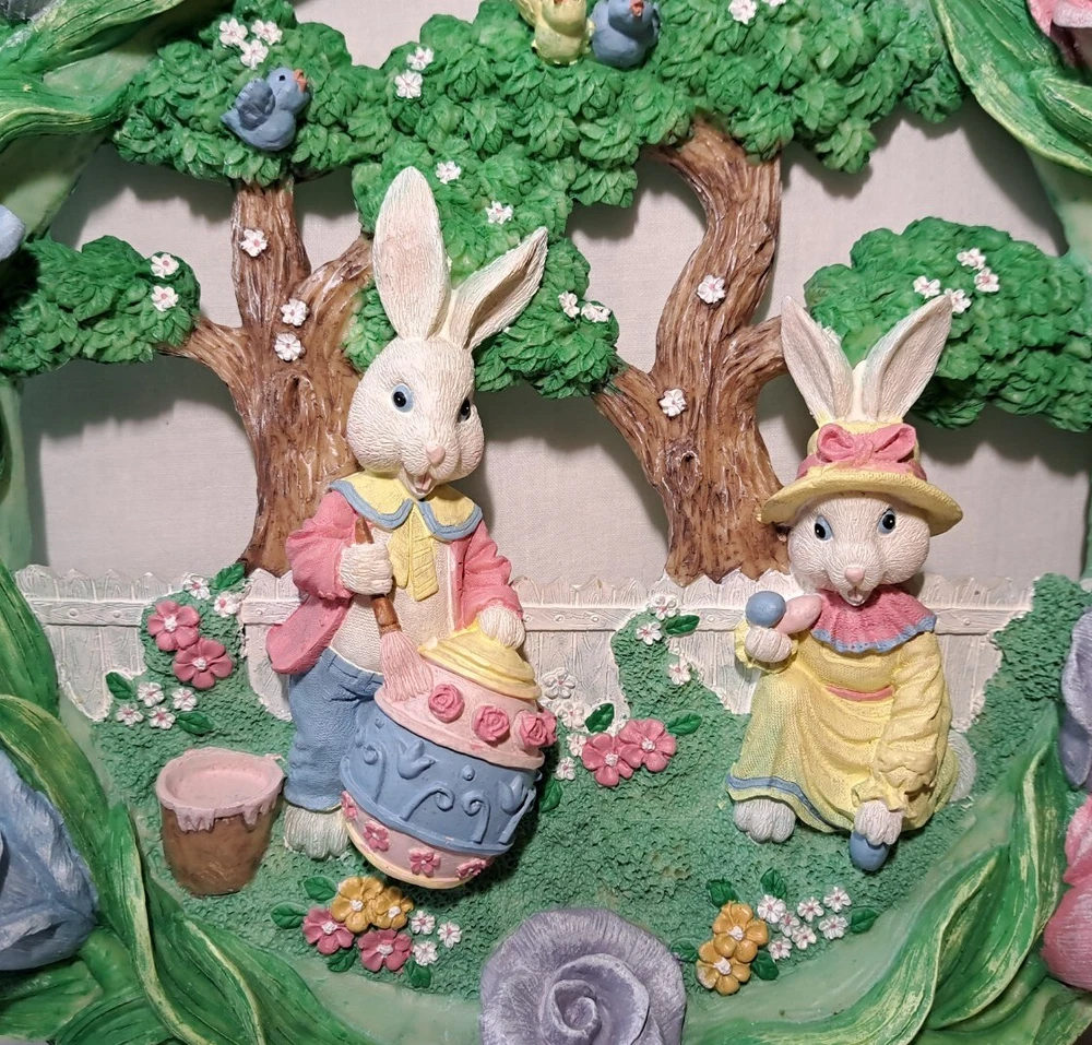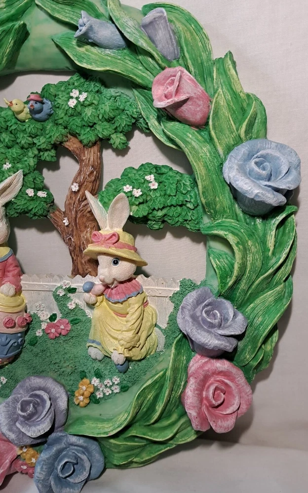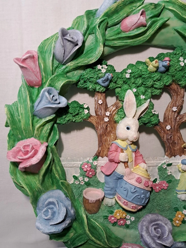 Easter Bunny Eggs Flowers Birds Vintage Easter Wreath Bunnies Resin Approx 12" tall see pictures for measurements I consider to be in VERY GOOD condition Please view all photos zooming in on them as they are part of the description for you to judge condition Will ship either USPS, Fedex or UPS depending on the location of where buyer lives. IMPORTANT - if ships via UPS or Fedex they require a home delivery address as they cannot deliver to post office boxes - NO POST OFFICE BOX