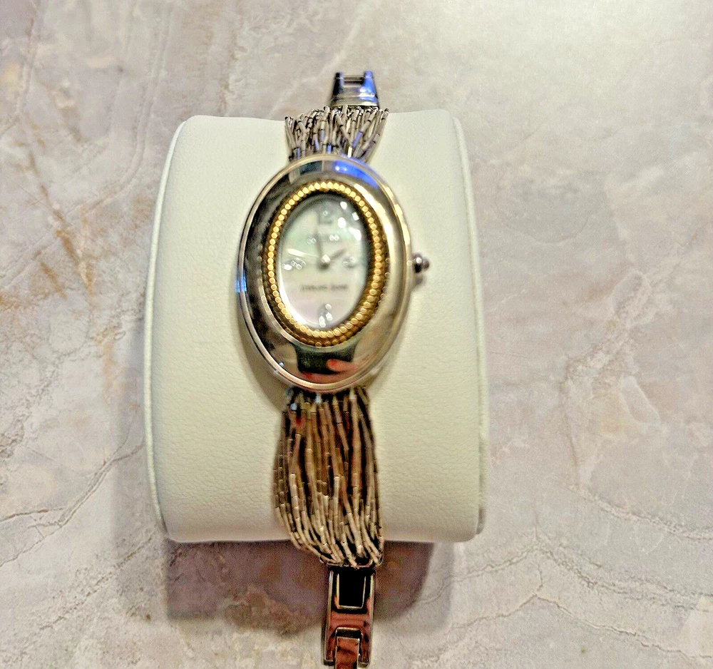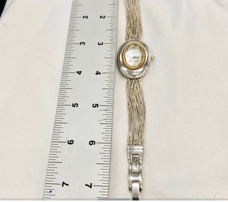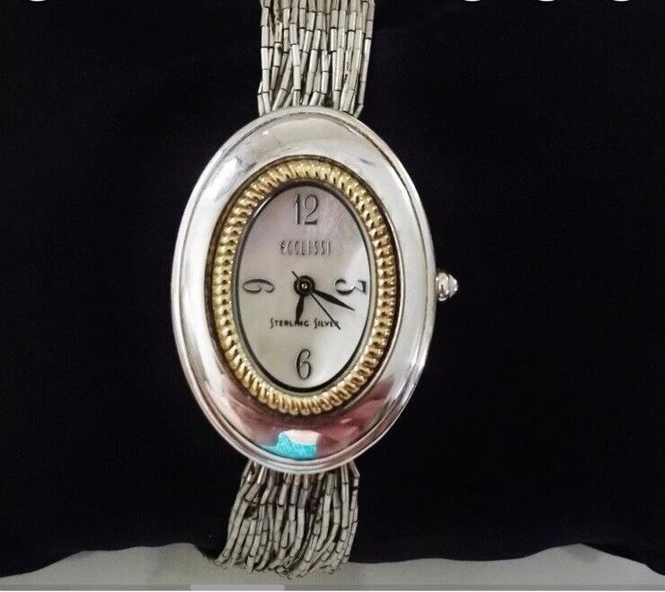 This vintage Ecclissi Mother of Pearl Liquid Silver wristwatch for women is a stunning piece that will surely catch anyone's attention. The watch features a beautiful mother of pearl face and sterling silver, liquid silver band. The watch is 925 and has a reference number of 32840. The watch is vintage and does not come with original box/packaging or papers. But with its unique design and elegance, it is still a wonderful addition to any watch collection.