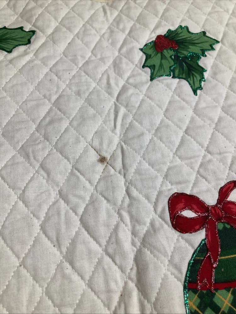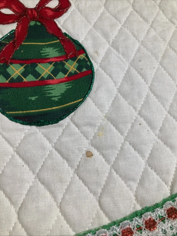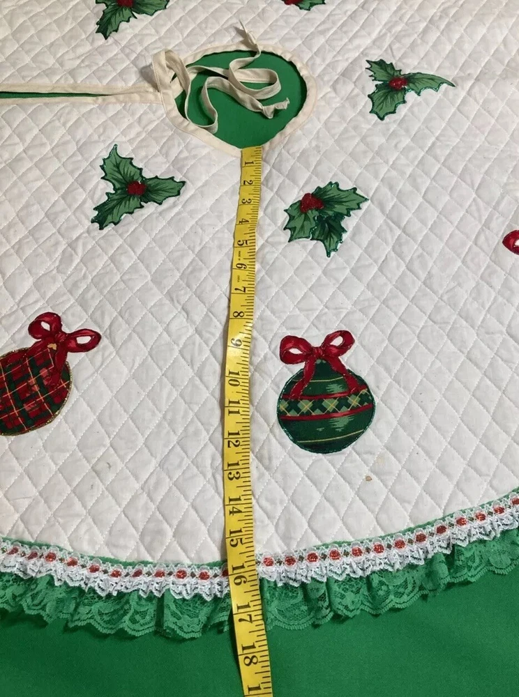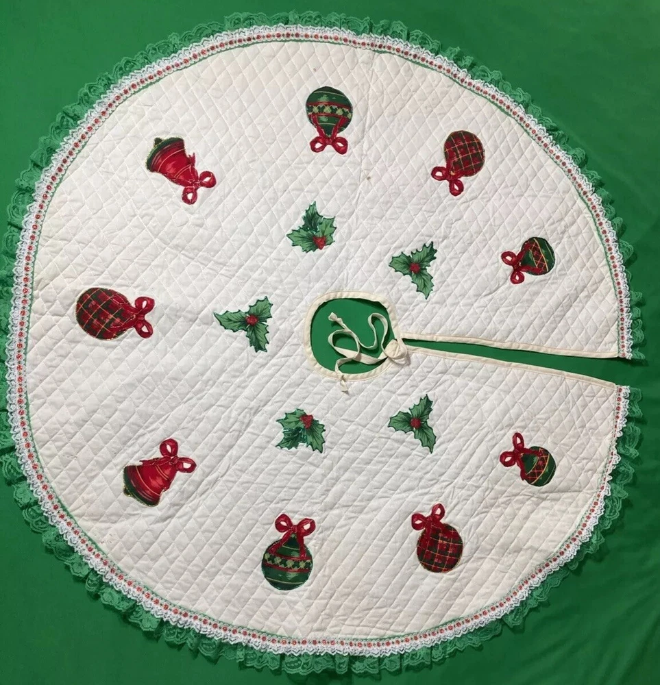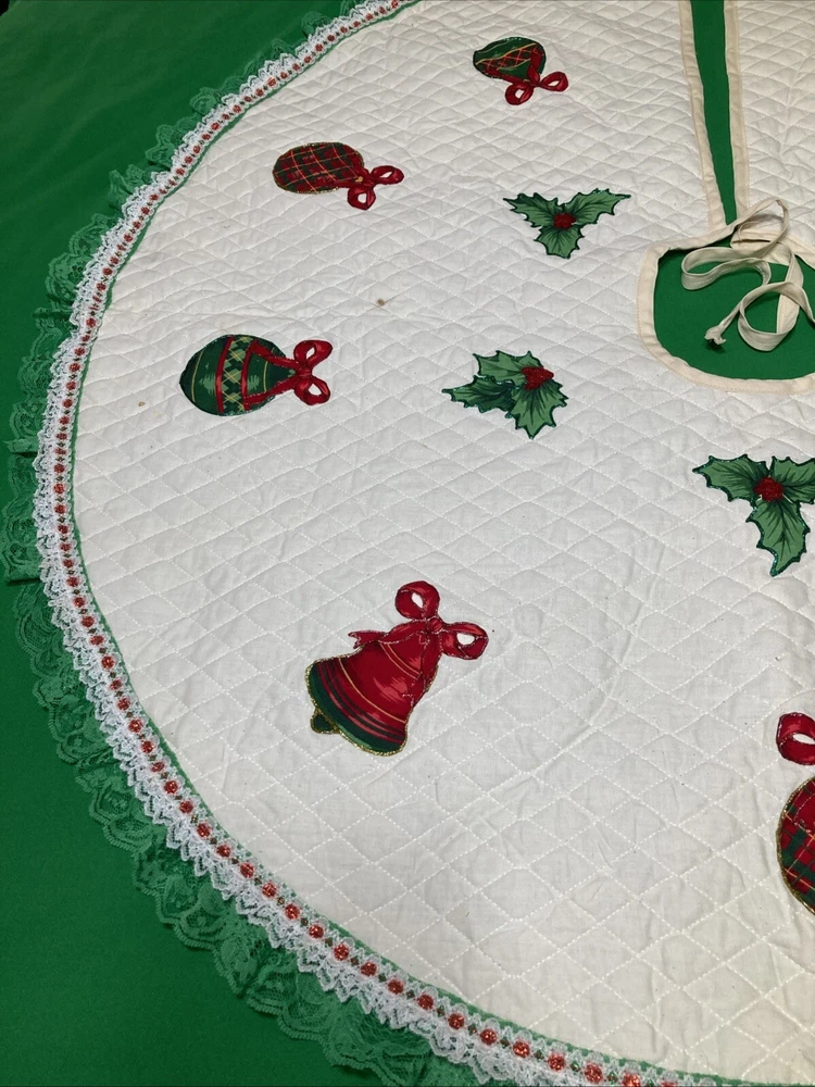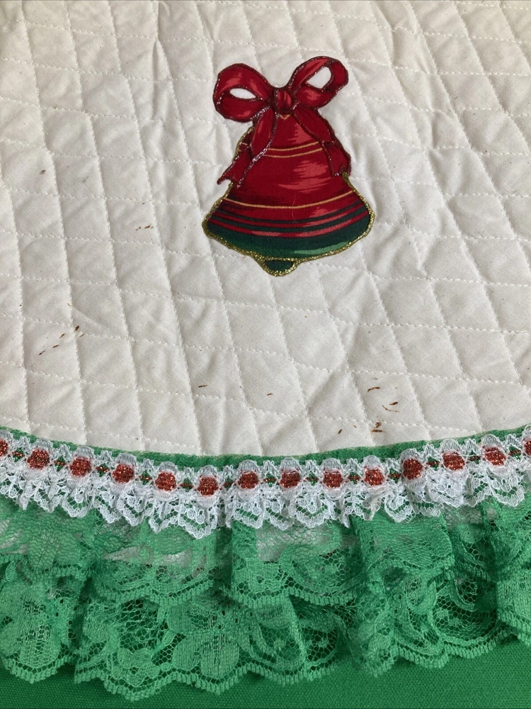 Has age related storage stains but doesn’t feel like it has ever been used. Feels crisp. Tinge of water stain on back but doesn’t seep onto front. I took pictures of all discolorations and I have not tried to clean. FREE SHIPPING Add a touch of vintage charm to your Christmas tree with this handmade quilted double lace ruffle trim tree skirt. The beige color and medium size make it a perfect fit for any tree stand, while the circle shape adds a unique touch to your holiday decor. Made with high-quality materials, this tree skirt is durable and perfect for multiple holiday seasons. Whether you're looking for a classic or eclectic Christmas tree skirt, this vintage piece is sure to impress. Item has not been laundered. Please use photos for better assessment of the item as well as measurements. Feel free to message me through eBay if you have any questions.