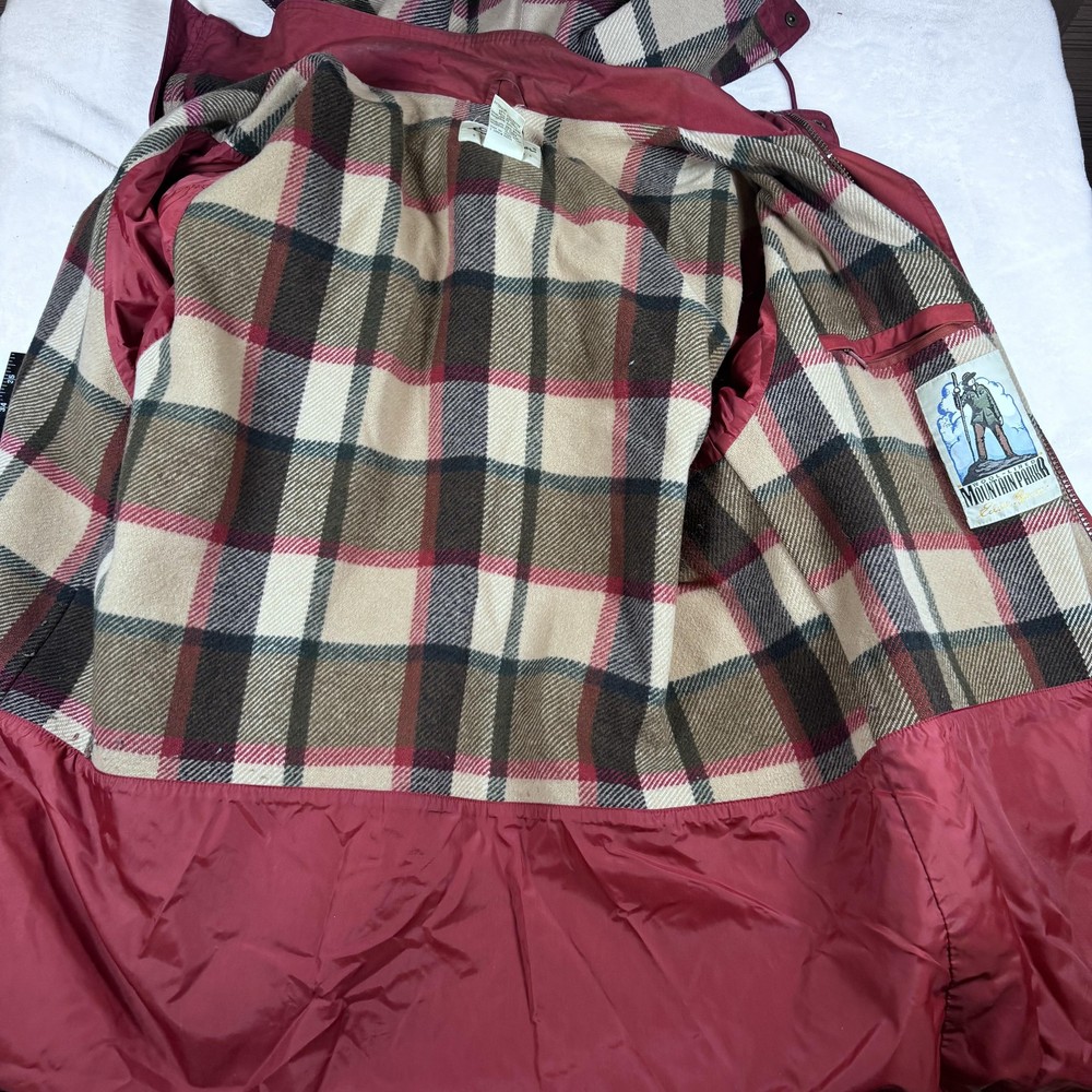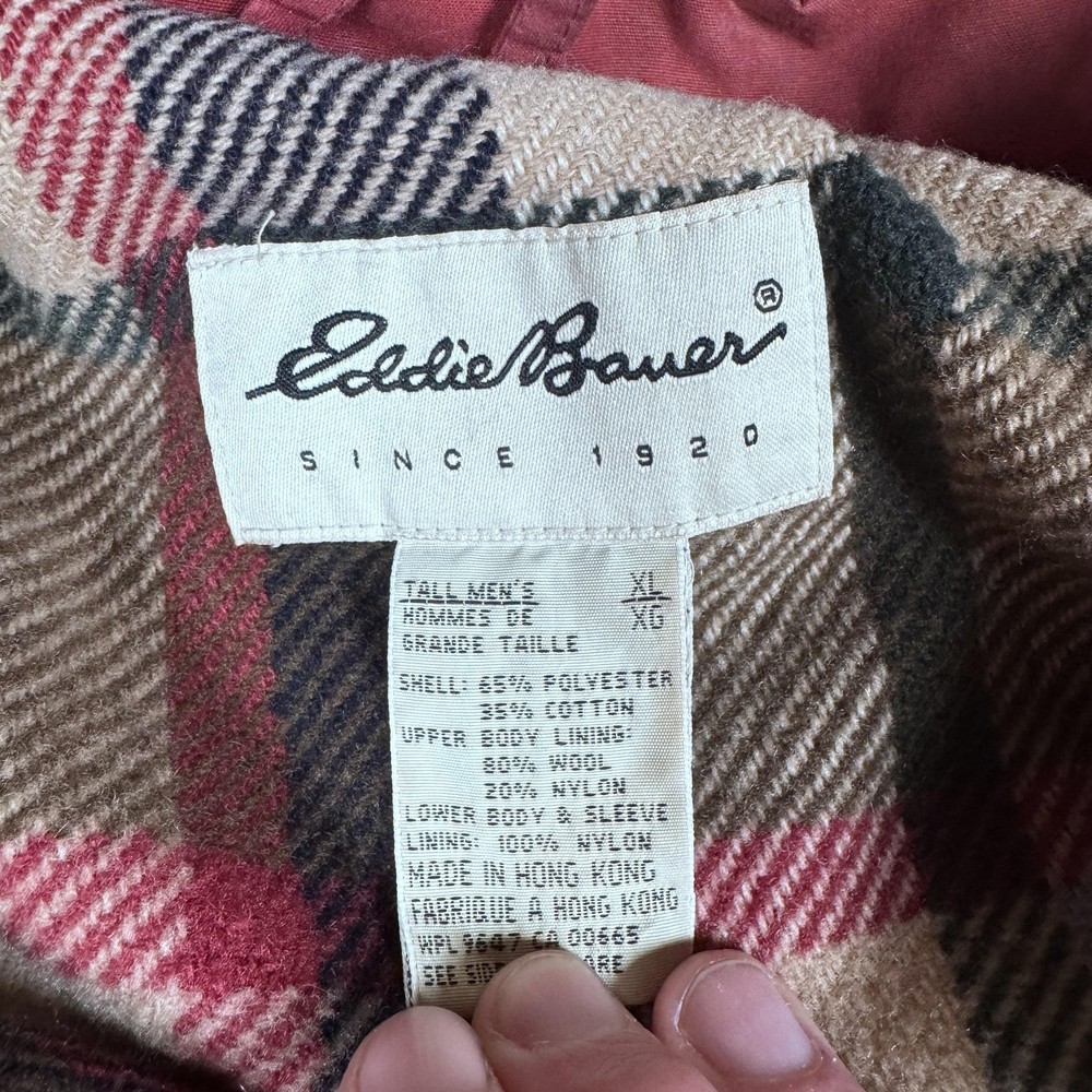 Brand: Eddie Bauer Model: Outdoor Outfitter wool-lined Mountain Parka jacket. Size: Mens XL (per interior tag). Color: Deep red outer shell with tan, brown, black, and red plaid wool lining. Materials: Cotton blend outer shell with wool lining and insulation; made in Hong Kong. Design: Classic longer parka length with full zip front and snap storm flap, detachable hood with plaid underside, stand collar, and adjustable hook-and-loop cuffs. Storage: Chest pockets hidden under front yoke flaps, large lower flap pockets with snap closures, side hand pockets, interior pocket, and rear zip pocket across the back. Details: Eddie Bauer Since 1920 neck label, branded metal snaps, large interior "Wool-Lined Mountain Parka Eddie Bauer" patch, and quilted lower interior for added warmth; vintage 1980s outdoor hiking style.