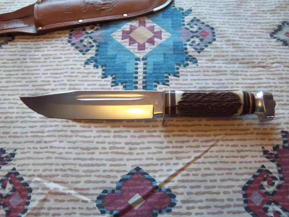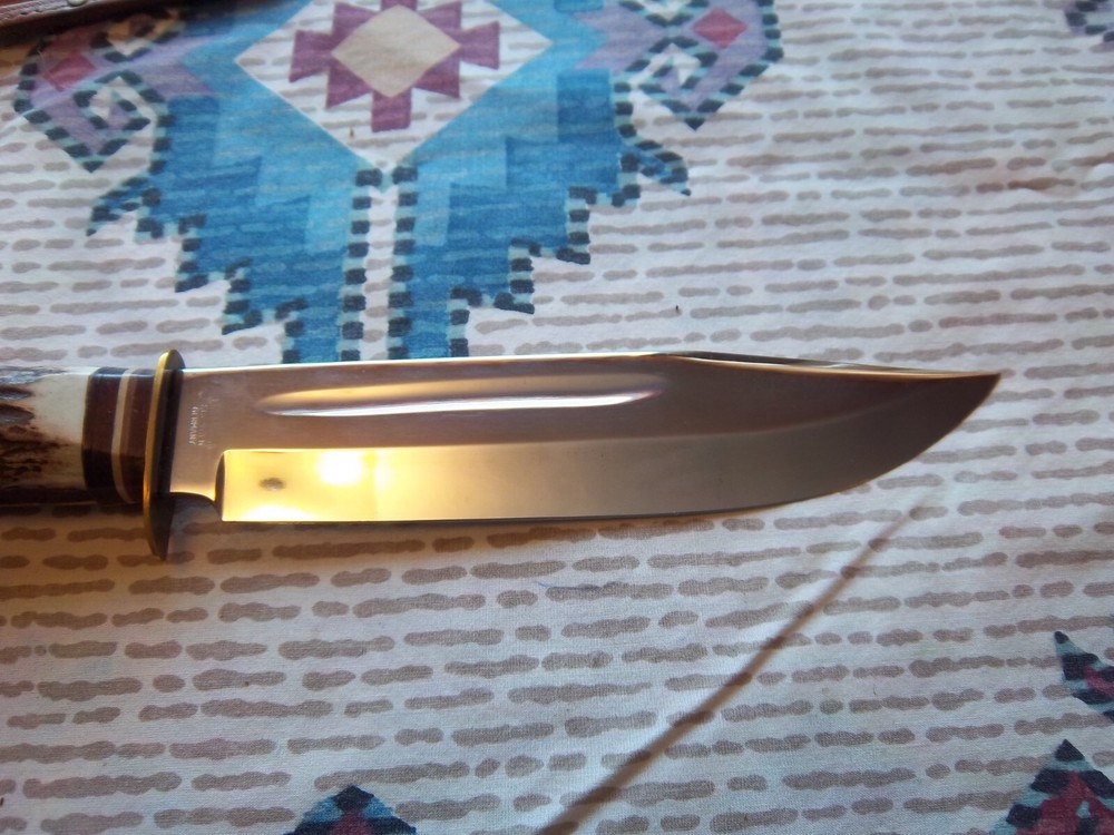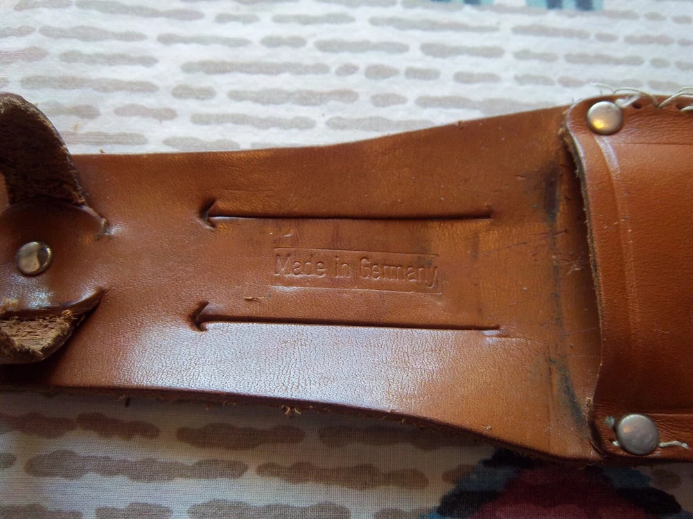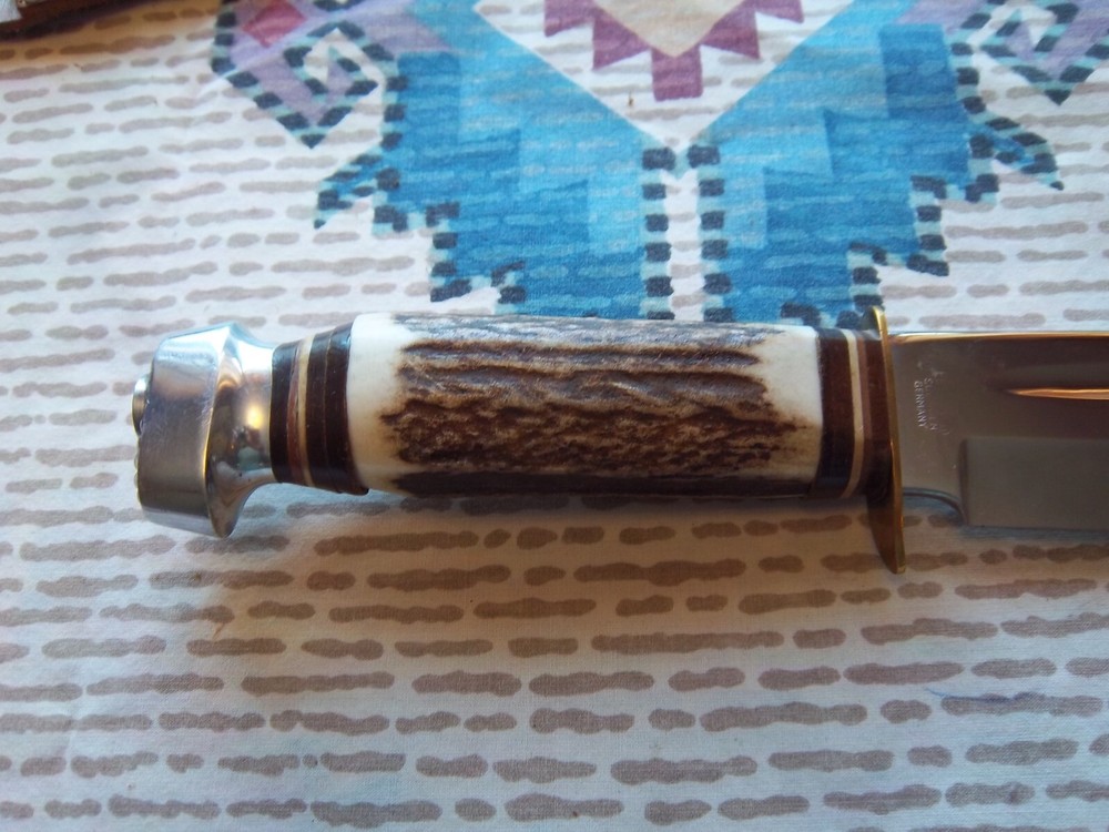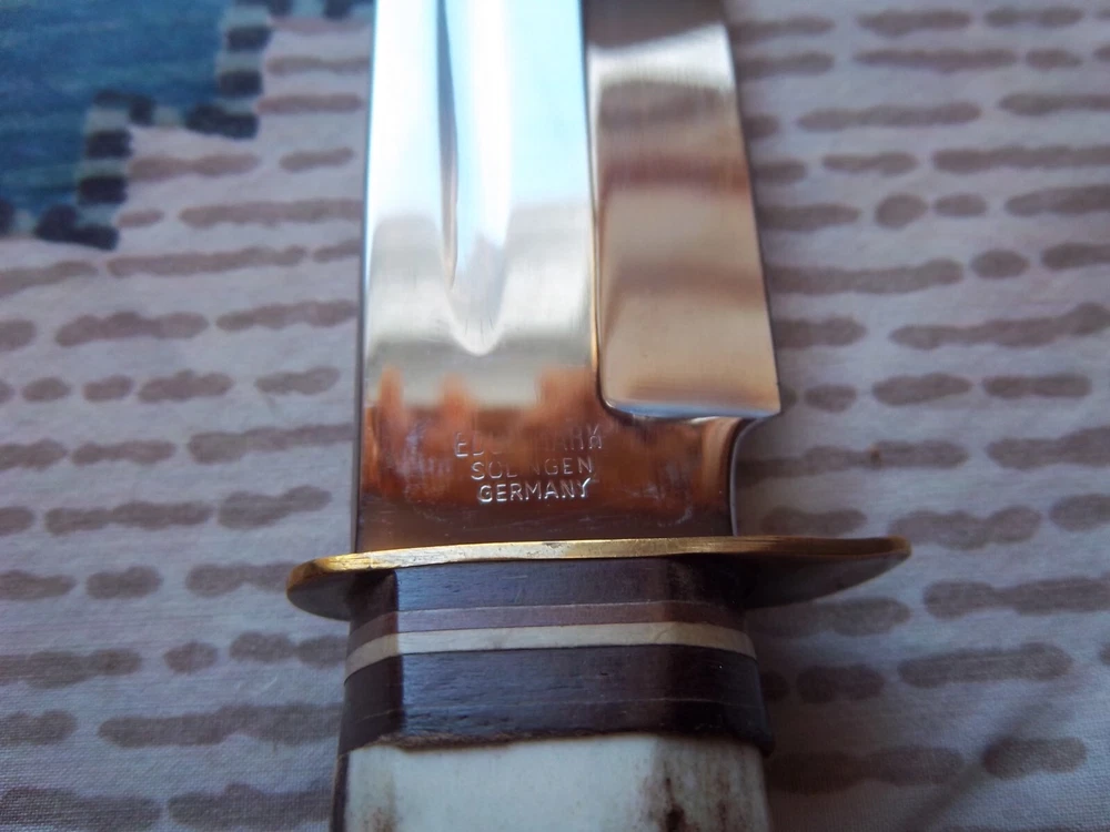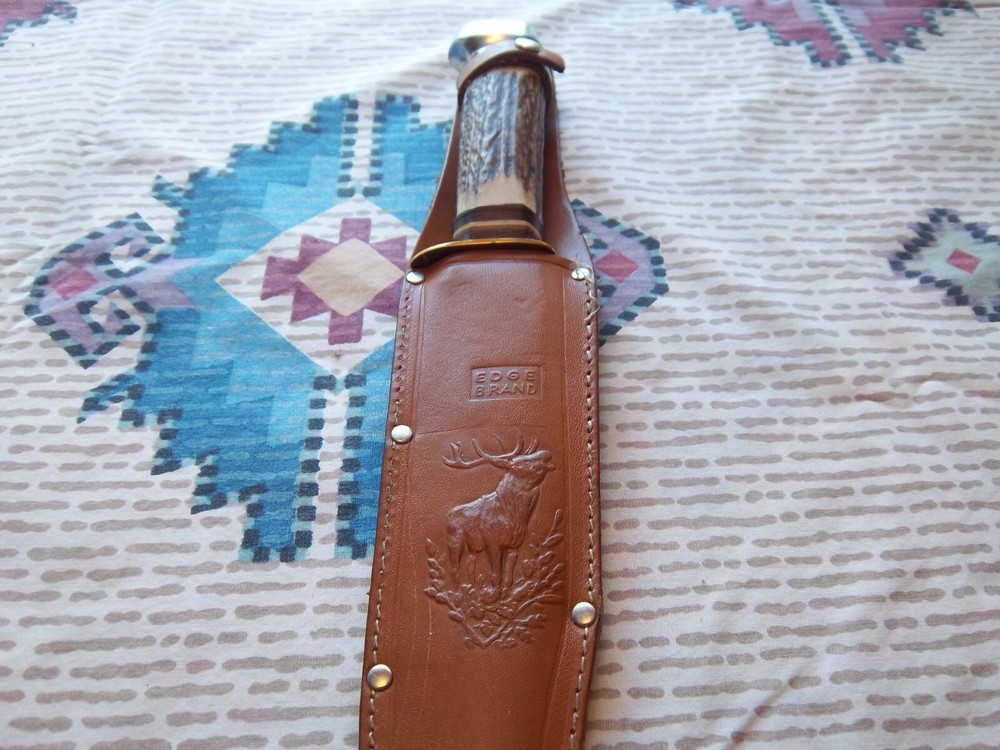 Must be 18 years old or older to buy.Vintage Edge Mark Knife 482 made in Germany, never used or carried, overall length 12",blade 7 1/4", stag handle. Stamped on blade EDGE MARK SOLINGEN GERMANY, 482. Blade has acouple very light scratches,not from use / acouple pepper specs, two small dings on blade edge,can't feel them,hard to see. Not the right sheath has EDGE BRAND, MADE IN GERMANY stamped on it, has been restitched some, also sheath is about 1 1/2" to long for the knife. Shipping cost $15.00