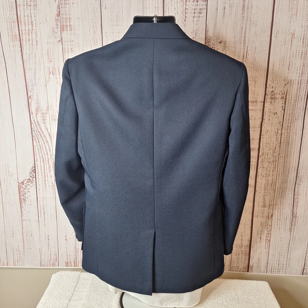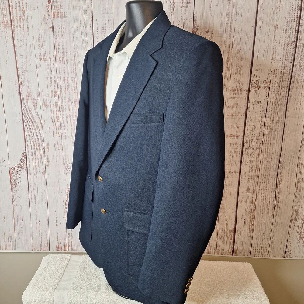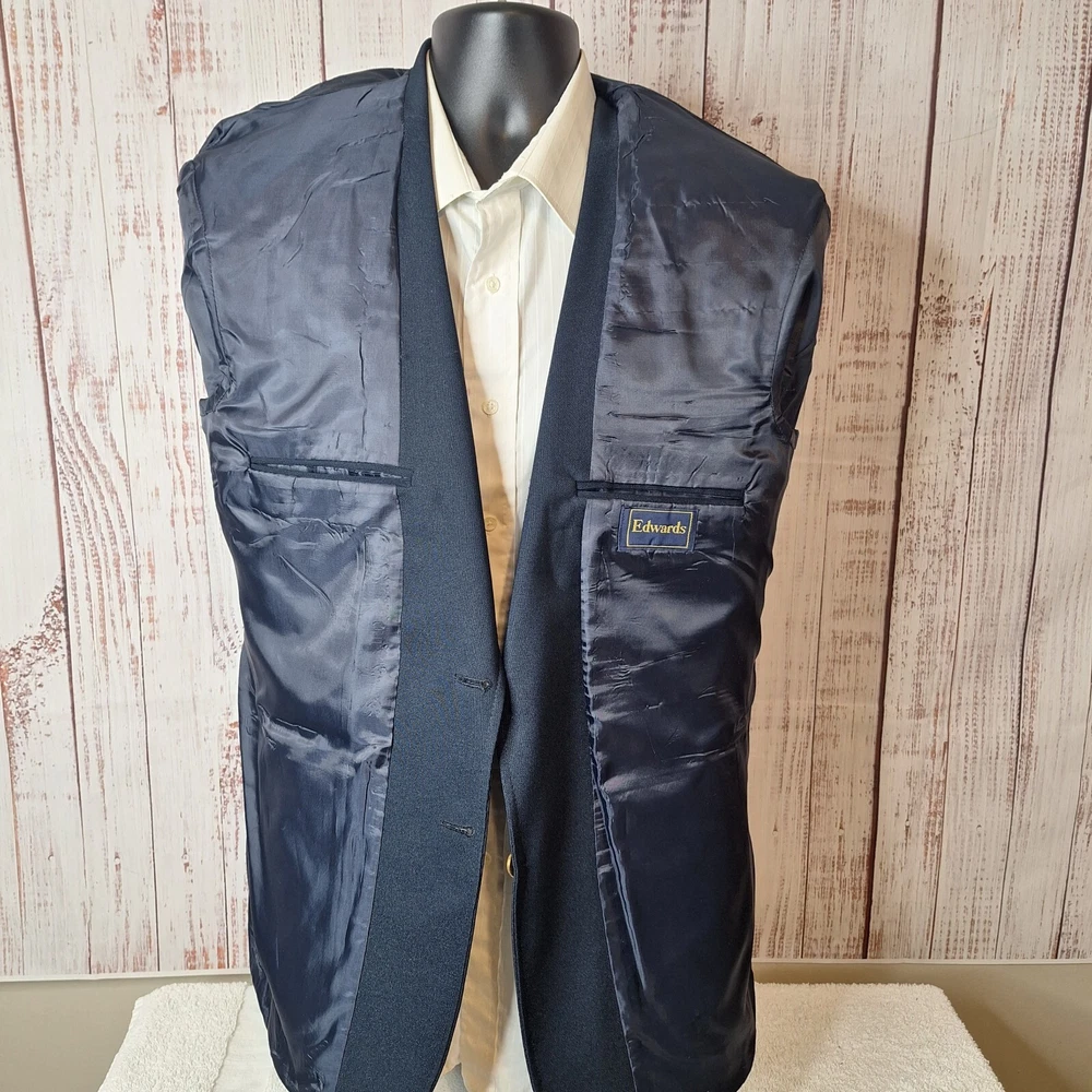 Size Type: Regular Color: Blue Jacket Cut: Single-Breasted Occasion: Business, Casual, Formal, Party/Cocktail, Travel, Wedding Department: Men Jacket Lapel Style: Notch Jacket Vent Style: Single-Vented Brand: Edwards gtin13: Does not apply Jacket/Coat Length: Regular Fit: Regular Personalize: No UPC: Does not apply Material: Polyester, Wool Chest Size: 40 Country/Region of Manufacture: United States Theme: Classic, Designer, Elegant, Modern, Preppy, Wedding Style: Blazer Type: Blazer Jacket Front Button Style: Two-Button Features: Inner Pockets Vintage: Yes Garment Care: Dry Clean Only Jacket Sleeve Button Style: Three-Button Season: Fall, Spring, Summer, Winter Size: 40 Pattern: Solid Handmade: No