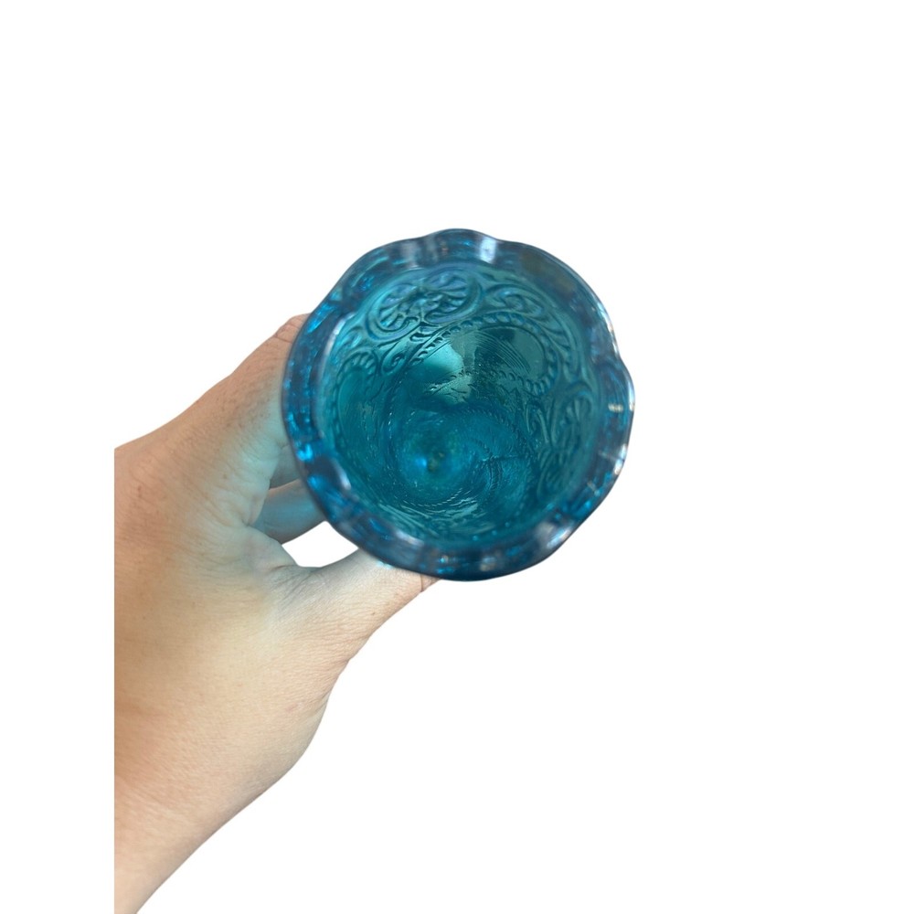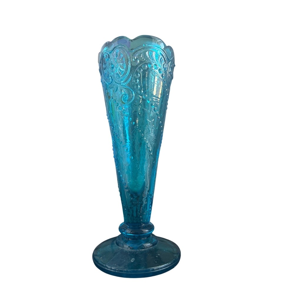 This vintage electric blue glass bud vase is absolutely stunning! The intricate pressed glass design with beading, stars, and scrolls catches the light beautifully. Perfect size for a single stem or small bouquet, adding a gorgeous pop of color to any space. The craftsmanship and vibrant hue make it a real treasure!