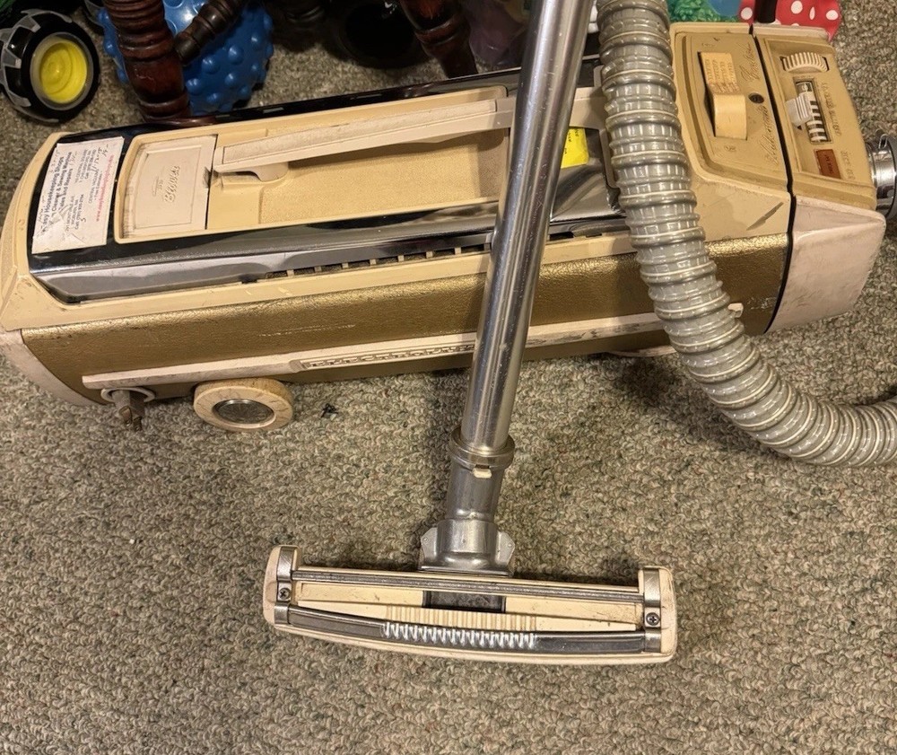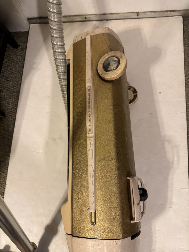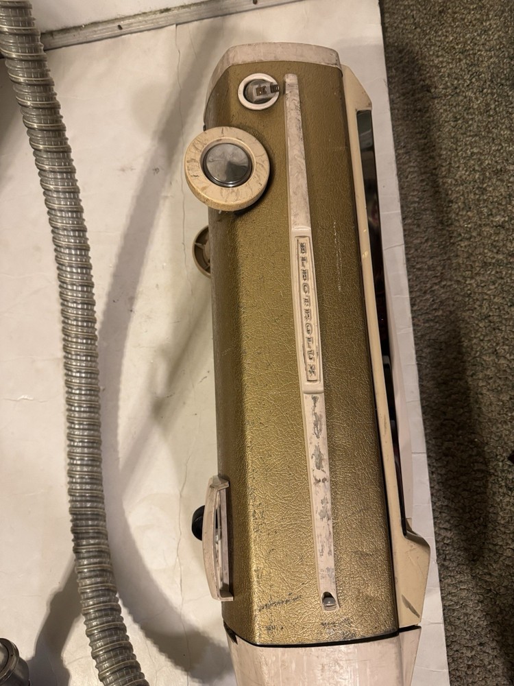 This Vintage Electrolux Canister Vacuum Clean with Attachment in Beige is a classic piece of home cleaning equipment that is bagless and corded, making it easy to use and maintain. With a power of 115W, this unit is lightweight at 20lbs and includes a nozzle and extension wand for added versatility in cleaning different areas of your home. The cord rewind feature adds convenience for storage, and it is designed by the reputable brand Electrolux, known for its quality vacuum cleaners. Made in the United States, this canister vacuum is a reliable and efficient option for keeping your space clean.