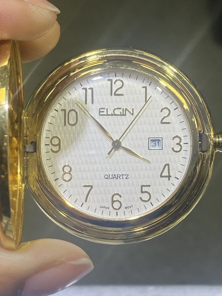 Vintage Elgin Quartz Pocket Watch This pocket watch is in great condition. There are no scratches on the face. It has a date function Japanese movement 2 in diameter US size 16