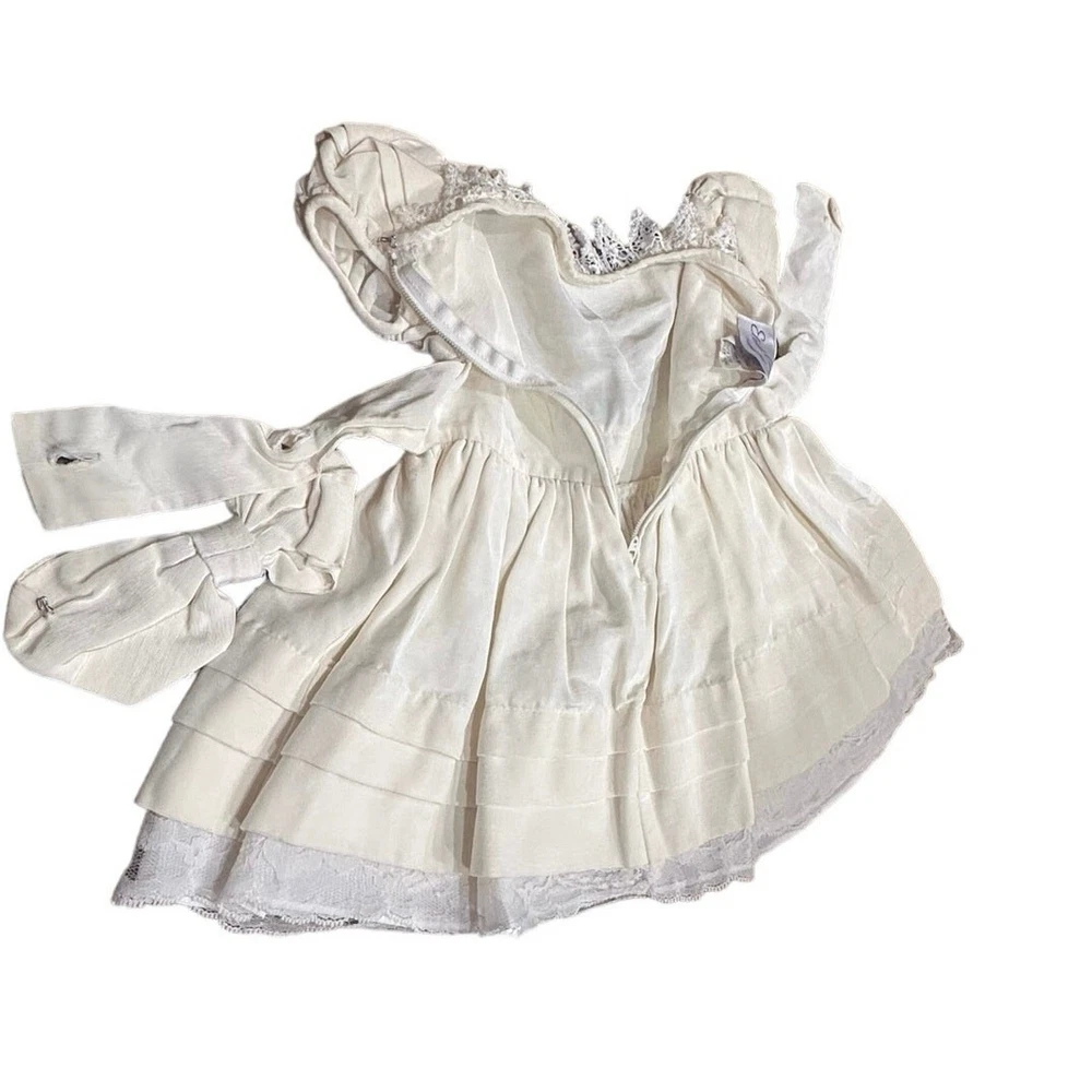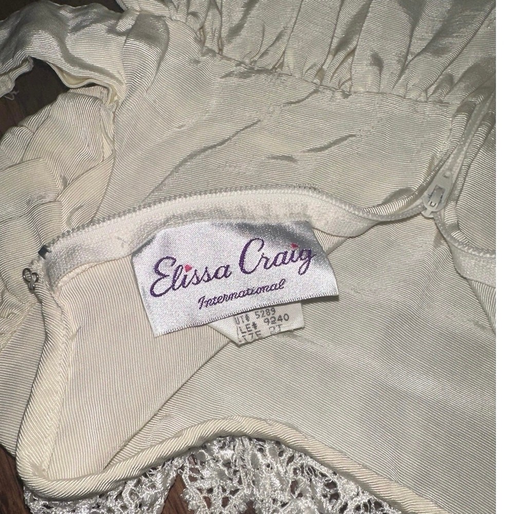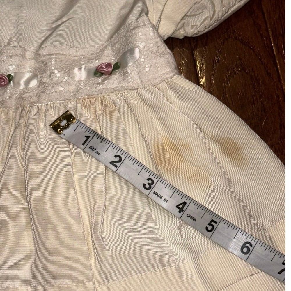 Vintage Elissa Craig International baby dress, size 2T. Classic puff-sleeve design with rose embellishments at the waist, lace detailing at the neckline and hem, and a buttoned bow accent at the back. Fully lined. Back zipper closure works perfectly. This dress is dry clean only. There is visible staining near the waistband and lower skirt, and the dress has not been treated or cleaned. It is wrinkled from storage. Despite the flaws, it is structurally intact with no holes or tears, and the lace trim is still in great condition. Fabric is 50 percent acetate and 50 percent cotton with a 100 percent polyester lining. This piece would be lovely for a vintage-themed photo shoot, special occasion, costume, or collector’s display. Priced to sell. Please review all photos and ask any questions before purchasing. I need it gone.