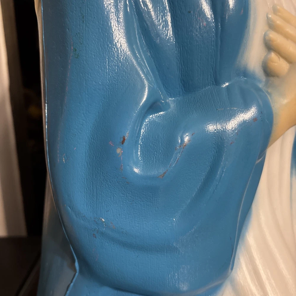 The Vintage Empire Blow Mold Christmas Lighted Mary for Nativity Set is a 26" plastic figure depicting Mary, the Virgin, in a 3-dimensional shape. It is designed for indoor and outdoor use, with a blue and white color scheme that adds a classic touch to any holiday decor. This original Mary Blow Mold from EMPIRE USA features a corded power source and can be cleaned with a damp cloth for easy maintenance. Perfect for adding a religious element to your Christmas display, this vintage piece can be used on the roof, porch, balcony, flower bed, lawn, or bridge. There is a small hole and crack on top of her head. Item is vintage and has signs of use to include paint flakes, scuffs and scratches. Please see pictures. International charges are the buyer’s responsibility. No international returns.