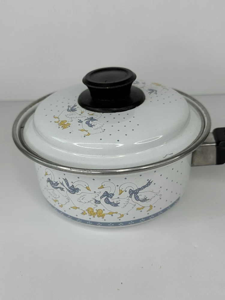 Vintage Enamel Wear 80's Country Geese Goose 6" Sauce Pan with Lid Please see photos for condition. Has some scratches.