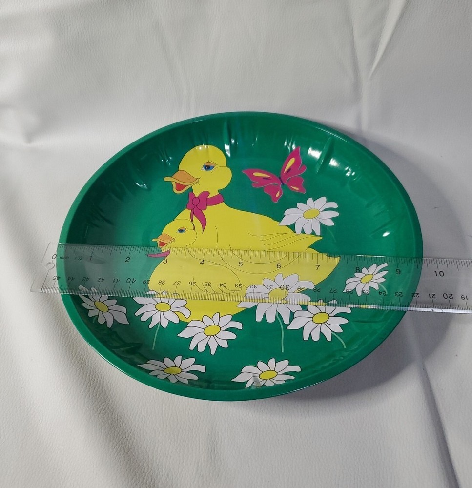This vintage Enesco metal tray is a charming addition to any Easter collection. The tray features adorable ducks, a butterfly, and flowers in a cheerful green color. It was manufactured in China during the 1990s and is in excellent used condition (EUC). Perfect for displaying or serving Easter treats, this tray is made of durable metal and has a size of 10 inches. It is sure to delight collectors and fans of Easter-themed decor alike. Add this Enesco tray to your collection today!