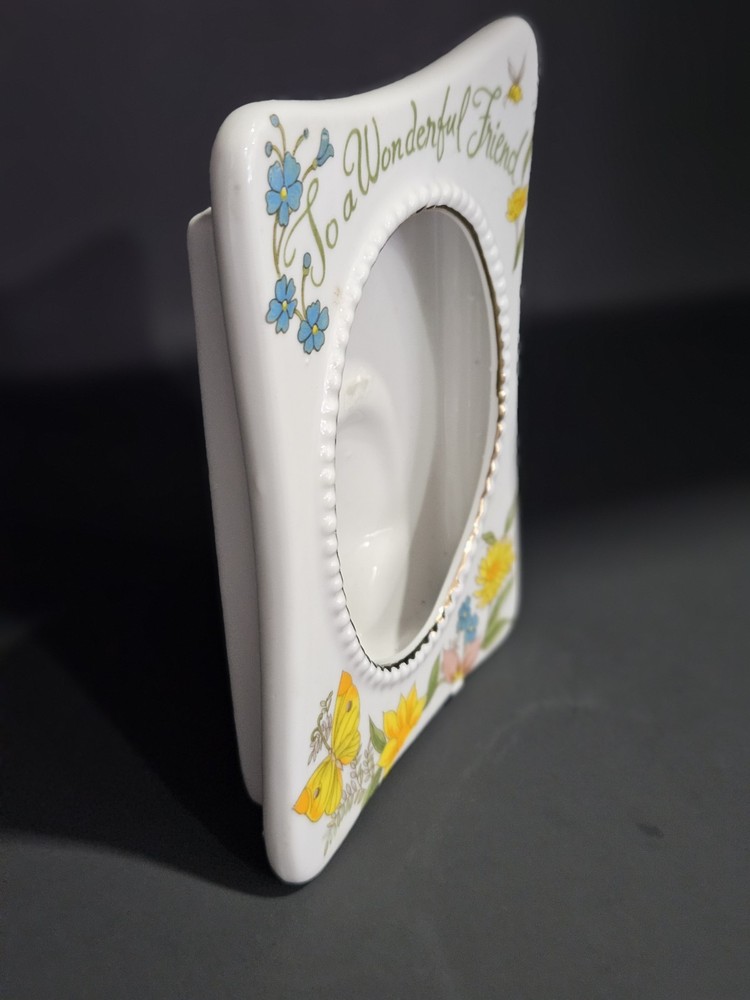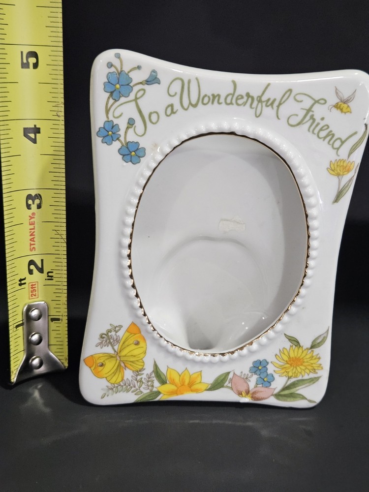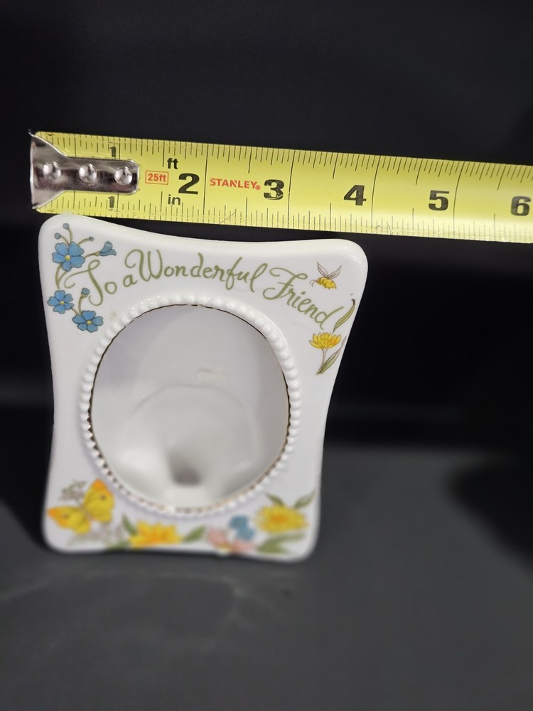 Crafted with care, this Vintage Porcelain Picture Frame by Enesco is an elegant tribute to friendship. Featuring a delicate floral pattern set against a pristine white backdrop, it is designed to showcase a 3.5 x 5 inch photograph, making it an ideal keepsake for treasuring memorable moments. The frame, originating from the late 20th century, boasts a classic rectangular shape with a top-loading photo insertion type, ensuring a snug and secure display. Measuring 5 inches in height and less than 5 inches in width, it promises a perfect fit for your favorite snapshot, adding a touch of sophistication to any room.