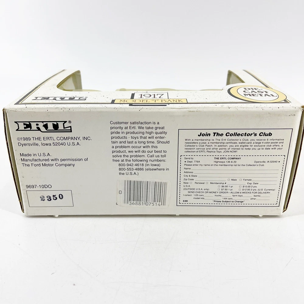 Vehicle Make:FordBrand:ERTLVehicle Type:Delivery TruckFeatures:Advertising Specimen, Limited Edition, Unopened BoxVehicle Year:1917Model:Ford Model TMaterial:DiecastUPC:Does not applyYear of Manufacture:1989gtin13:Does not applyScale:1:25