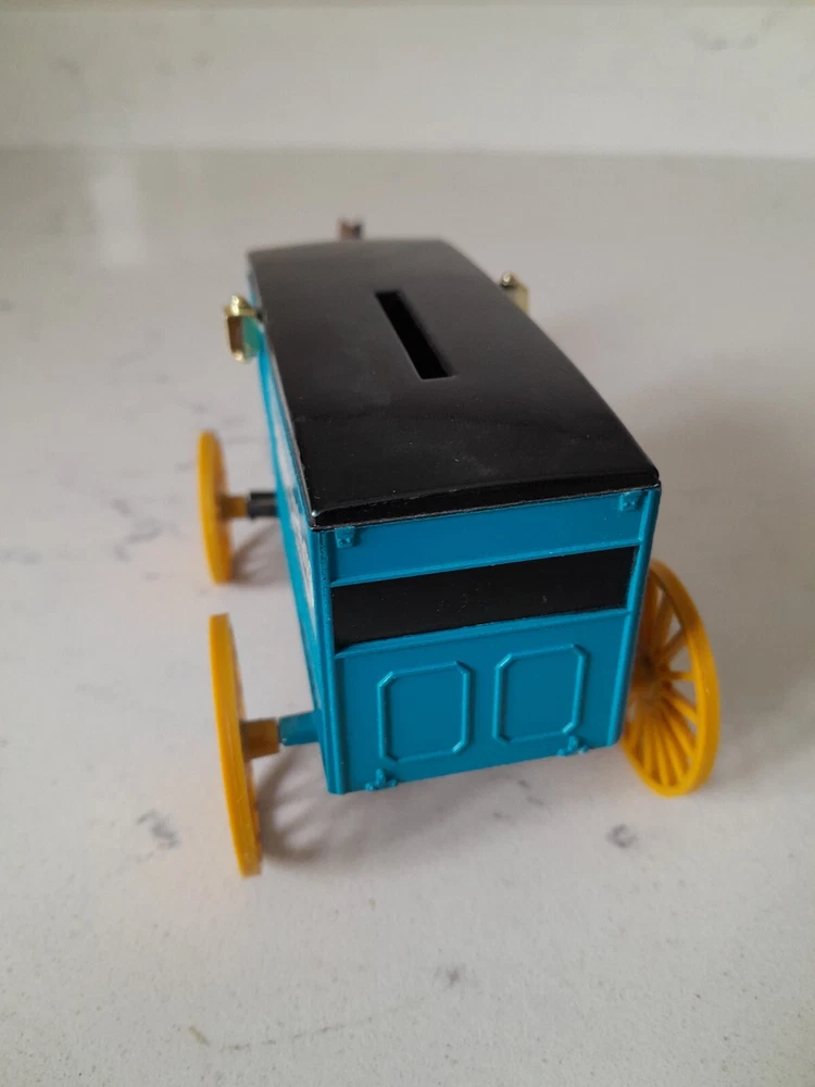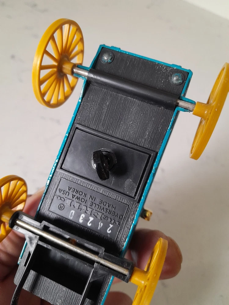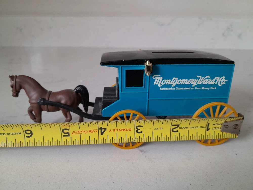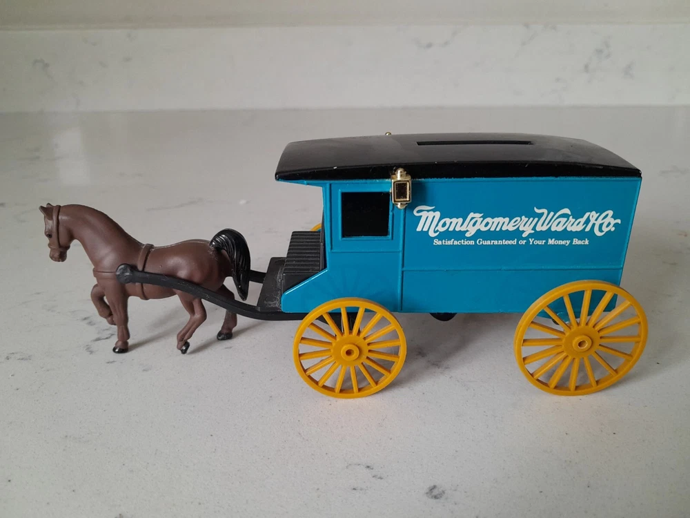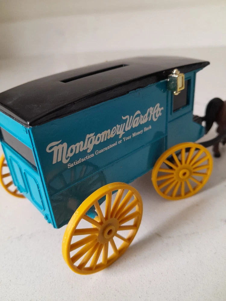 The product is a vintage Ertl Montgomery Ward & Company Delivery Wagon diecast coin bank with key. It is a 1:43 scale model of a 1930 delivery wagon in blue/black colors. The wagon is an advertising theme for Montgomery Ward & Company and was manufactured in 1993 in Korea. It is made of diecast material and serves as a collectible toy vehicle.