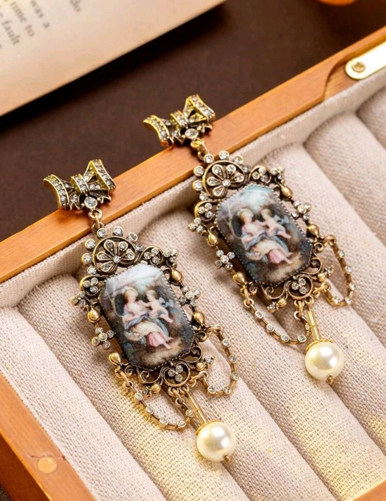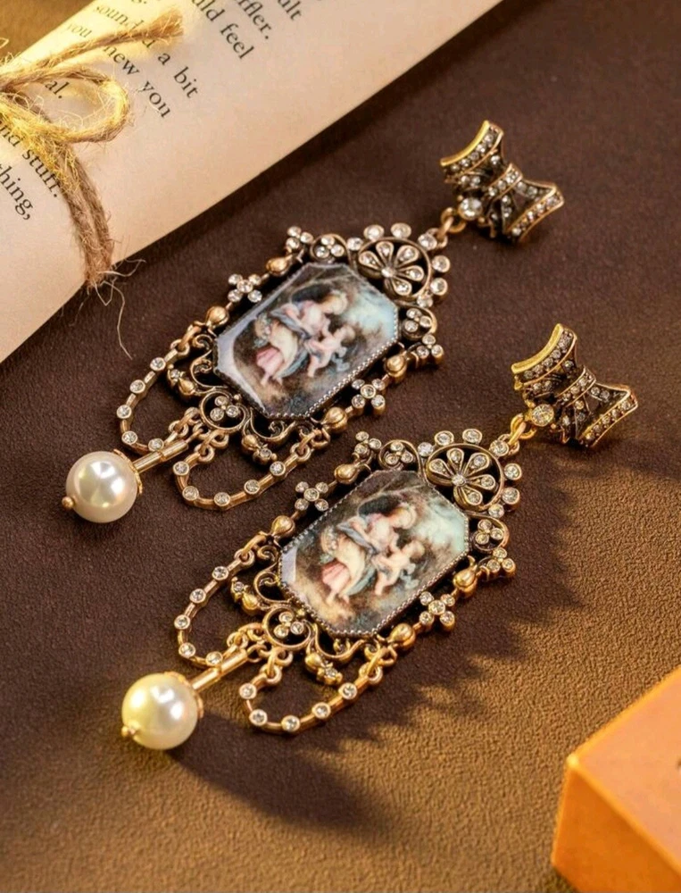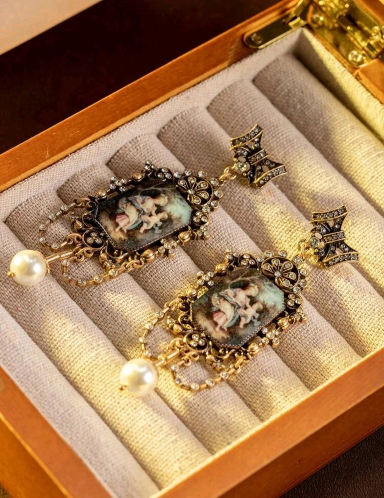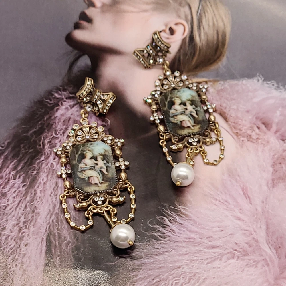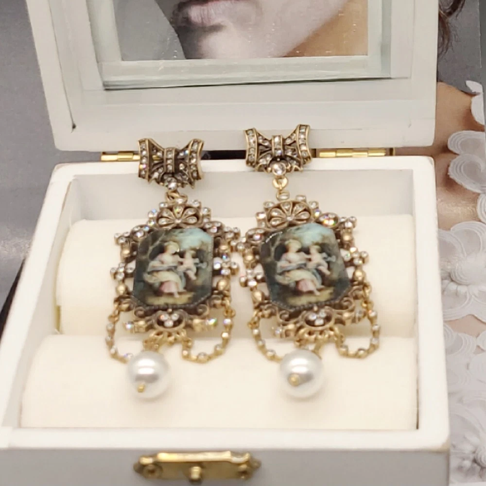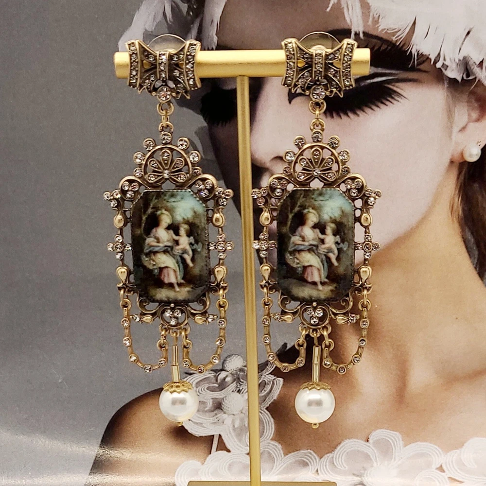 Vintage Estate Palace Crystal Pearl Oil Painting Gold Drop Earrings