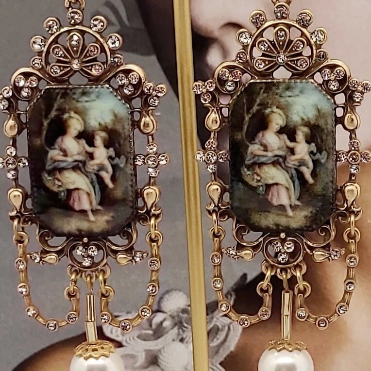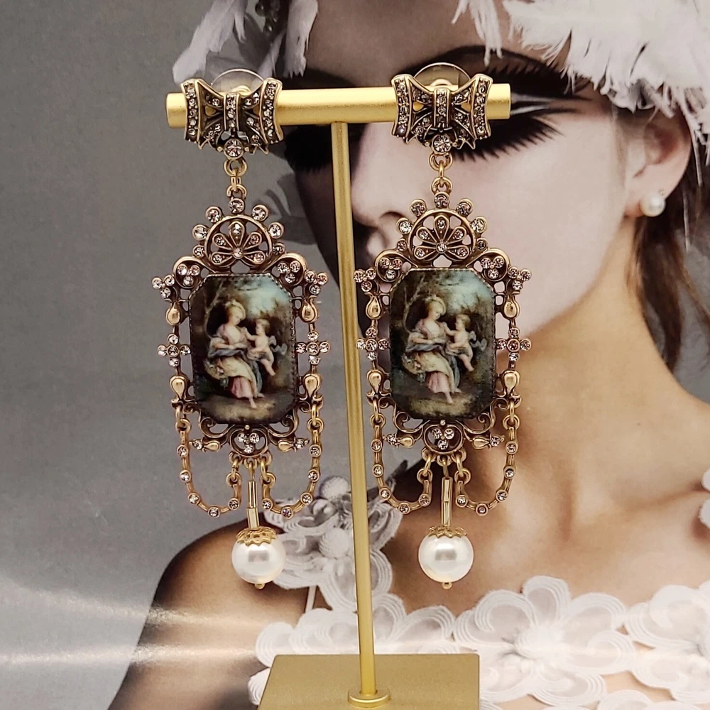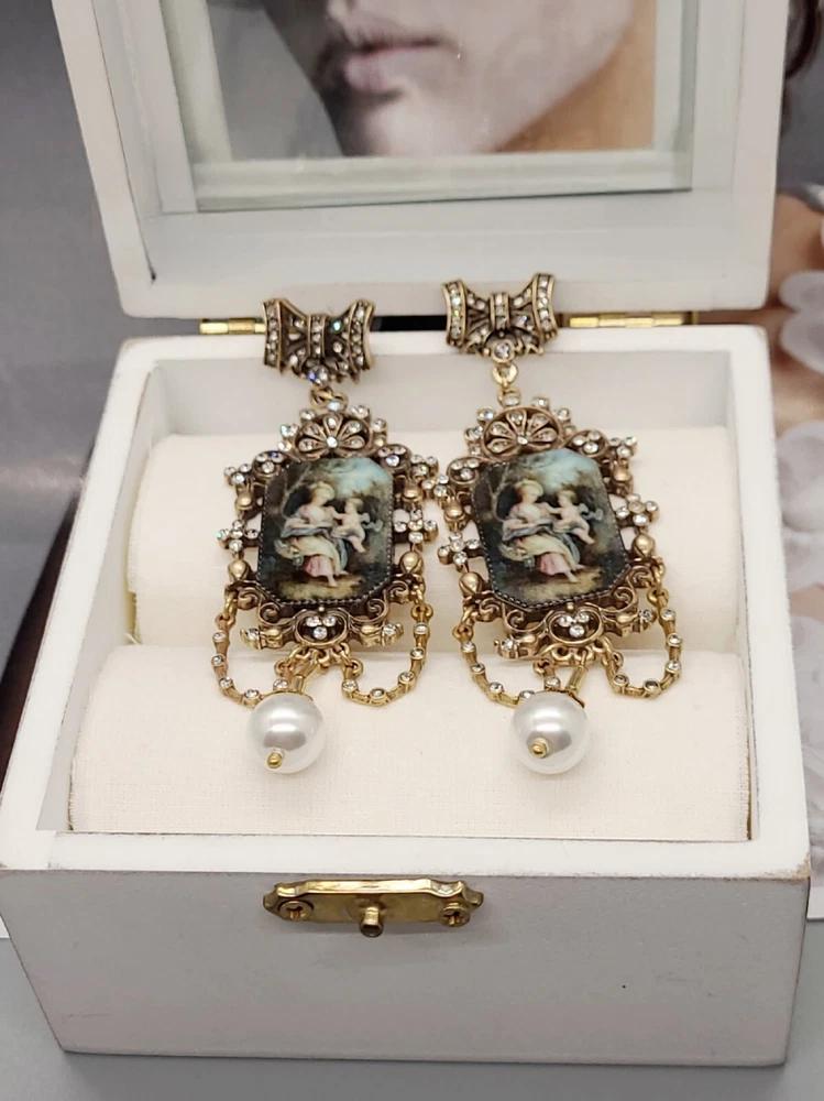 These vintage earrings are a true masterpiece. The gold drop design is beautifully crafted with natural crystals and pearls. The earrings are made of yellow gold plated metal and have a butterfly closure for easy wear. The earrings are perfect for any occasion, whether it's an engagement, anniversary, or birthday. The round crystals are the main focus of the design, with beautiful accents of pearls and a palace theme. These earrings will surely make you stand out in any crowd. Vintage Estate Palace Crystal Pearl Classical Oil Painting Gold Drop Earrings 3.66" Length 1.66 Width Post backs Gold Plated Crystal