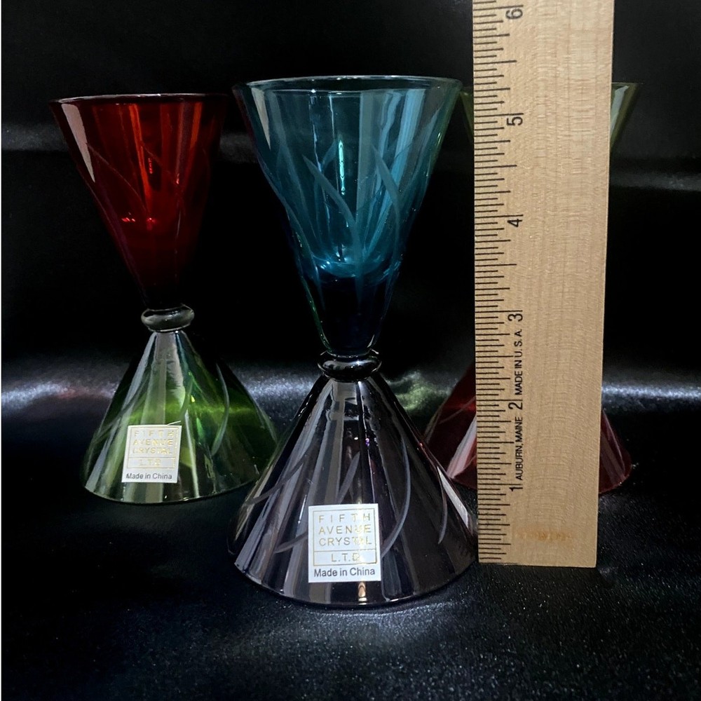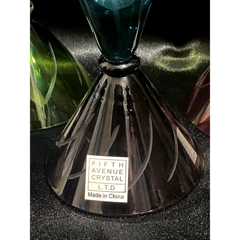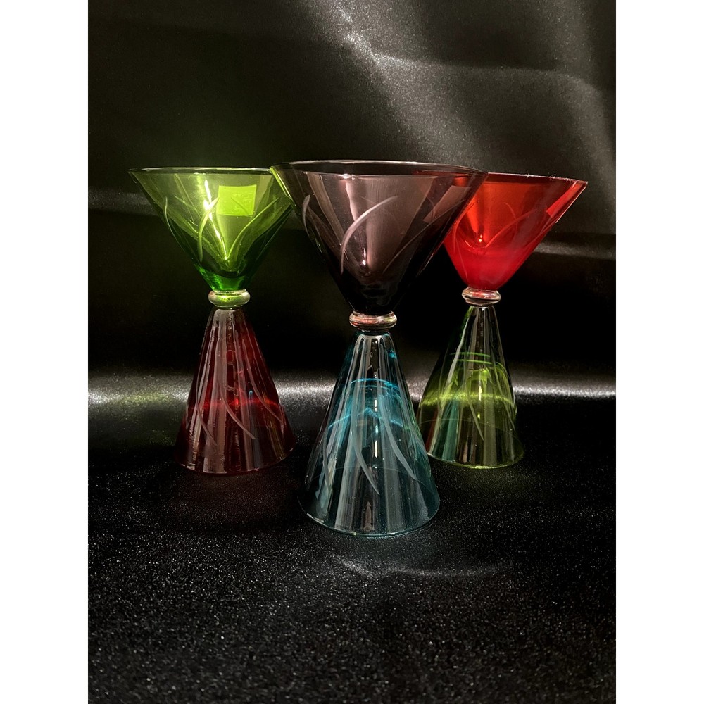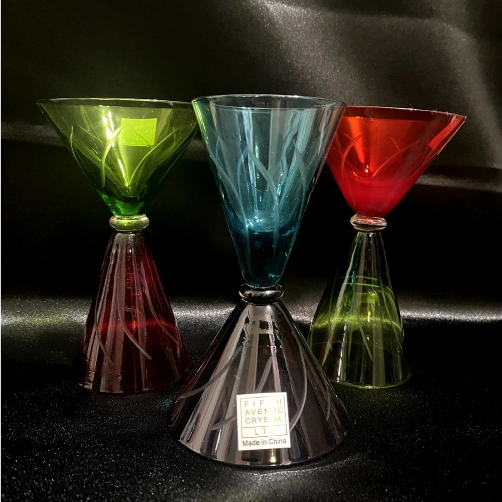 Brand: Fifth Avenue Crystal Product Name: Trio of Colored Martini Glasses Year of Production: Circa early 2000s Significance: This playful trio of martini glasses by Fifth Avenue Crystal blends retro flair with modern design. Featuring rich jewel tones (red, teal, and lime green) with clear etched swirling stems, each glass is a showpiece of cocktail barware style. Manufactured in China, these glasses highlight the brand's focus on affordable elegance with bold, Art Deco–inspired lines. They are ideal for serving drinks or as vibrant shelf décor. Condition: Pre-owned, very good condition. No chips, cracks, or discoloration. Labels intact on each piece.