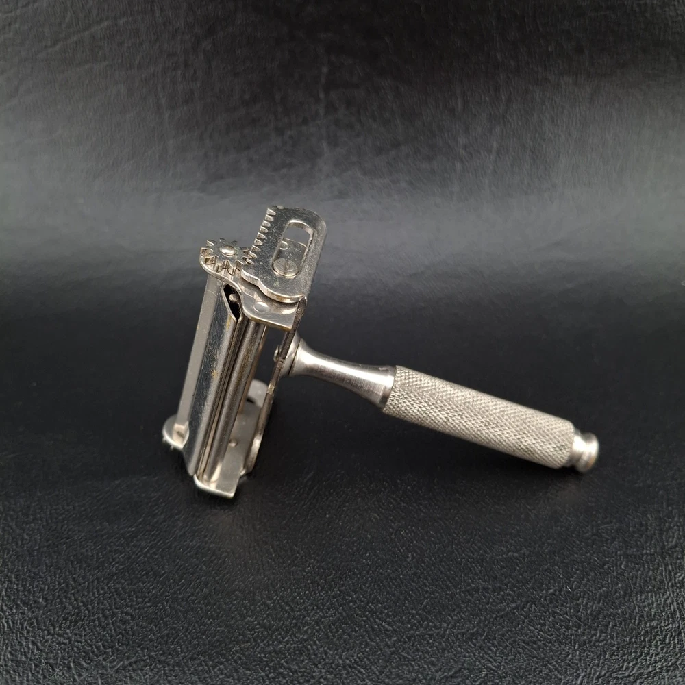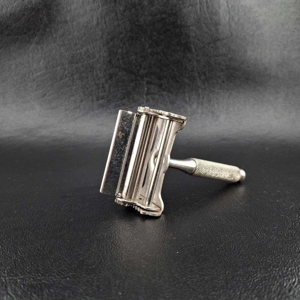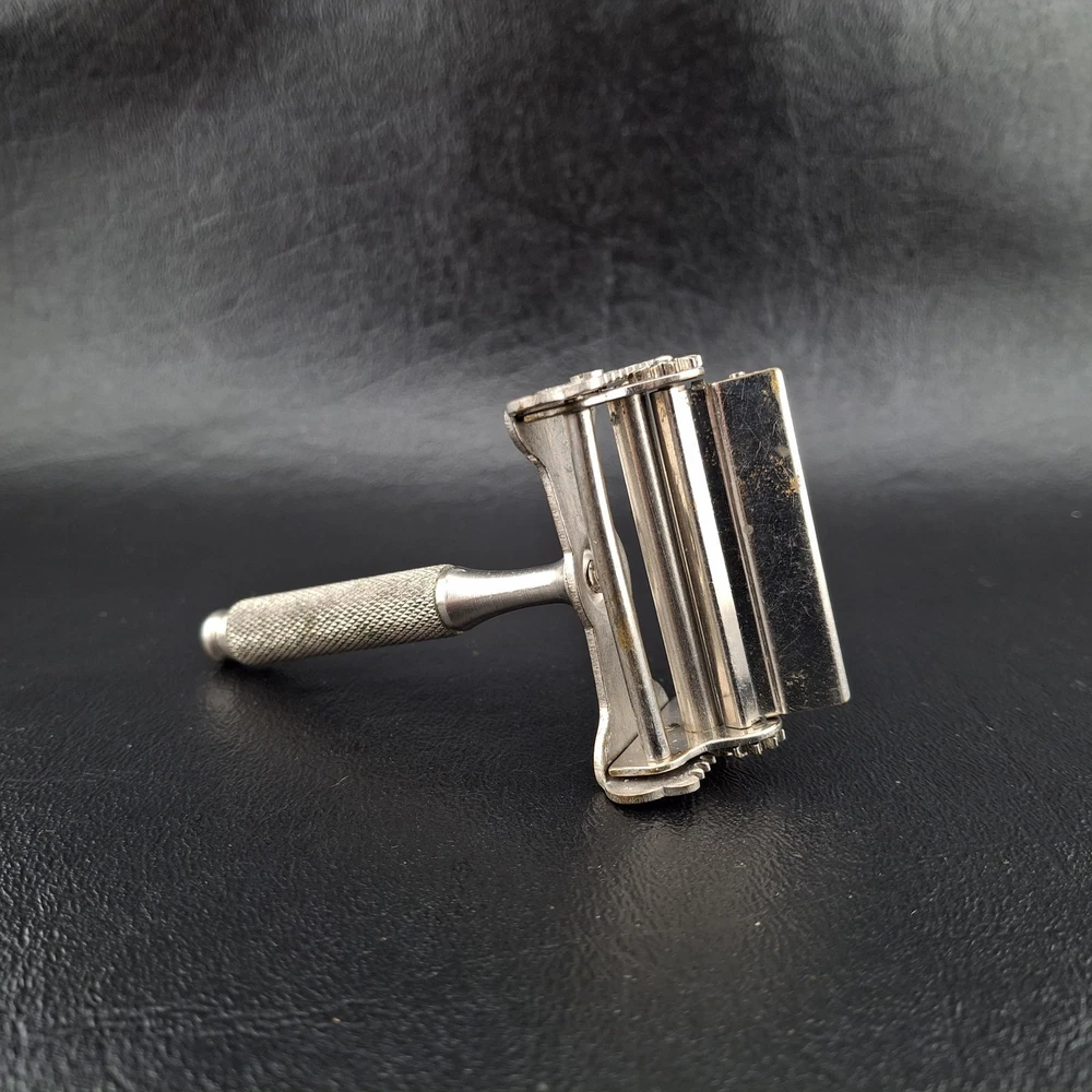 This is a vintage Ever-Ready Razor Blade Stropper, a piece of shaving memorabilia from the United States. It is a single-edge safety razor stropper made of nickel-plated brass, designed for maintaining and honing razor blades for extended use. The item is a shaving collectible providing a glimpse into the traditional shaving practices of yesteryear with its durable metal construction and historical charm. Item #40