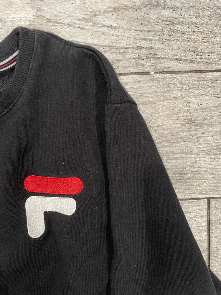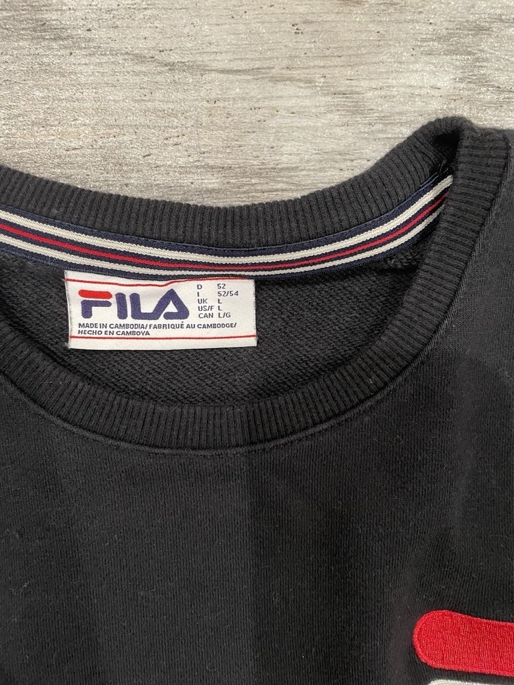 This Vintage FILA Sweatshirt is a stylish pullover in men's size large with a classic black color and crew neckline. Made from a blend of polyester and cotton in a comfortable jersey fabric, this sweatshirt features the iconic FILA logo embroidered on the front, giving it a retro 90s vibe. Perfect for all seasons, including winter, fall, and spring, this sweatshirt is machine washable and has a regular fit, making it a versatile and timeless addition to any wardrobe.
