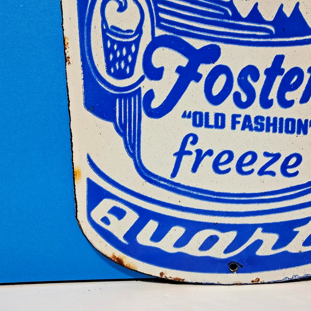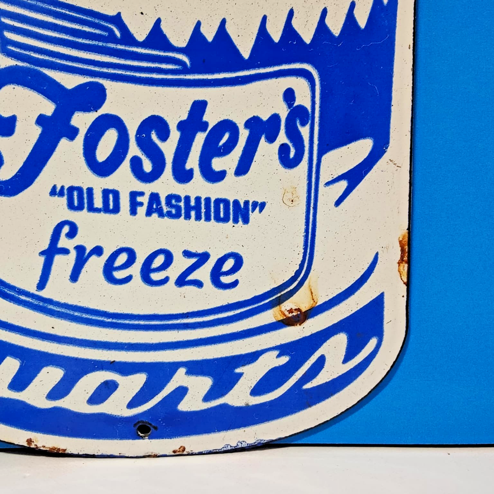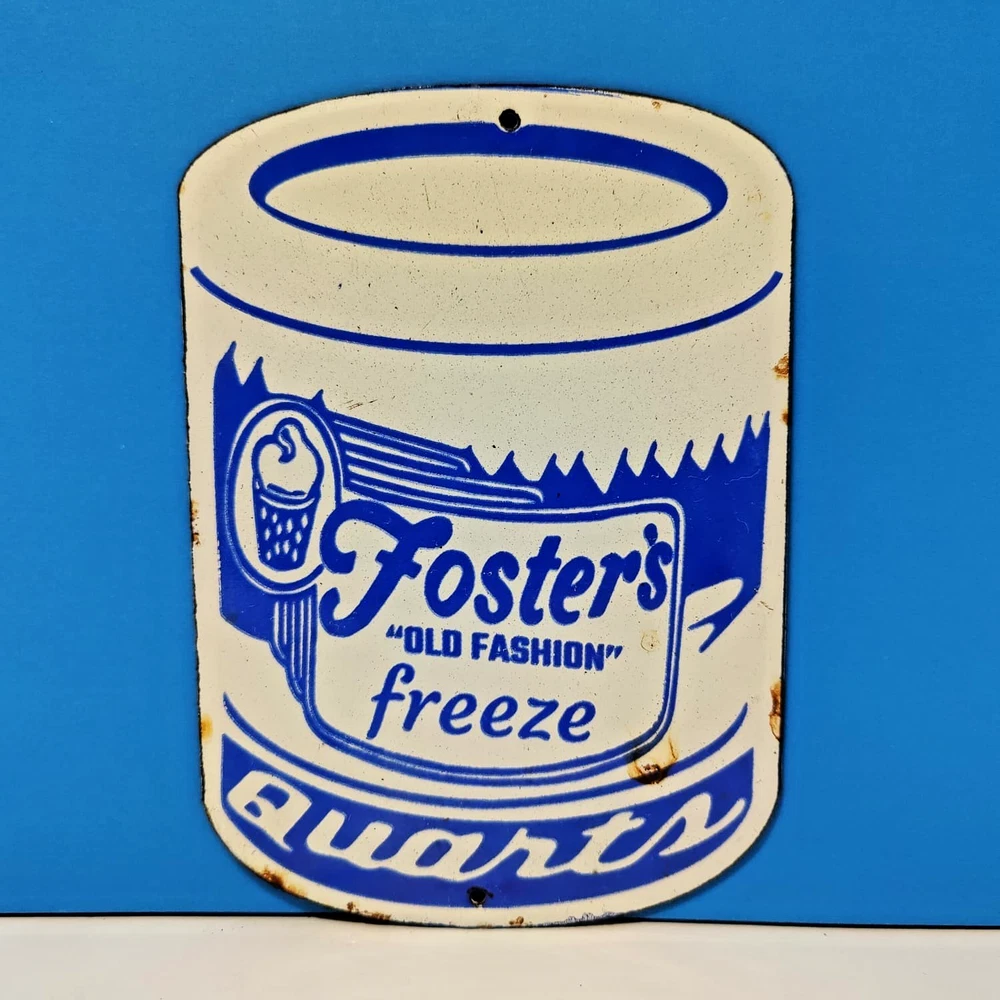 The product is a vintage FOSTER'S FREEZE OLD FASHION porcelain enamel sign measuring 7" x 5" inches. This original sign features a multi-color design with a gas and oil theme, representing a piece of Americana advertising history. Made in the United States, this collectible item is a featured refinement among vintage sign collectors, showcasing the charm and nostalgia of a bygone era in the fast-food industry.
