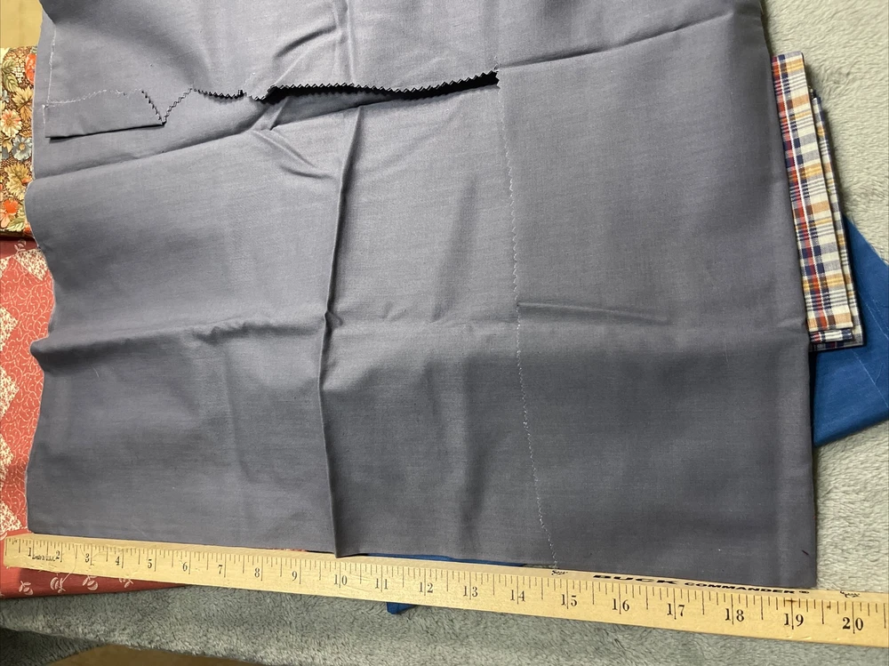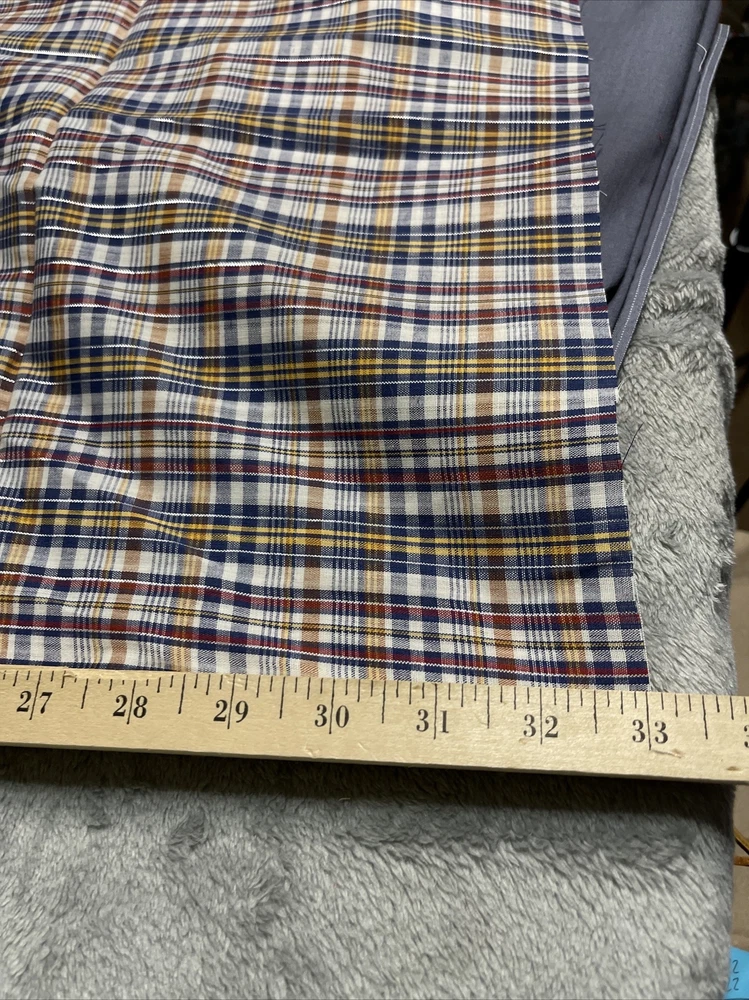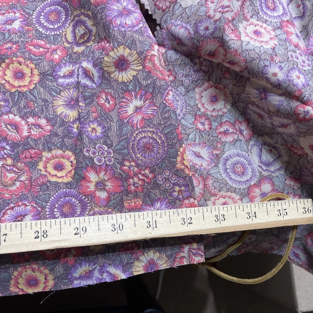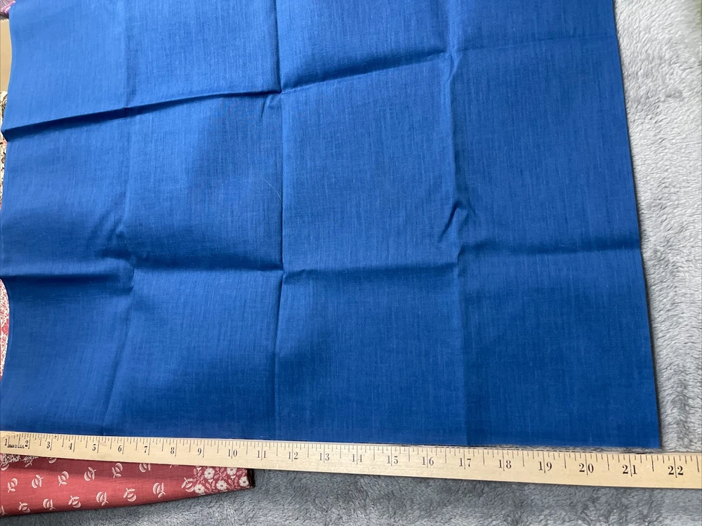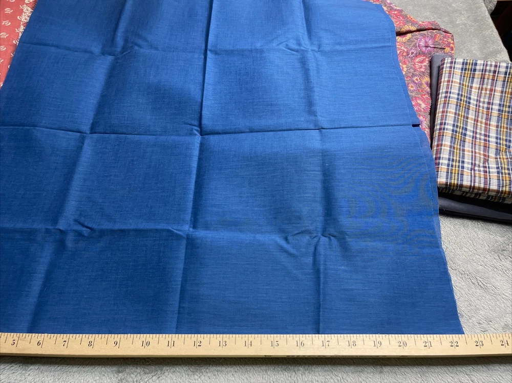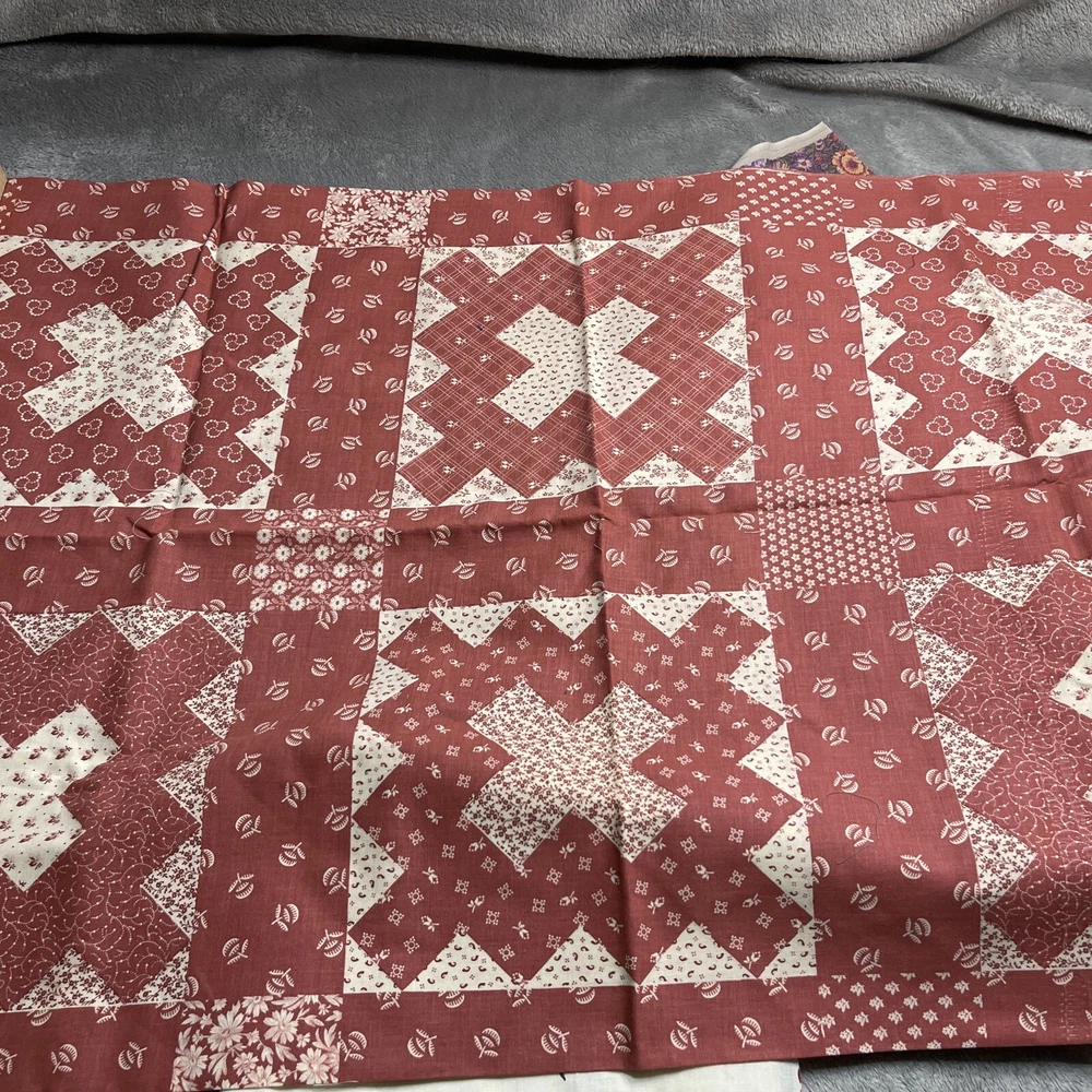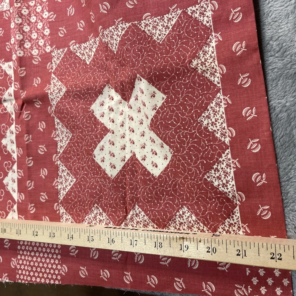 This vintage fabric is a charming addition to any collection. It features a delightful floral and striped pattern in multicolor shades, perfect for all occasions. Made of light cotton material, it's suitable for quilting projects with a country style theme. The fabric is from the 1980s and comes in various sizes. It's an original piece and perfect for those who appreciate the beauty of vintage textiles. Add this to your linens and textiles collection today! Gray/Blue fabric is 39 inches x 44 inches with a section of 15 inches x 24 inches cut out. Stripe with silver stripe fabric is 33 inches x 44 inches. Bright Blue fabric is 22.5 inches x 44 inches. Square patterned fabric is 22 inches x 22 inches. Tan fabric is in two strips measuring 31 inches x 10 inches each. Pink star fabric is 36 inches x 44 inches. The country squares are 9 inches x 9 inches for a total of 9 squares. The floral fabric is 86 inches x 20 inches with a 11 inch x 9.5 inch piece cut out and a 32 inch x 23 inch section making it an L shape piece of fabric.