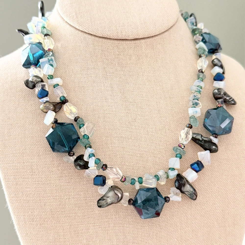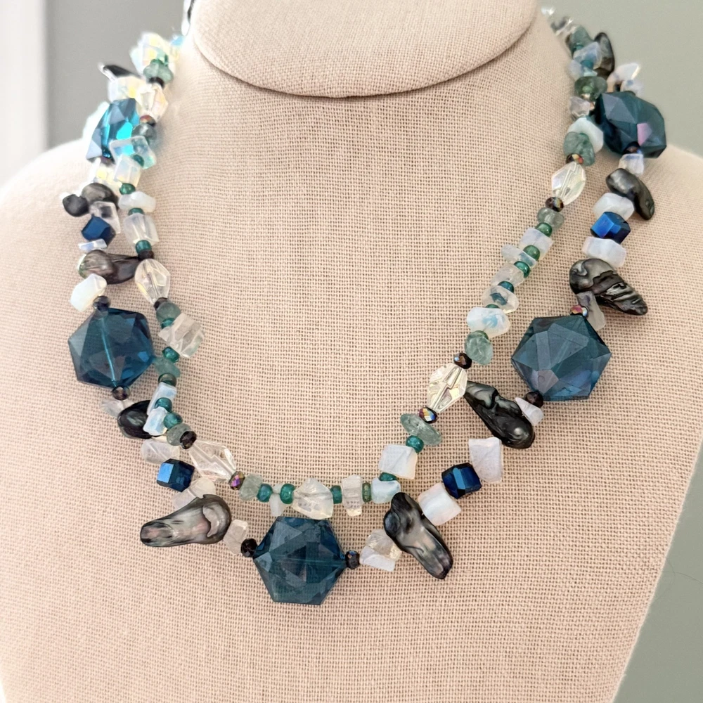 Lovely Vintage Faceted Blue Crystal & Opalite Double Strand Abalone Statement Necklace Length: 18" Very good vintage condition. - Fast shipping, I ship the same or next business day! I also combine shipping. - Thank you so much for shopping with me and please check out my other jewelry listings, I post new pieces daily!