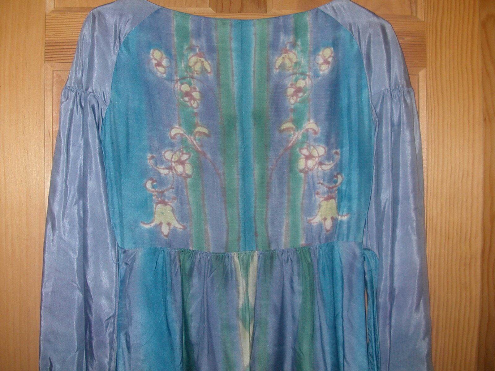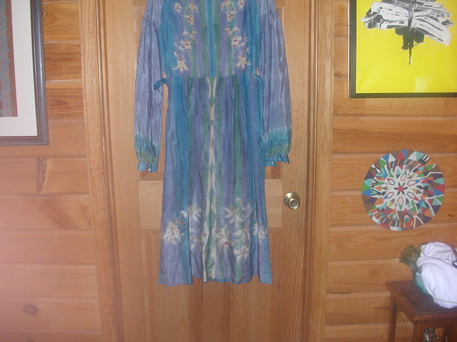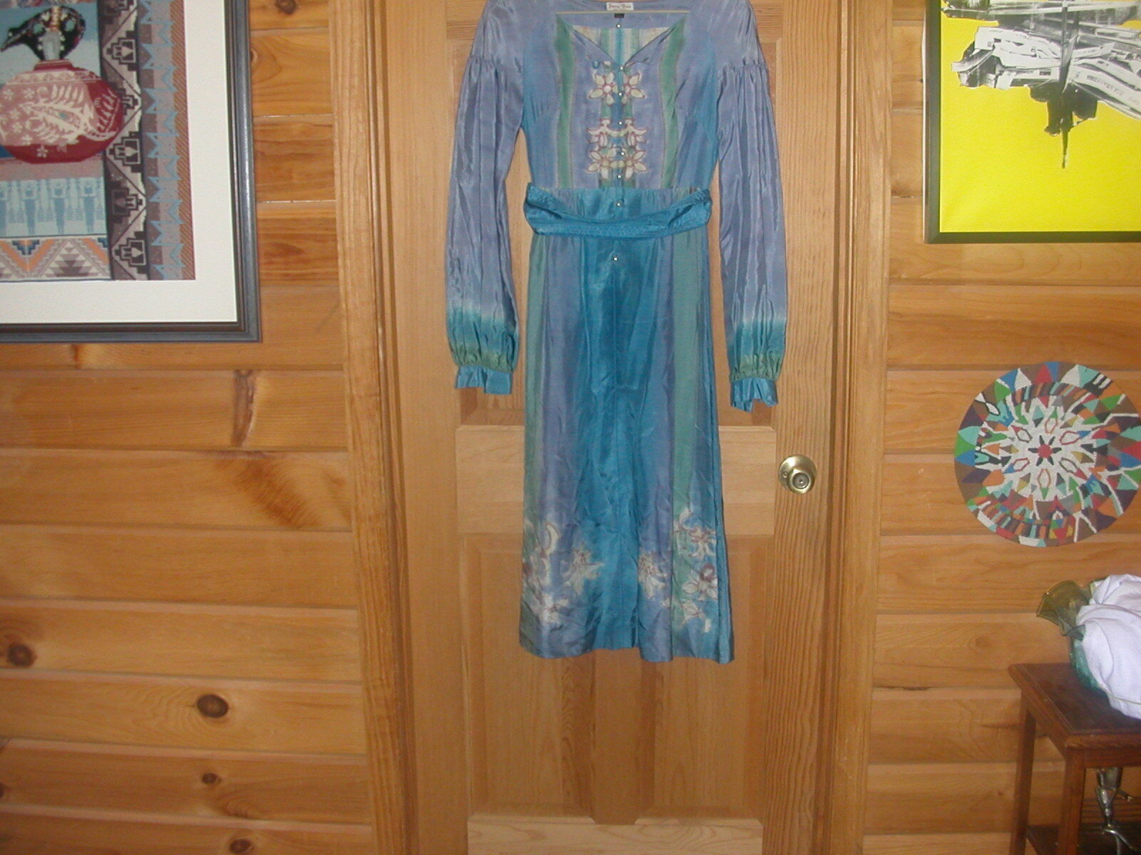 Fanny Buss Dress - wearable art - Dress is hand printed on 100% silk. Fanny Buss was a designer and dressmaker in New Zealand. You can research her life and work on the web. Her clothing is on exhibit in museums in New Zealand and Wikipedia gives her biography. There are also a number of examples of her work  on the web.  This dress is an empire style with a belt that snaps in the back. The sleeves fall from the shoulder lower on the upper arm and are a bit gathered. The dress is printed  all around - some with a floral design and some with a  sort of tie dye effect. The top front portion has a row of pearl buttons down the front as well as on the cuffs.  and I do not know if the dress has been used much - it is in excellent condition and still has an extra pearl button attached at the neck label. Not sure of the size but the bust is 34", the waist is 28" and skirt gathers and flares just a bit with 40" hip measurement. The dress needs pressing and should be professionally cleaned and pressed  as needed. The dress comes to about mid calf. I will ship this dress in a strong box with acid free tissue paper.