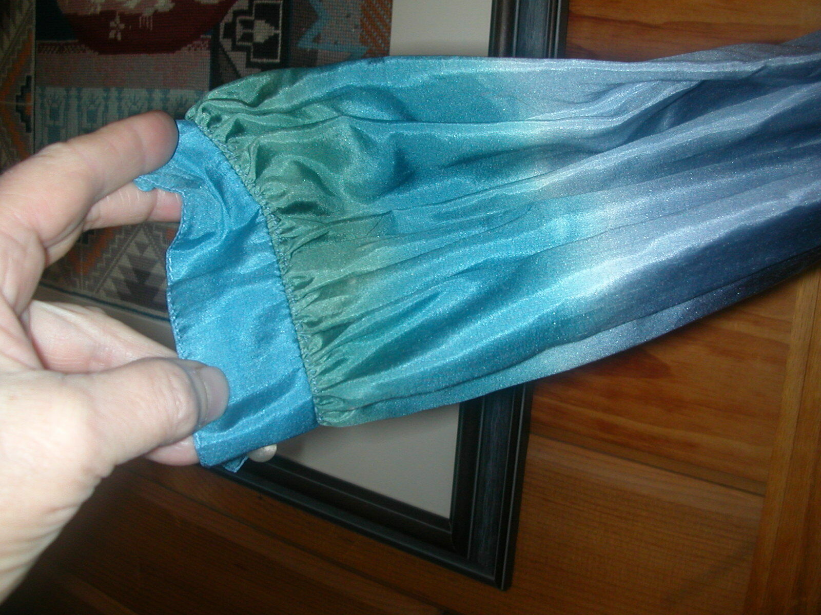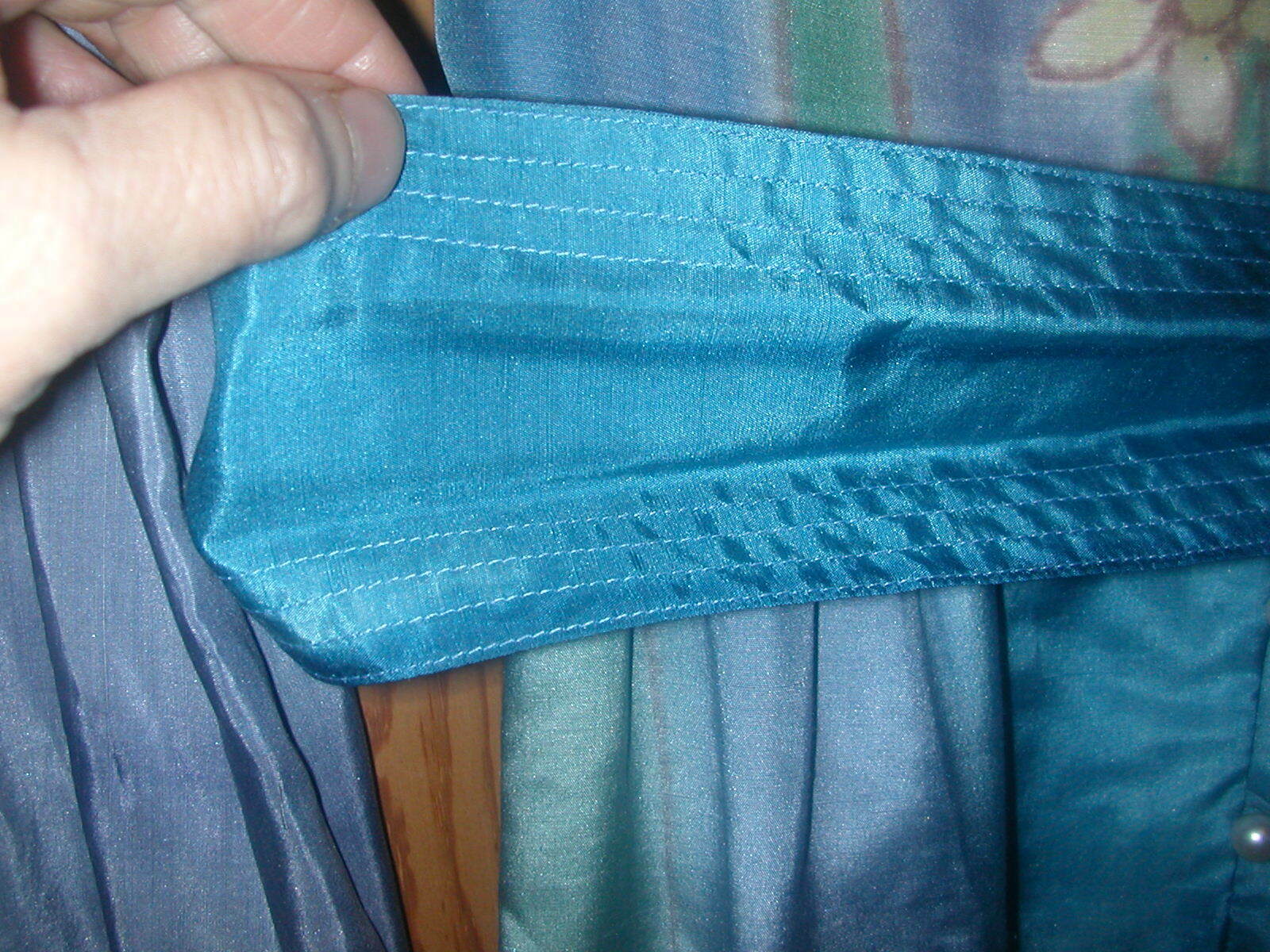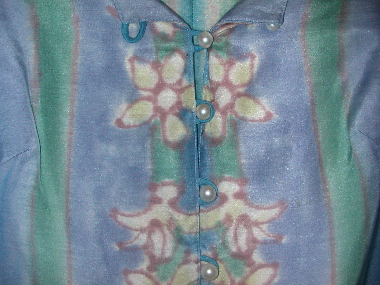 Fanny Buss Dress - wearable art - Dress is hand printed on 100% silk. Fanny Buss was a designer and dressmaker in New Zealand. You can research her life and work on the web. Her clothing is on exhibit in museums in New Zealand and Wikipedia gives her biography. There are also a number of examples of her work  on the web.  This dress is an empire style with a belt that snaps in the back. The sleeves fall from the shoulder lower on the upper arm and are a bit gathered. The dress is printed  all around - some with a floral design and some with a  sort of tie dye effect. The top front portion has a row of pearl buttons down the front as well as on the cuffs.  and I do not know if the dress has been used much - it is in excellent condition and still has an extra pearl button attached at the neck label. Not sure of the size but the bust is 34", the waist is 28" and skirt gathers and flares just a bit with 40" hip measurement. The dress needs pressing and should be professionally cleaned and pressed  as needed. The dress comes to about mid calf. I will ship this dress in a strong box with acid free tissue paper.