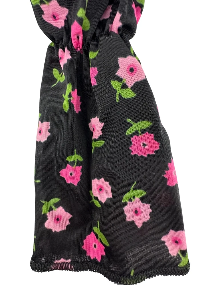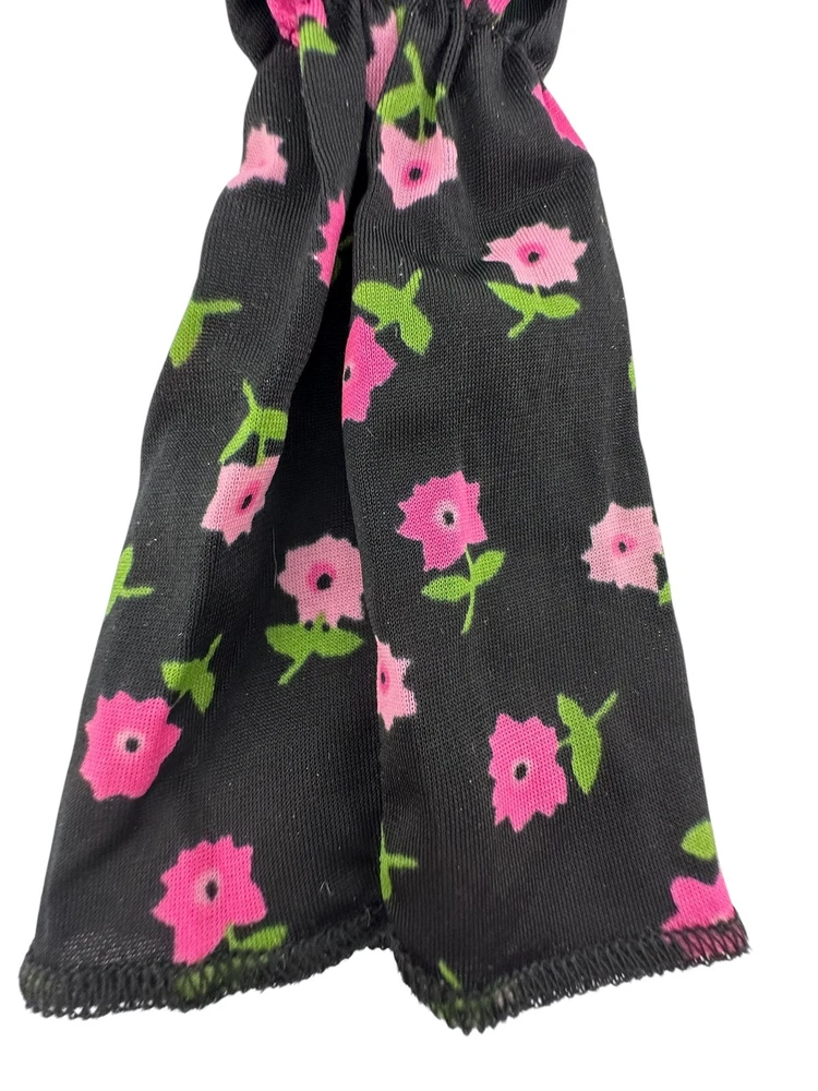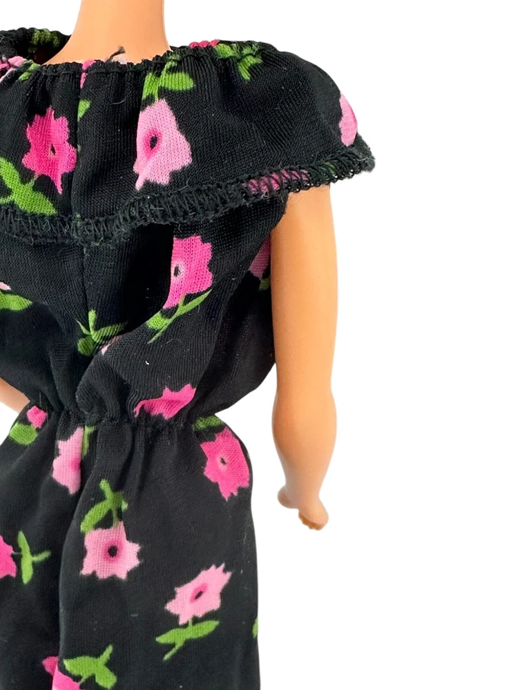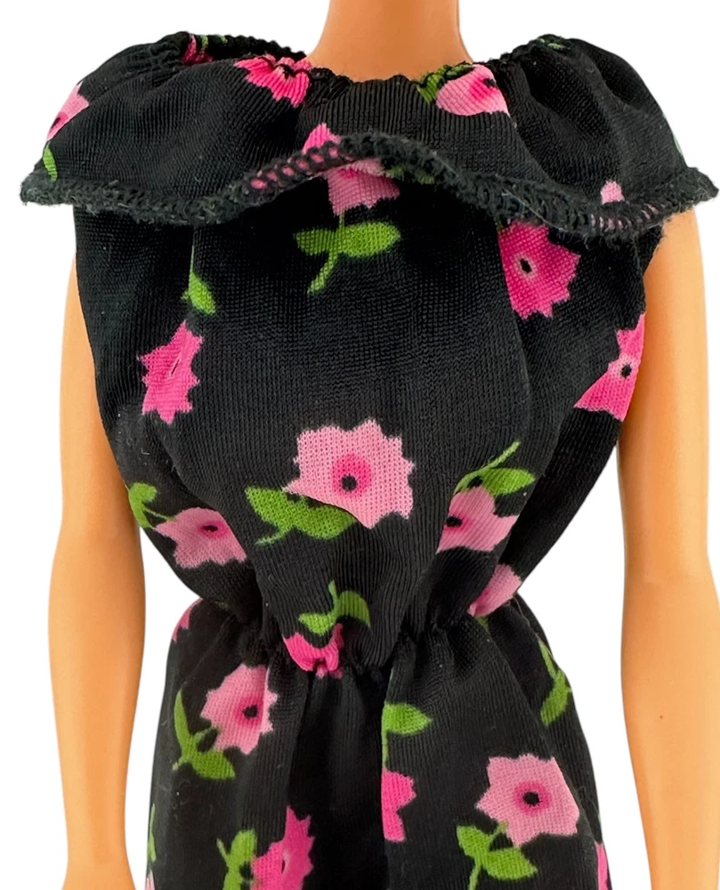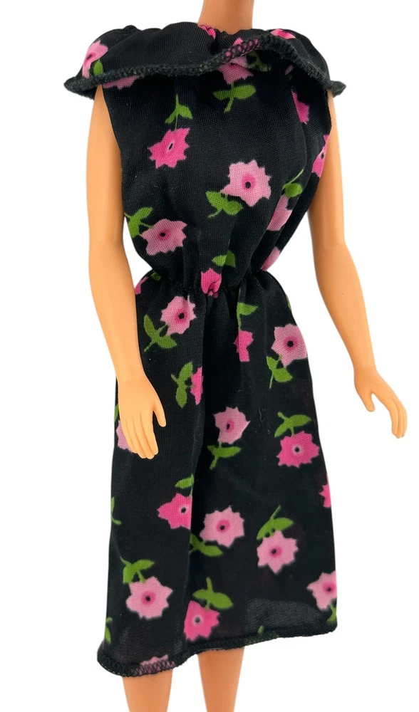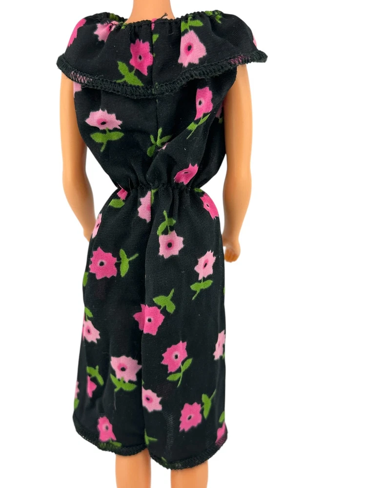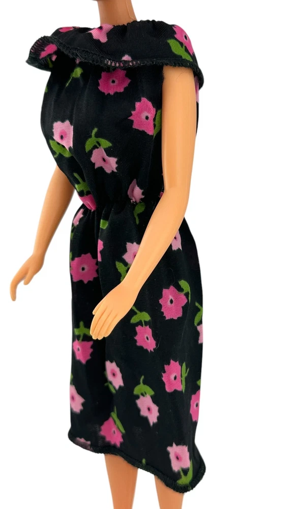 Vintage Fashion Doll Summer Dress Black Flowers Floral Ruffle Off Shoulder Unbranded, but looks like the same pattern as the … 1978 Superstar Barbie Doll Christie Fashion Favorite #1401 Summer Dance …look it up. Same fabric pattern, but different style of dress. See pics. Doll NOT included.