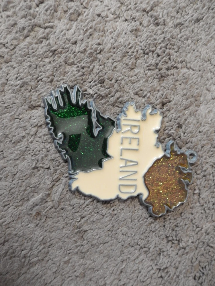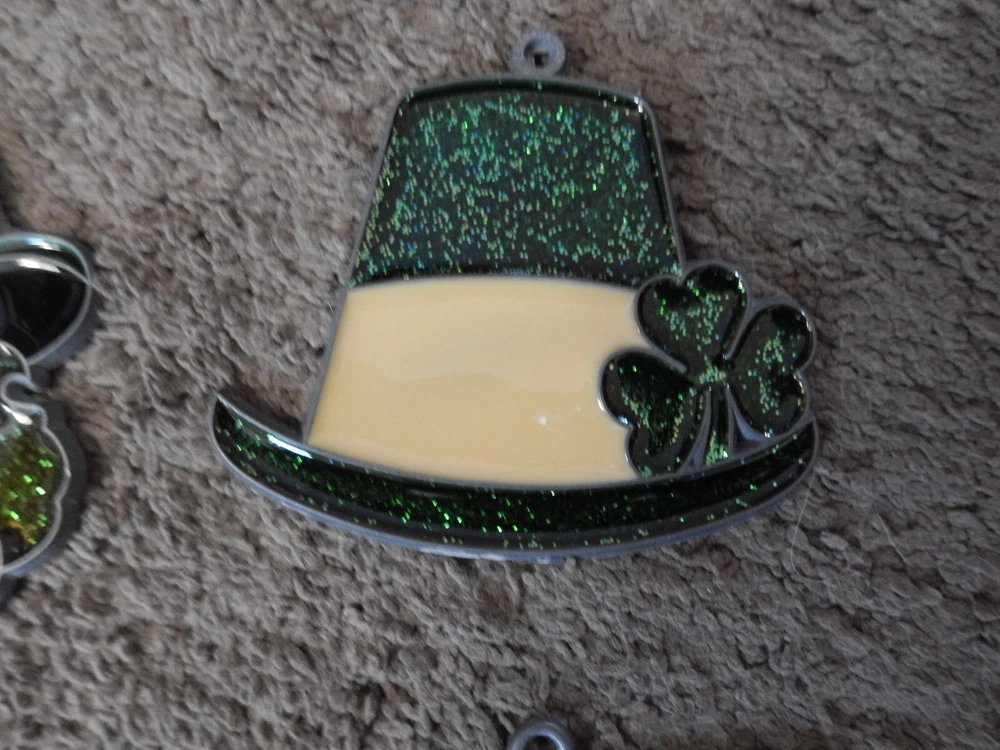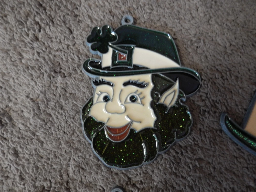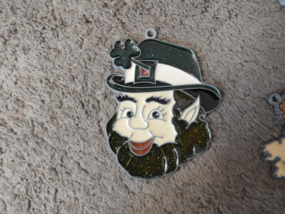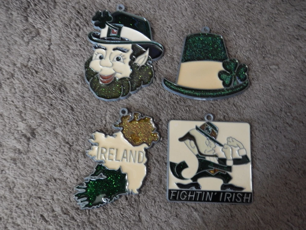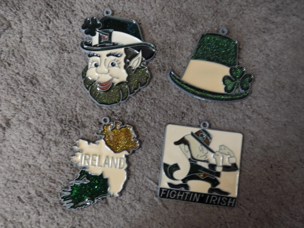 Add some vintage charm to your holiday decor with this set of four faux stained glass ornaments. These Irish-themed plastic sun catchers feature a lephrecaun, a lephrechaun hat, a map of Ireland, and a Notre Dame Fighting Irish ornament. all in less than 5 inches in height. The colorful multicolor designs are perfect for St. Patrick's Day or any occasion that calls for a touch of whimsy. Measuring at approx 4 inches in length, these medium-sized ornaments are sure to catch the eye of any visitor. Whether you're looking to decorate your home or add to your collection, these Irish-themed ornaments are a must-have. Celebrate the holiday season in style with these charming faux stained glass ornaments. THESE ORNAMENTS ARE IN EXCELLENT CONDITION, NO CHIPS, CRACKS, OR BREAKS. THEY ARE ALL GLITTERED IN SPOTS. THEY MEASURE BETWEEN 3'' AND 4'' IN LENGTH AND WIDTH. NICE GROUPING MESSAGE ANY OTHER QUESTIONS AND THANKS FOR LOOKING