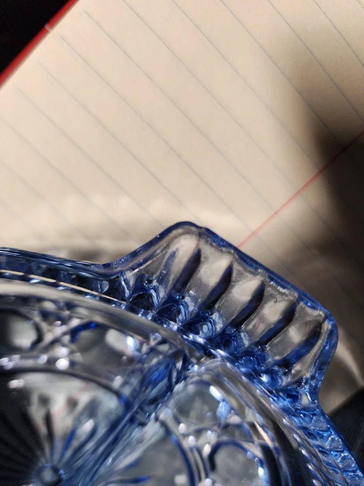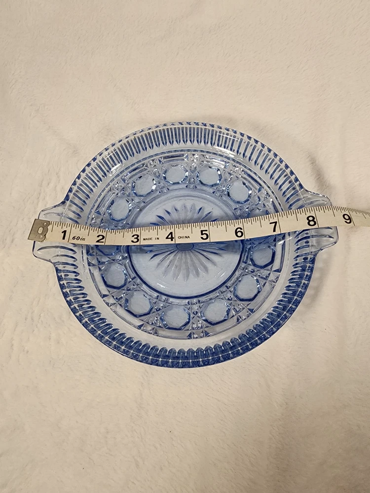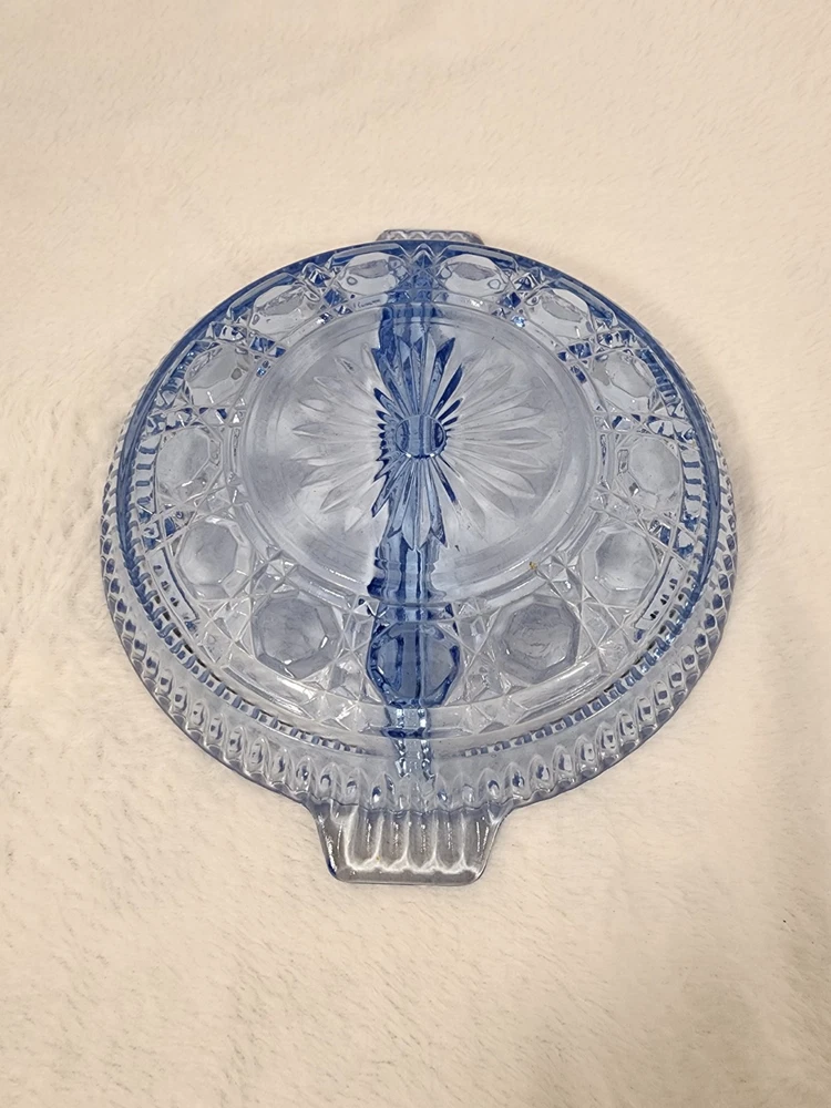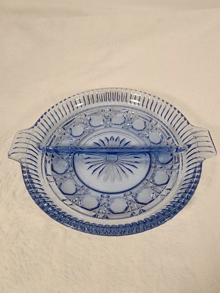 Enhance your serving collection with the classic elegance of the Federal Glass Windsor blue glass divided relish candy dish. This round piece, measuring 8.5 inches in length and 1 inch in depth, is a testament to timeless design, featuring an all-over pattern that catches the eye. Its two compartments allow for a neat presentation of your sweets or condiments, making it a practical addition to any table setting. Crafted in the United States during the 1970s, this original, pressed glass dish reflects the quality and style of the era. With a glossy finish and a color that's as vibrant today as it was back then, this dish is a beautiful piece for both use and display. Please note, to maintain its vintage beauty, hand washing is recommended for this item. please note the last pic for condition. tiny chip on handle.