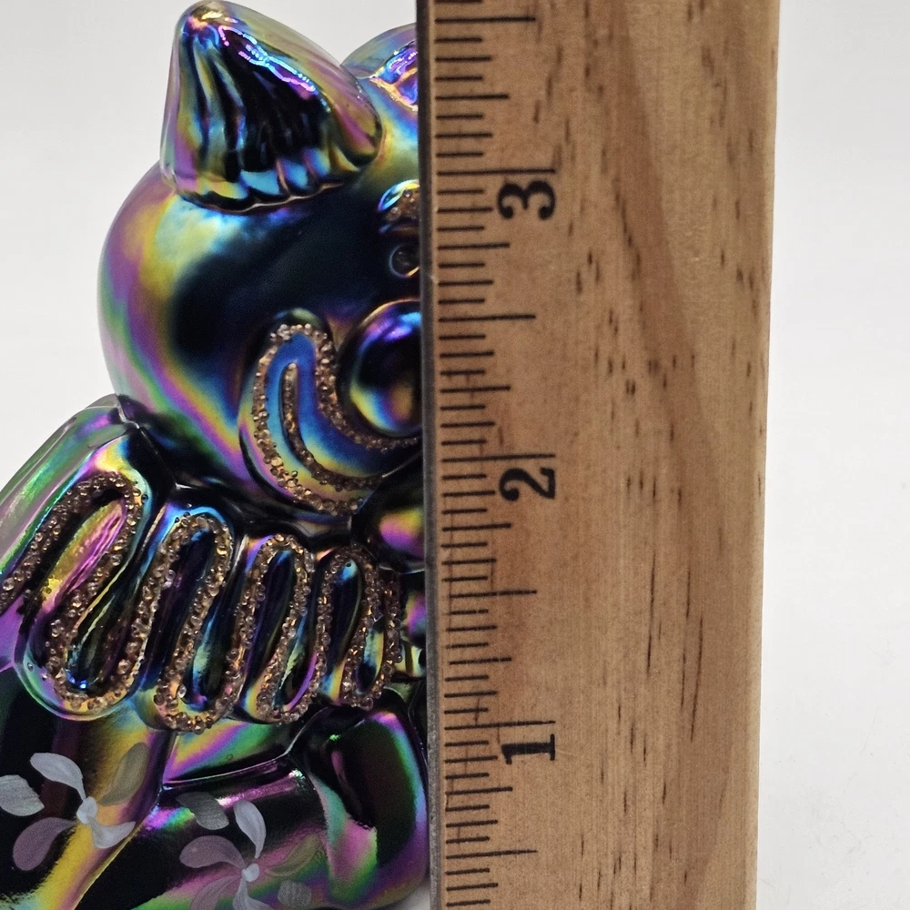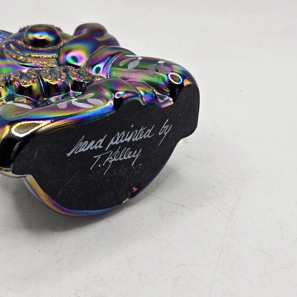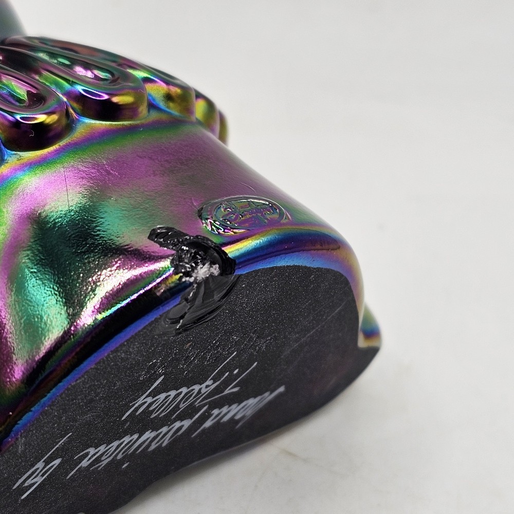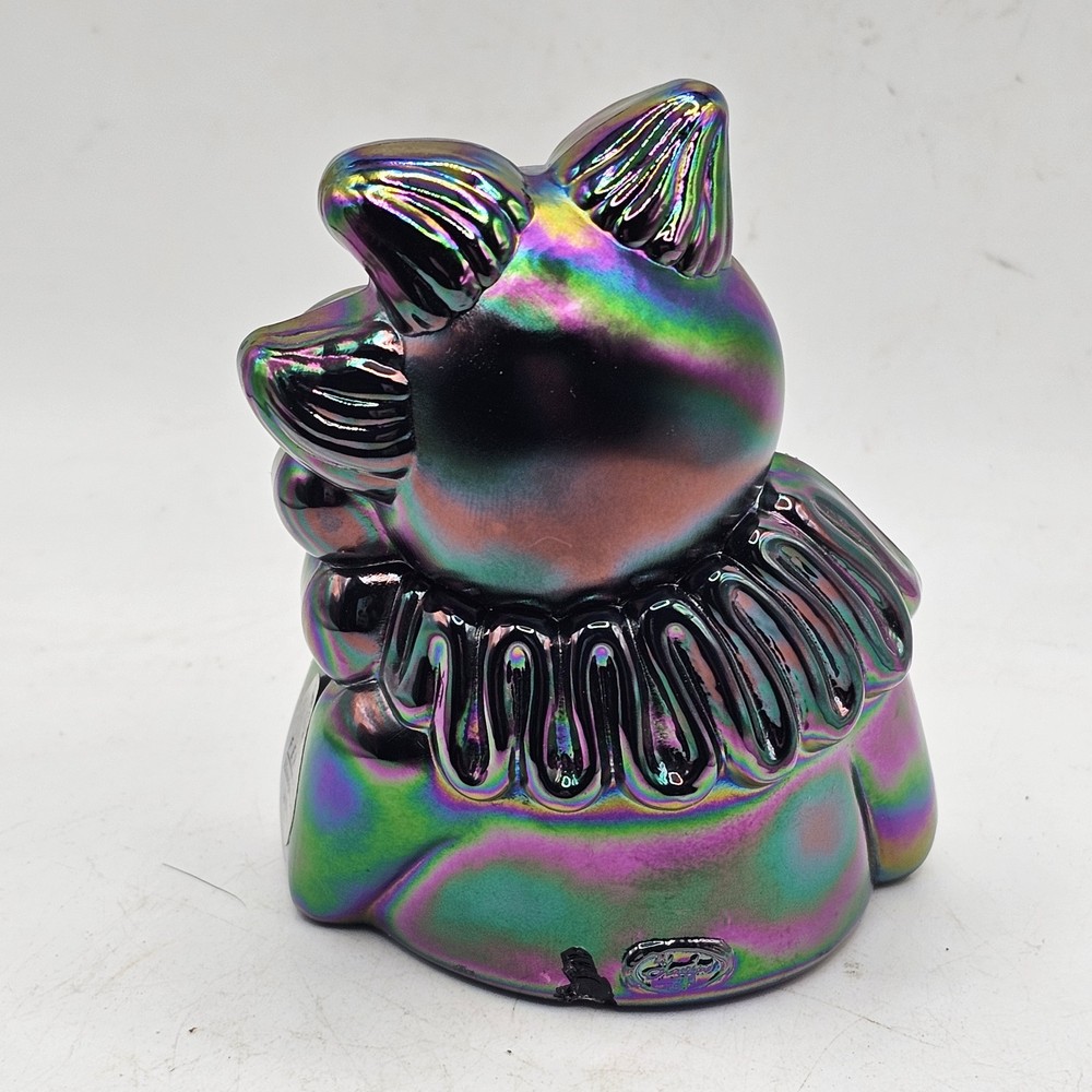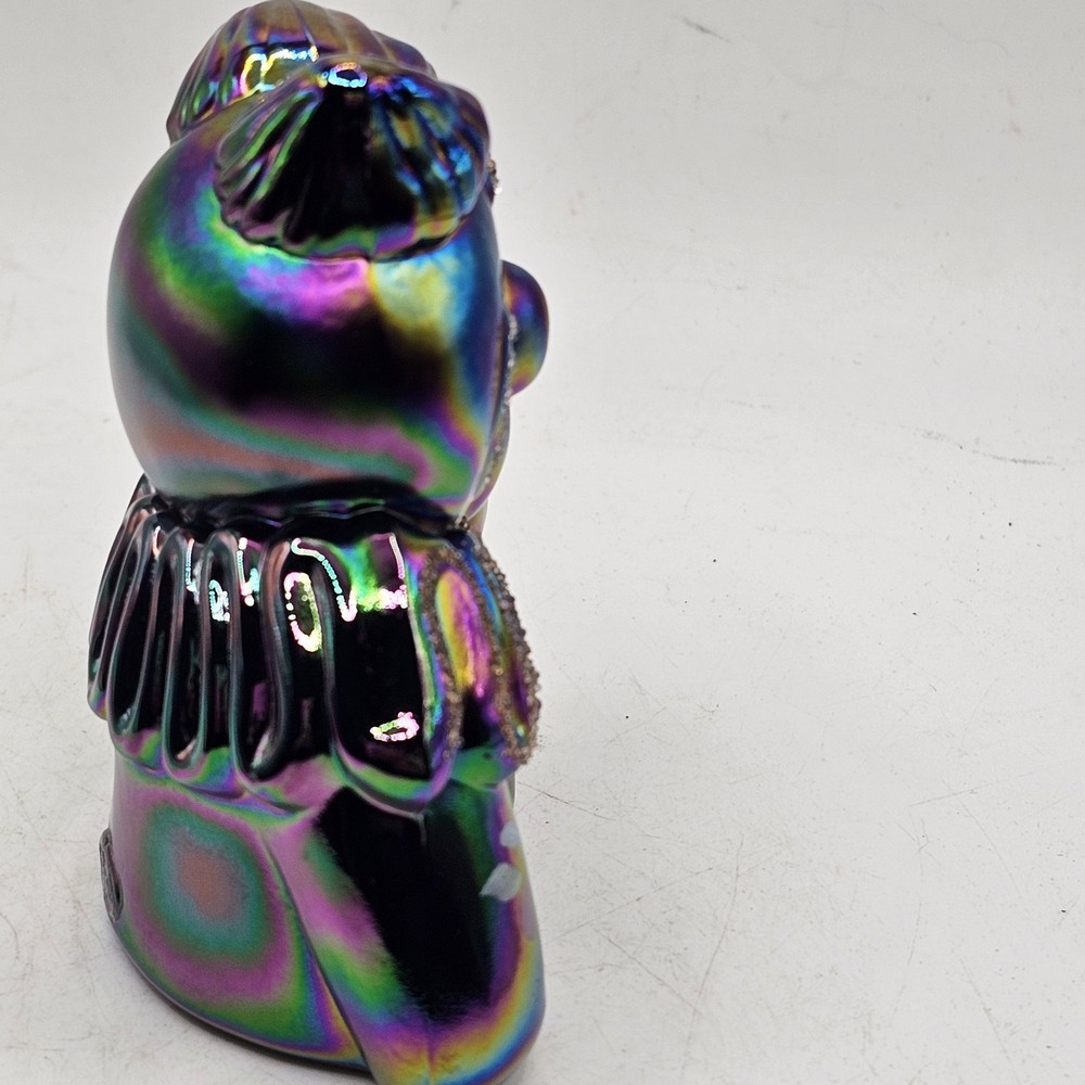 The Fenton Clown Amethyst Purple Blue Irredescent Glass Figurine is a handpainted decorative piece made of glass. Featuring a vibrant purple color with a blue irredescent finish, this figurine showcases a charming clown theme that adds a playful touch to any space. With the Fenton brand known for its quality craftsmanship, this unique piece is sure to be a standout addition to any collection of decorative pottery and glassware. There is a chip on the bottom back. See photos for imperfections sold as is